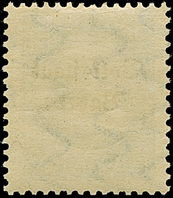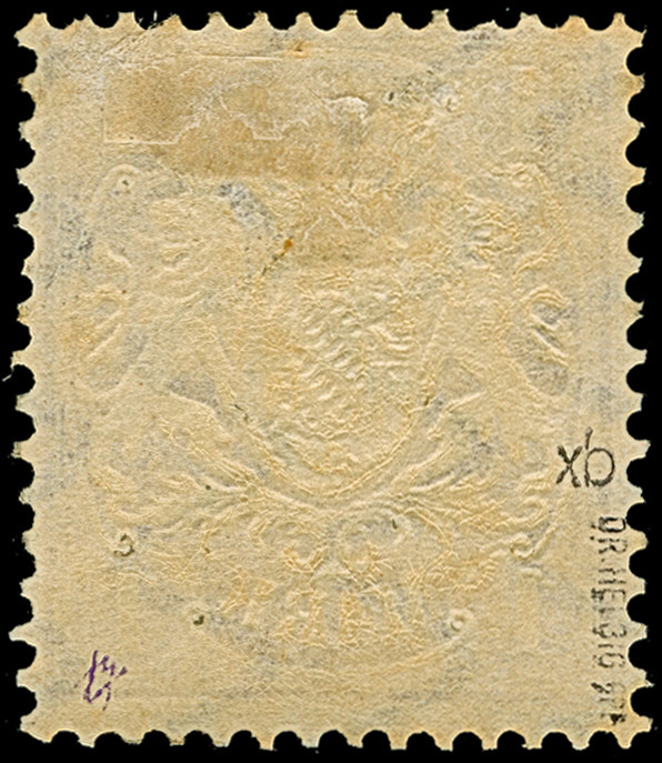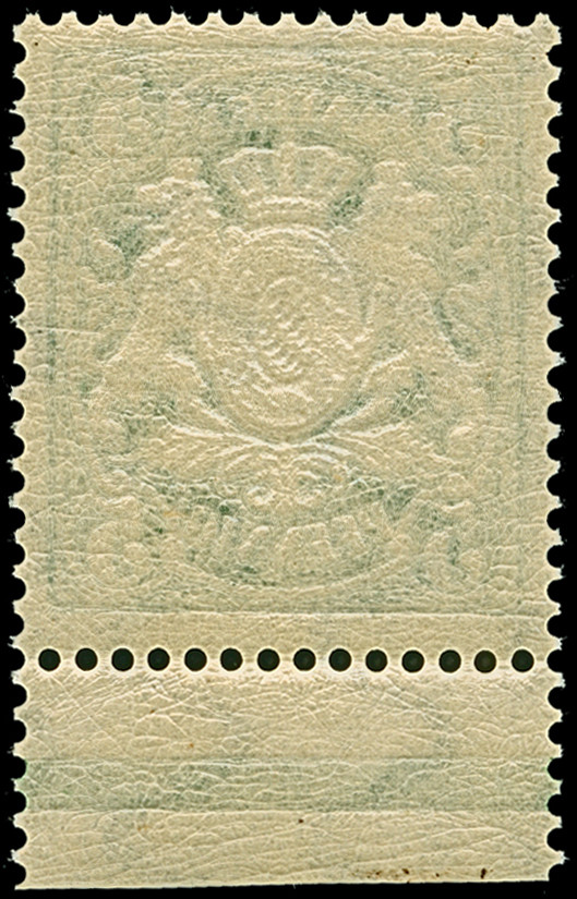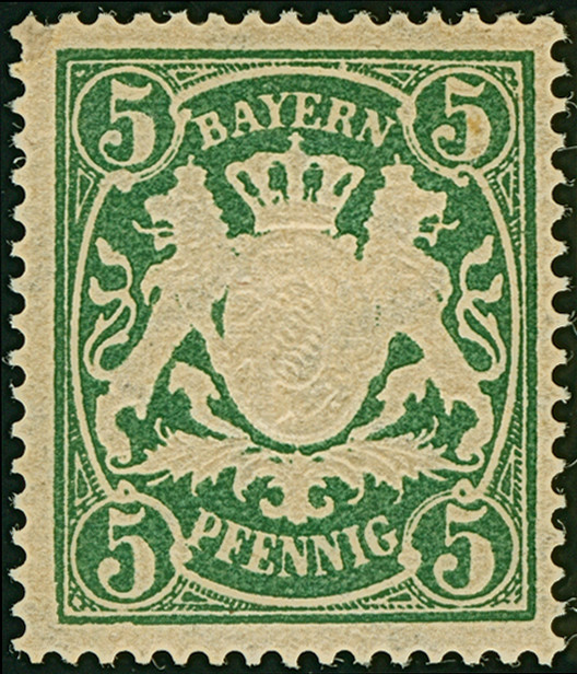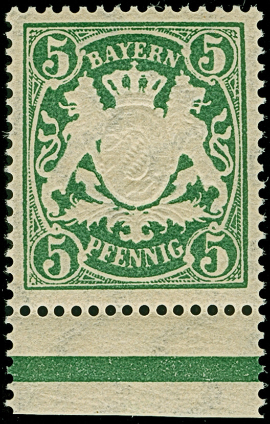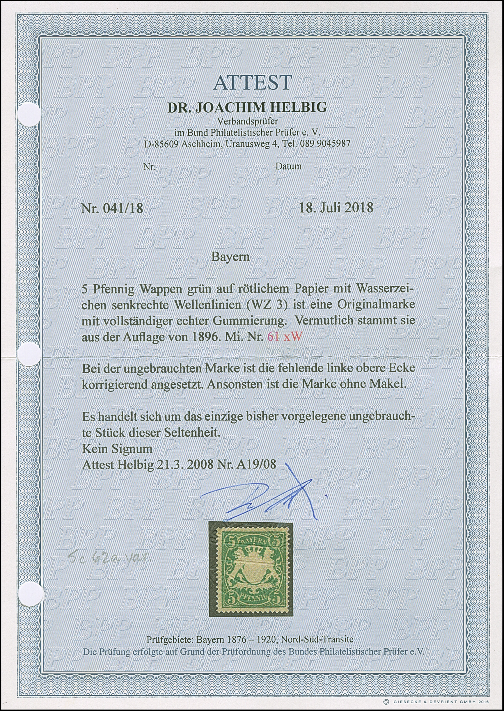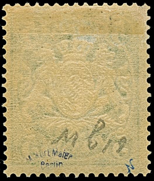 1890, Wappen 5 Pfg. grün auf rötlichem Papier mit Wasserzeichen 'senkrechte Wellenlinien' der Ausgabe 1881, ungebraucht. Der linke obere Eckzahn ergänzt, sonst einwandfrei. Laut Fotoattest Dr. Helbig BPP (2018) das einzig bisher registrierte ungebrauchte Stück dieser auch gestempelt äußerst seltenen Marke.