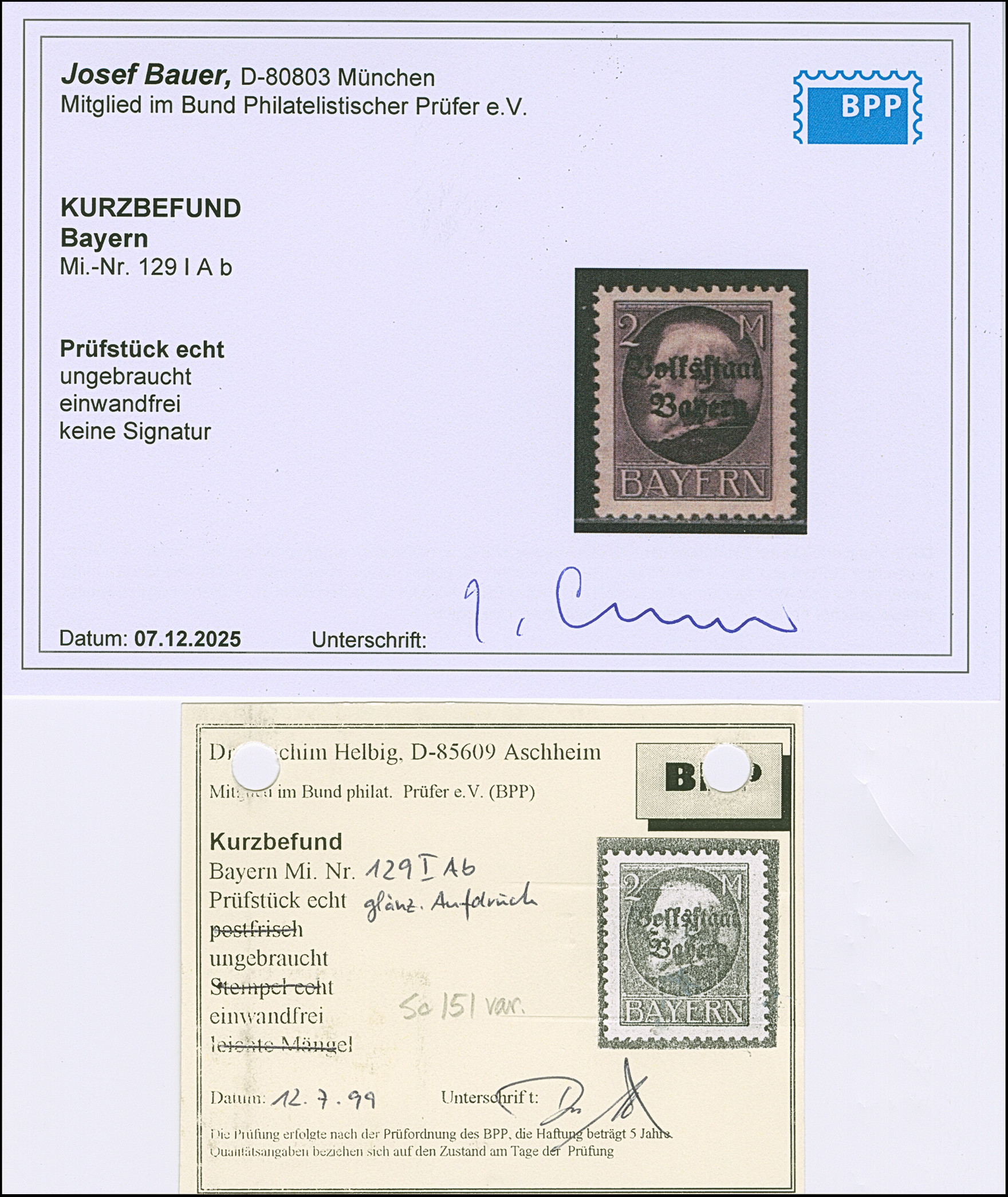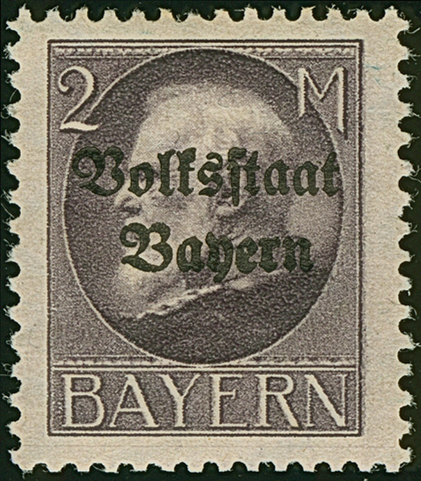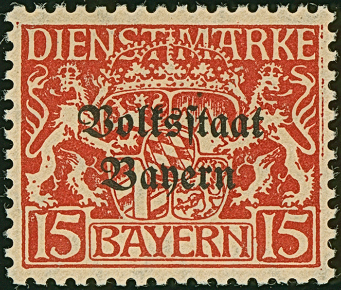 1919, Volksstaat 15 Pfg. auf mattgelblichorangen Papier, Plattenfehler 'weisser Punkt zwischen Kopf und Schwanz des rechten Löwen', postfrisch, in tadelloser Erhaltung. Es sind nur ganz wenige Werte dieser Marke auf Restbeständen des Papieres für die Luitpold-Ausgabe registriert; in postfrischer Erhaltung haben wir kein weiteres Stück registriert. Fotoattest Bauer BPP (2025)