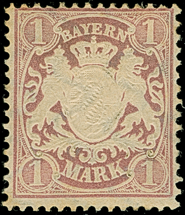 1 Mark braunpurpur, farbfrisch und, bis auf einen minimal verkürzten Zahn links oben, einwandfrei, ungebraucht mit Originalgummi. Eine äußerst seltene Marke. Fotoattest Dr. Helbig BPP (2018)