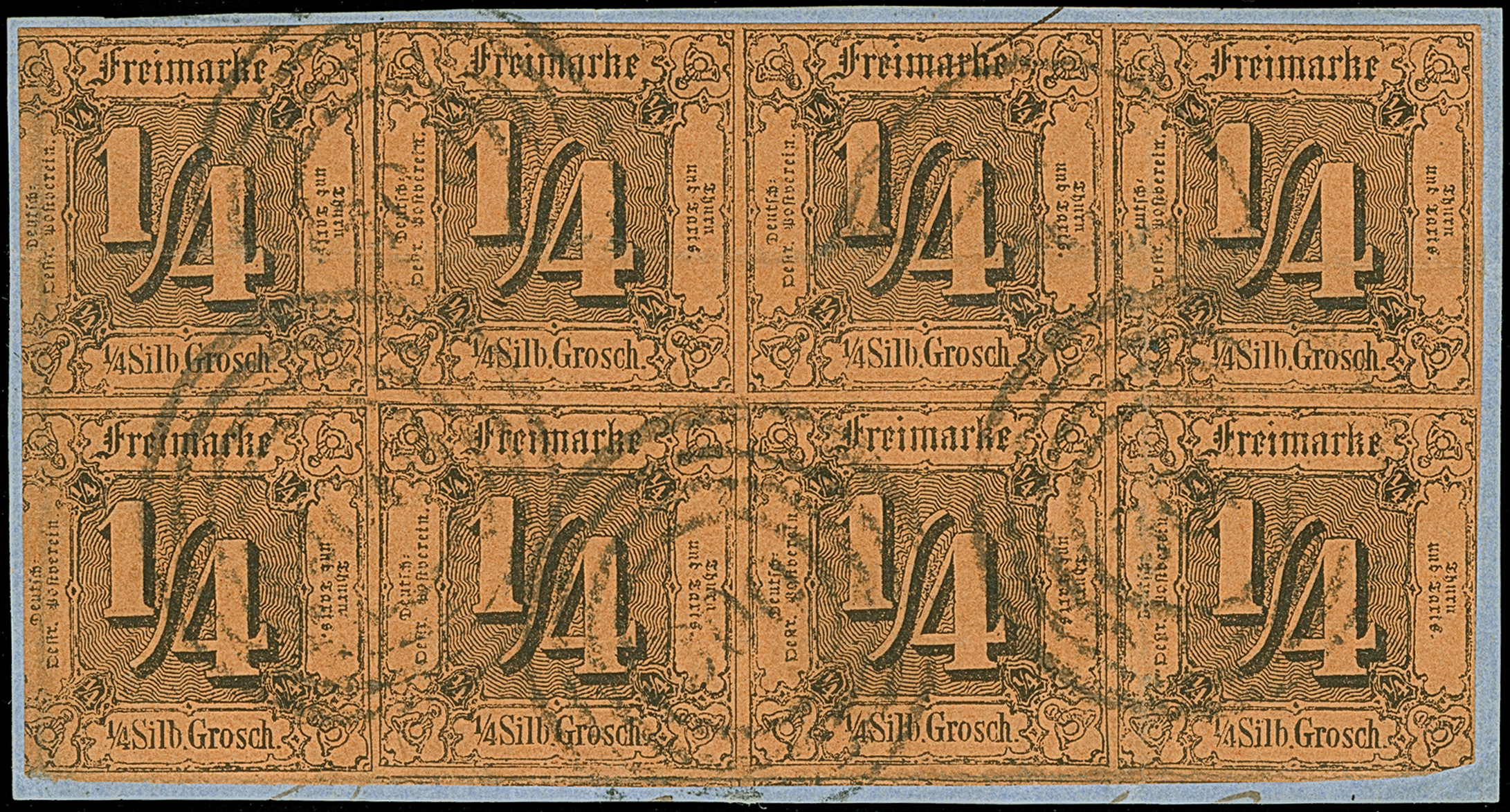 1852/58, Ziffernausgabe auf farbigem Papier, ¼ Silbergroschen schwarz auf dunkelbraunorange im waagerechten 8er-Block, farbfrisch, rechts unten und links berührt bzw. etwas angeschnitten, sonst voll- bis überrandig, unten mit Teilen von 3 Nachbarmarken, mit mehrfach leicht aufgesetztem Nummernstempel "300" HAMBURG auf Briefstück. Die rechte obere Marke mit Vortrennschnitt ins Markenbild reichend, ein waagerechter und zwei senkrechte Büge geglättet (optisch kaum störend). Zweitgrößte von Profi registrierte gebrauchte Einheit dieser Marke und als solche Unikat. Fotoattest Sem BPP (2019)