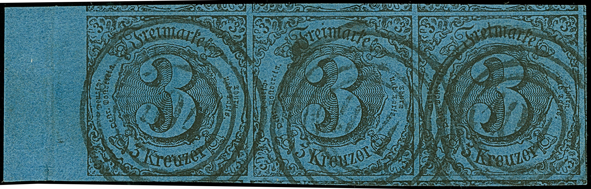 3 Kreuzer auf dunkelblau, waagerechter Dreierstreifen, allseits überrandig, mit Teilen aller 8 Nachbarmarken und links ca. 11mm Bogenrand (dort unauffällige Faltspur), sauber entwertet durch Nr. "104" DARMSTADT. Ein seltener Streifen in tadelloser und außerordentlich schöner Erhaltung. Ein absolutes Ausnahmestück. Fotoattest Sem BPP (2014)