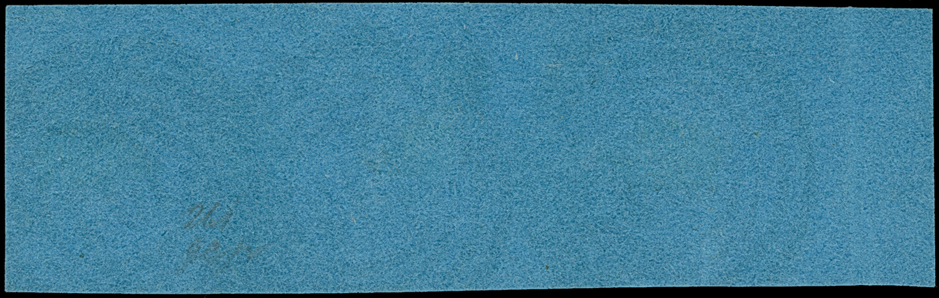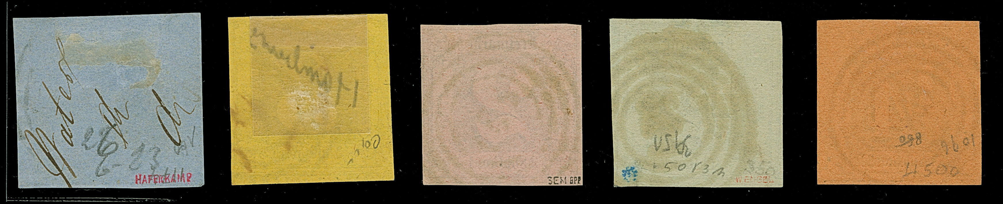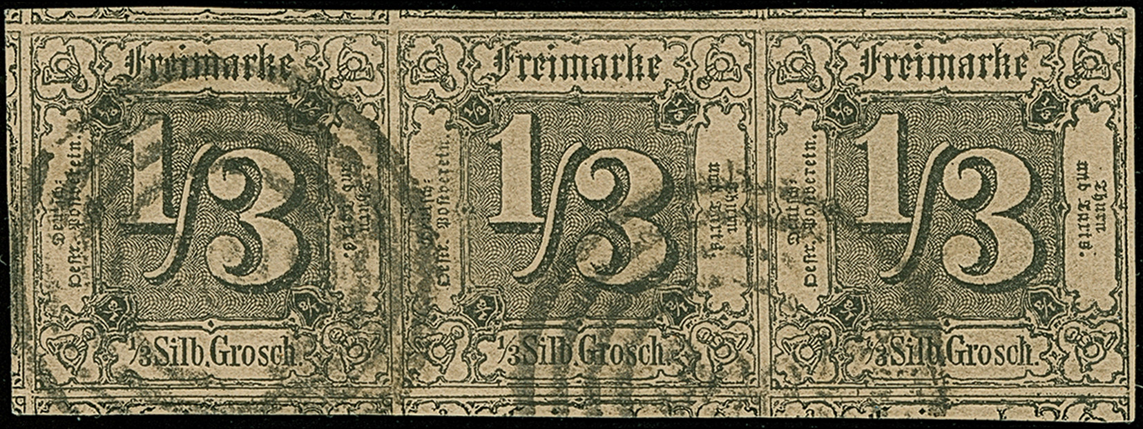 ⅓ Silbergroschen auf hellbraunocker, waagerechter 3er-Streifen, rechts breit- sonst allseits überrandig, mit Teilen von 9 Nachbarmarken, leicht entwertet durch Nummernstempel (wahrscheinlich "300" HAMBURG). Am Oberrand unauffällige waagerechte Bugspur, der linke Wert minimale Druckspur, sonst einwandfrei. Eine seltene und in dieser Schnittqualität ganz außergewöhnliche Einheit. Signiert Köhler, handschriftlicher Befund Ferchenbauer.