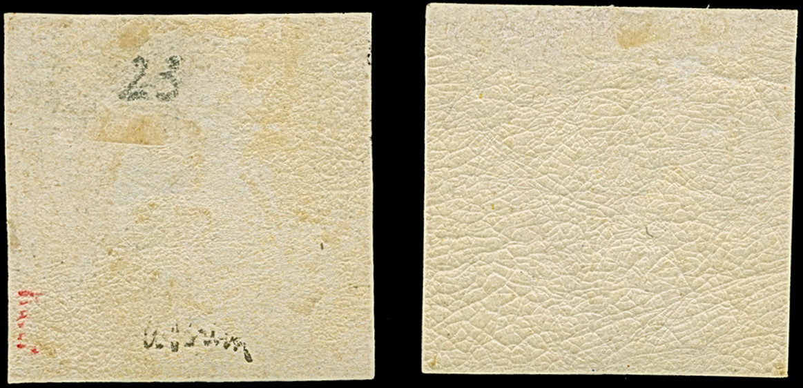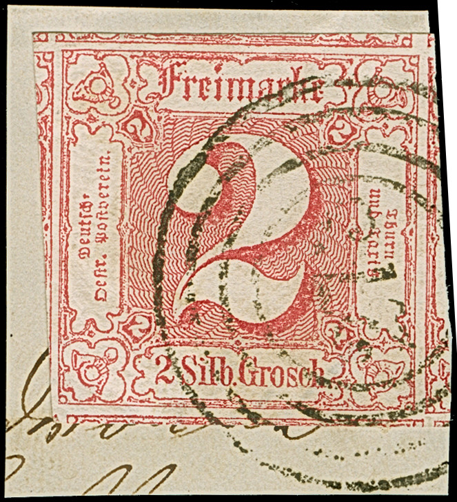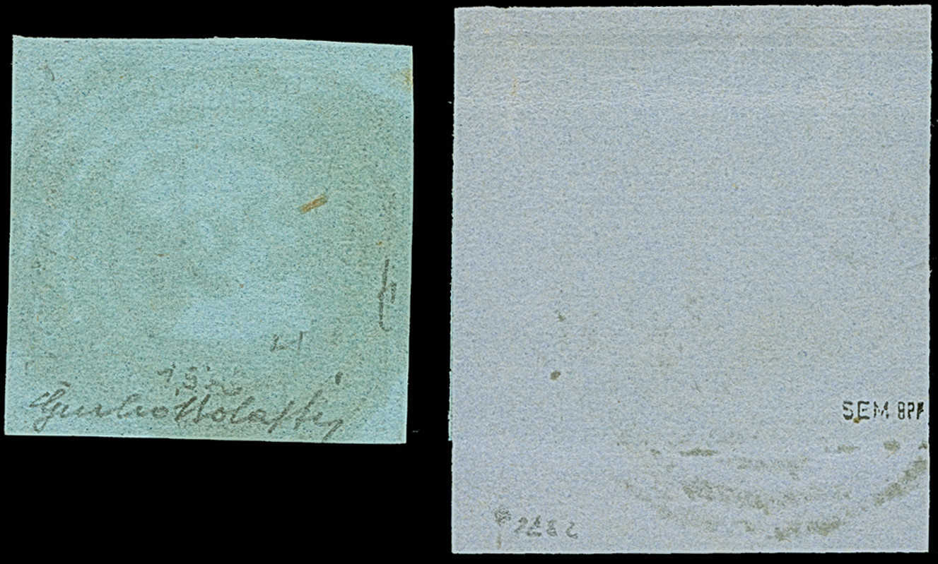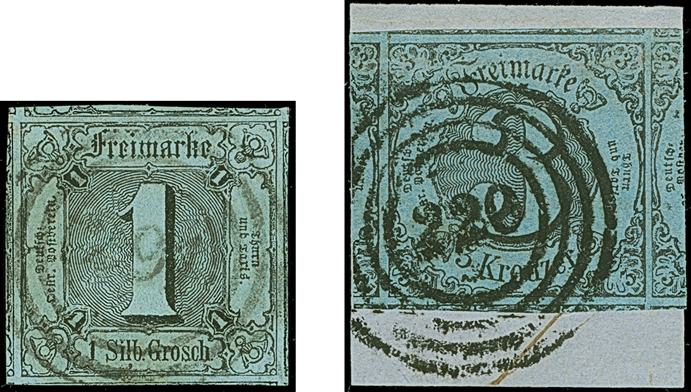1 Silbergroschen auf graublau und 3 Kreuzer auf mittelgrünlichblau, beide überrandig mit Teilen aller Nachbarmarken und ca. 9,5 bzw. 14 mm Bogenrand, die 3 Kreuzer aus der rechten unteren Bogenecke stammend. 3 Kreuzer senkrechte Bugspur nur im Bogenrand, sonst tadellos. Ein ganz außergewöhnliches Paar. Fotobefund bzw.-Attest Sem BPP (2014 bzw. 1999)