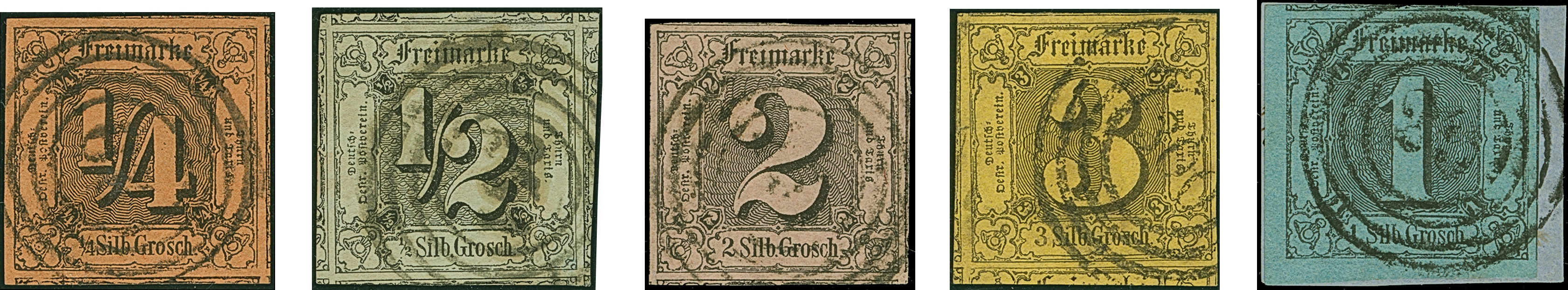 ¼, ½ , 2 und 3 Silbergroschen sowie Farbänderung 1 Silbergroschen auf hellblau, alle breit- bis meist überrandig, 2 Werte mit allen Nachbarmarken (sogenannte 'Kleine 9er-Blocks'), 1 Silbergroschen linke untere Bogenecke, alle sauber gestempelt, 1 Silbergroschen auf Briefstück. In dieser Schnittqualität ganz außergewöhnlich.