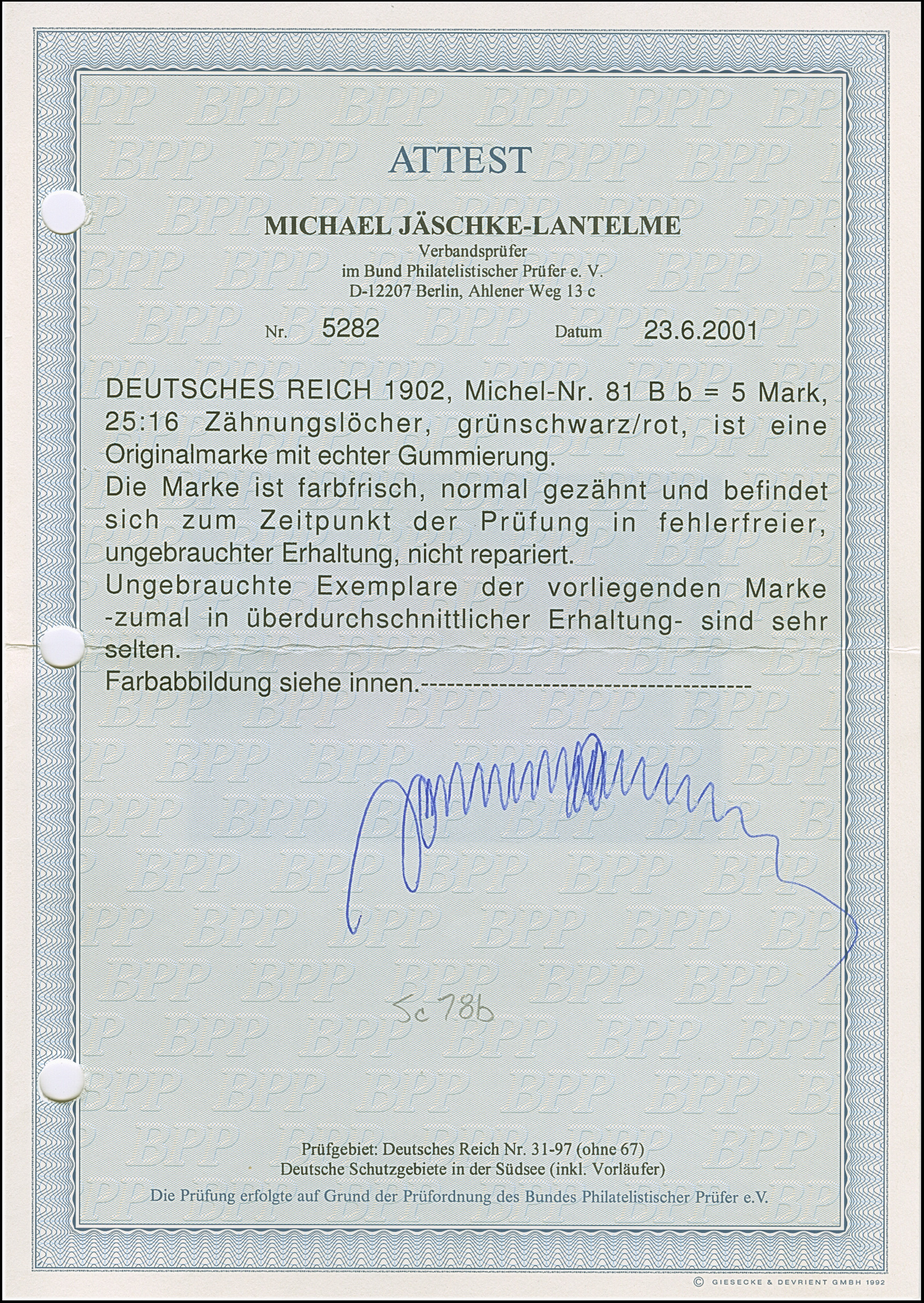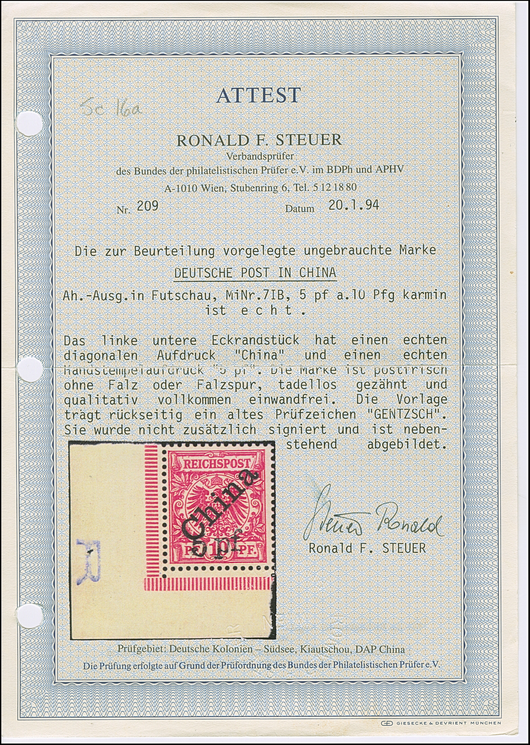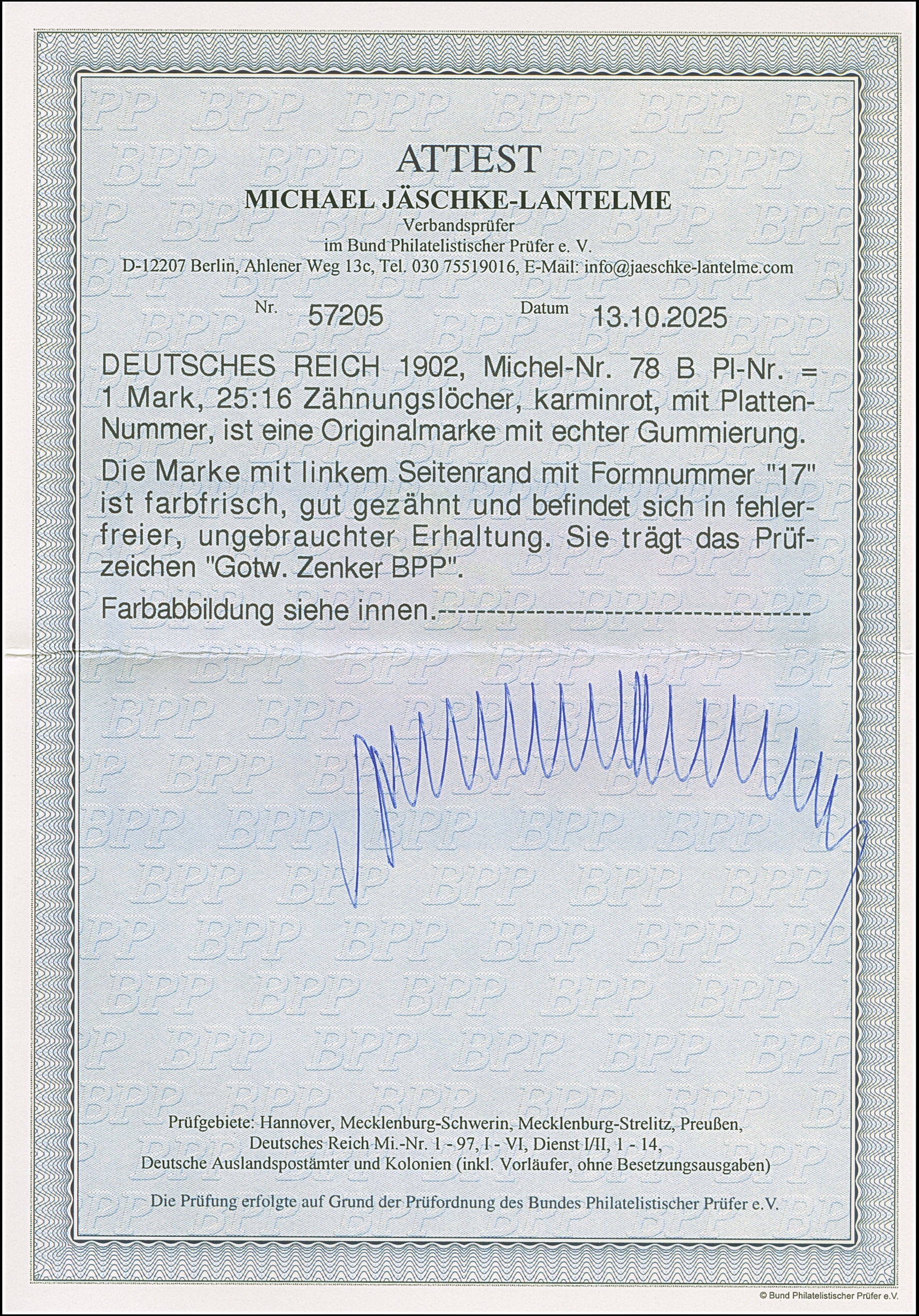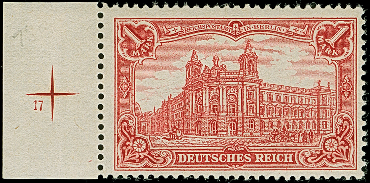1 M. karminrot, Zähnungslöcher 25 : 16, farbfrisch und gut gezähnt mit linkem Seitenrand mit der Formnummer “17”. Die ungebrauchte Marke ist in tadelloser Erhaltung, signiert Zenker und mit Fotoattesten APS (2001) und Jäschke-L. BPP (2025)