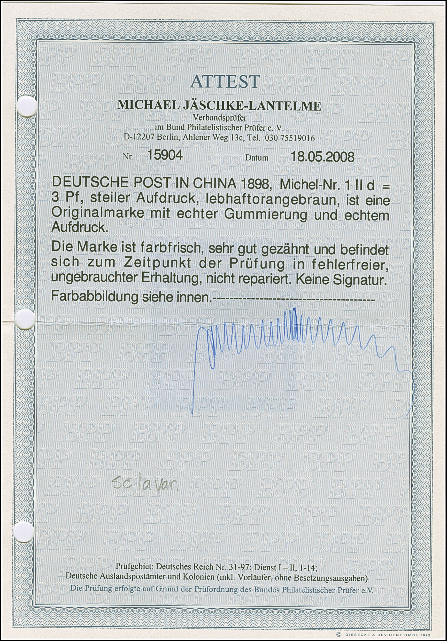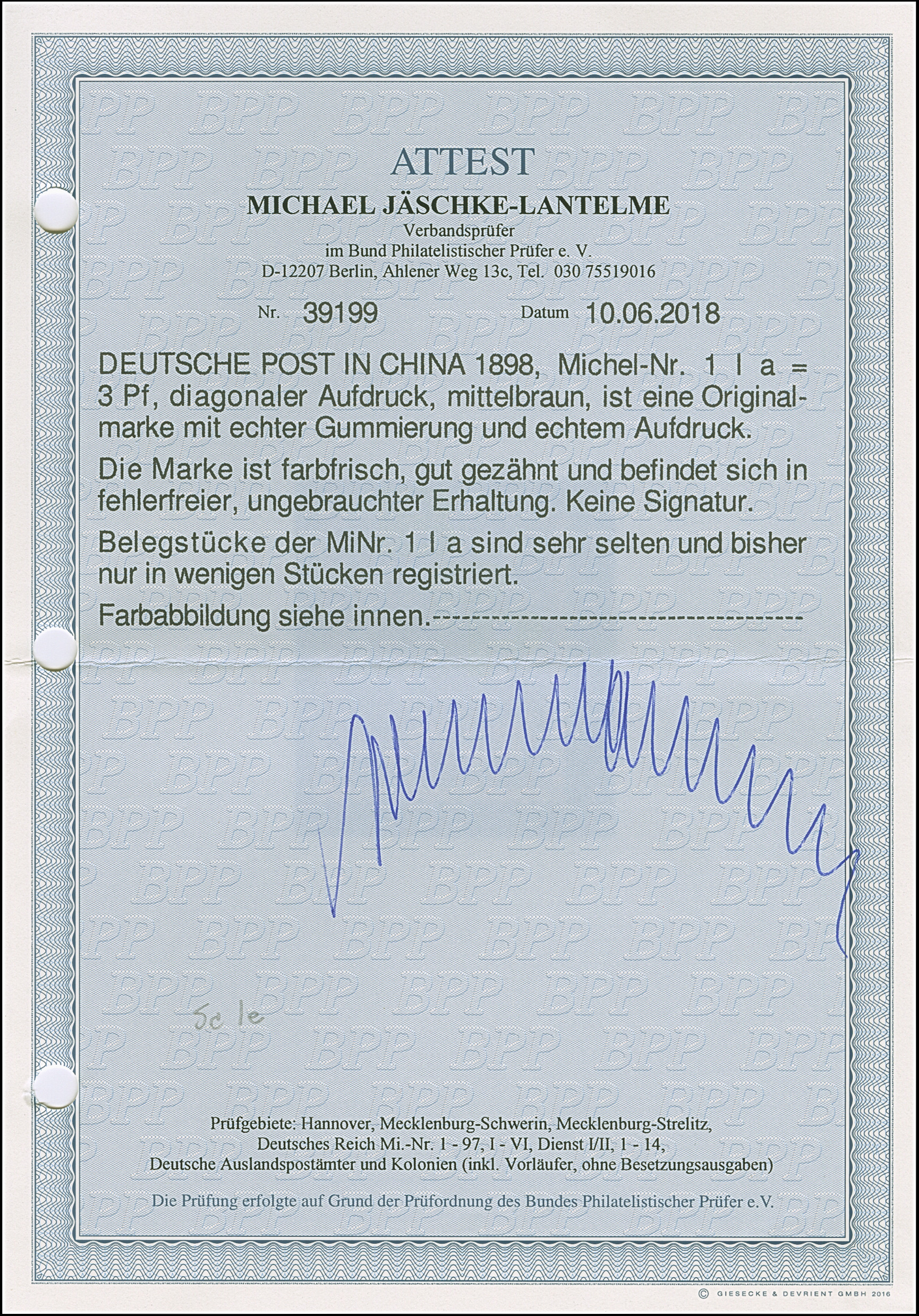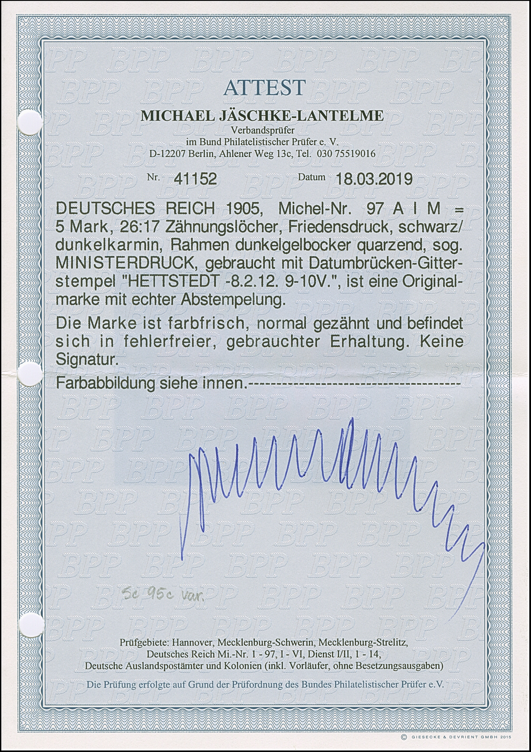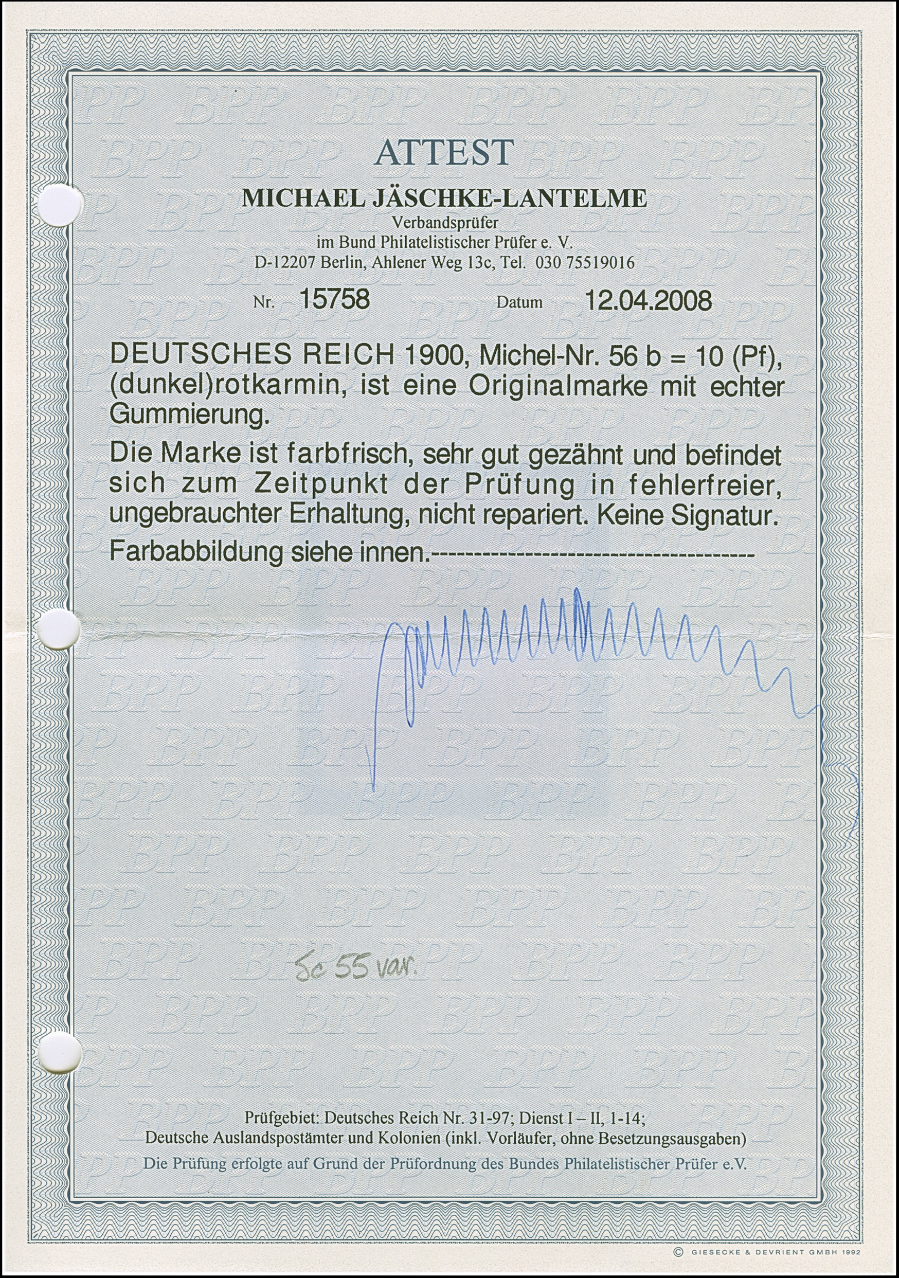 1 M. karminrot, Zähnungslöcher 25 : 16, farbfrisch und gut gezähnt mit linkem Seitenrand mit der Formnummer “17”. Die ungebrauchte Marke ist in tadelloser Erhaltung, signiert Zenker und mit Fotoattesten APS (2001) und Jäschke-L. BPP (2025)
