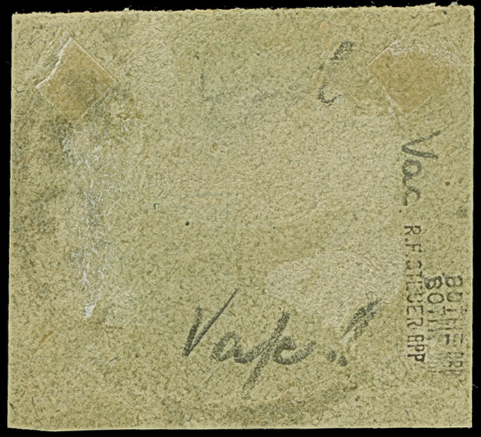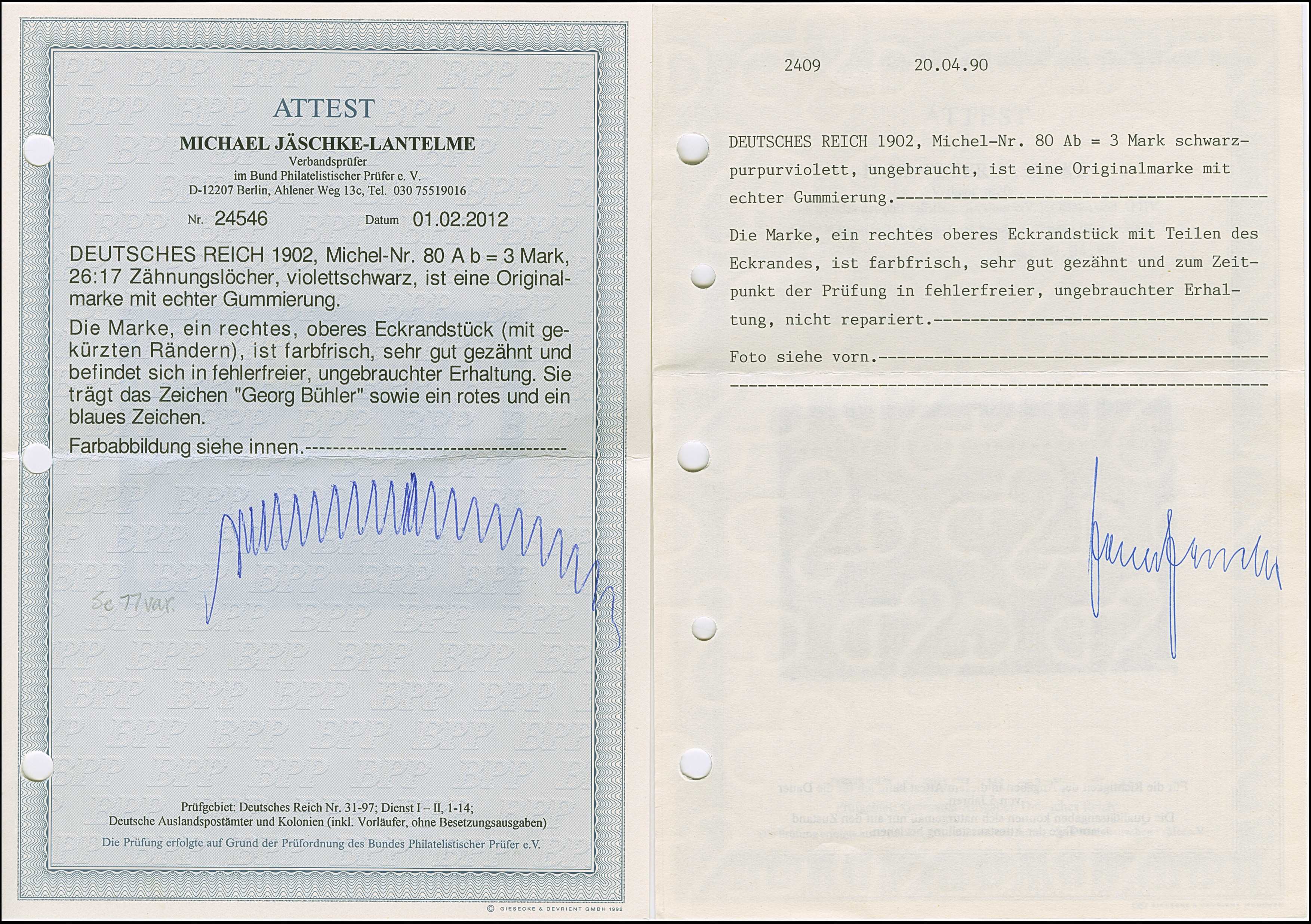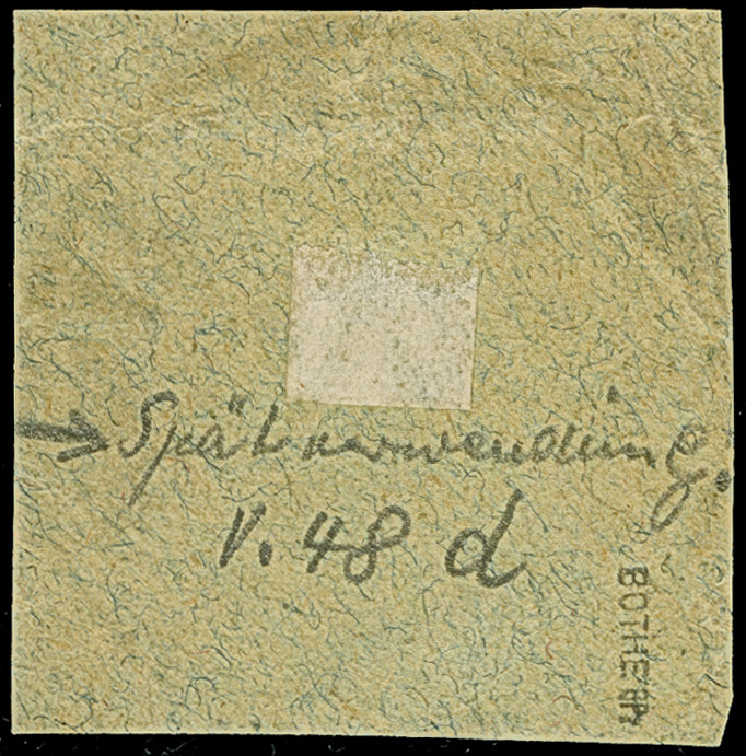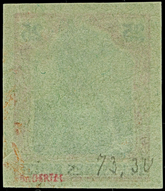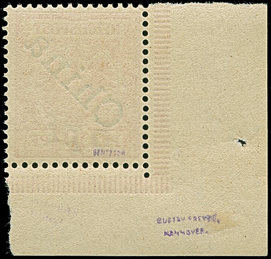 3 M. violettschwarz, Zähnungslöcher 25 : 17, aus der rechten oberen Bogenecke (Ränder gekürzt), ungebraucht und in tadelloser Erhaltung. Die farbfrische Marke ist in dieser Zähnungskombination ungebraucht eine sehr seltene Marke, Eigentümer-Signaturen und signiert Bühler sowie Fotoattest Jäschke BPP (1990) und Jäschke-L. BPP (2012)