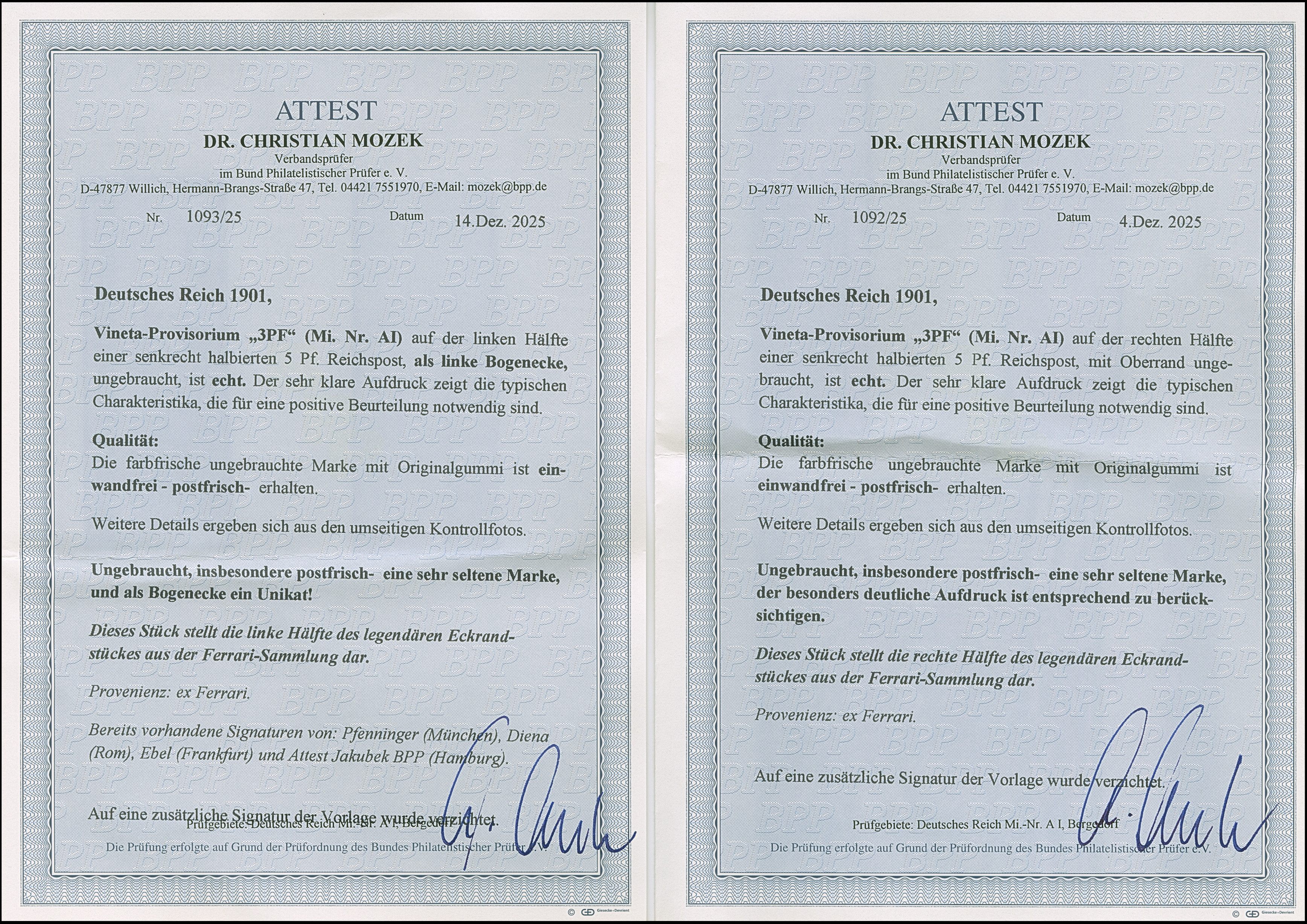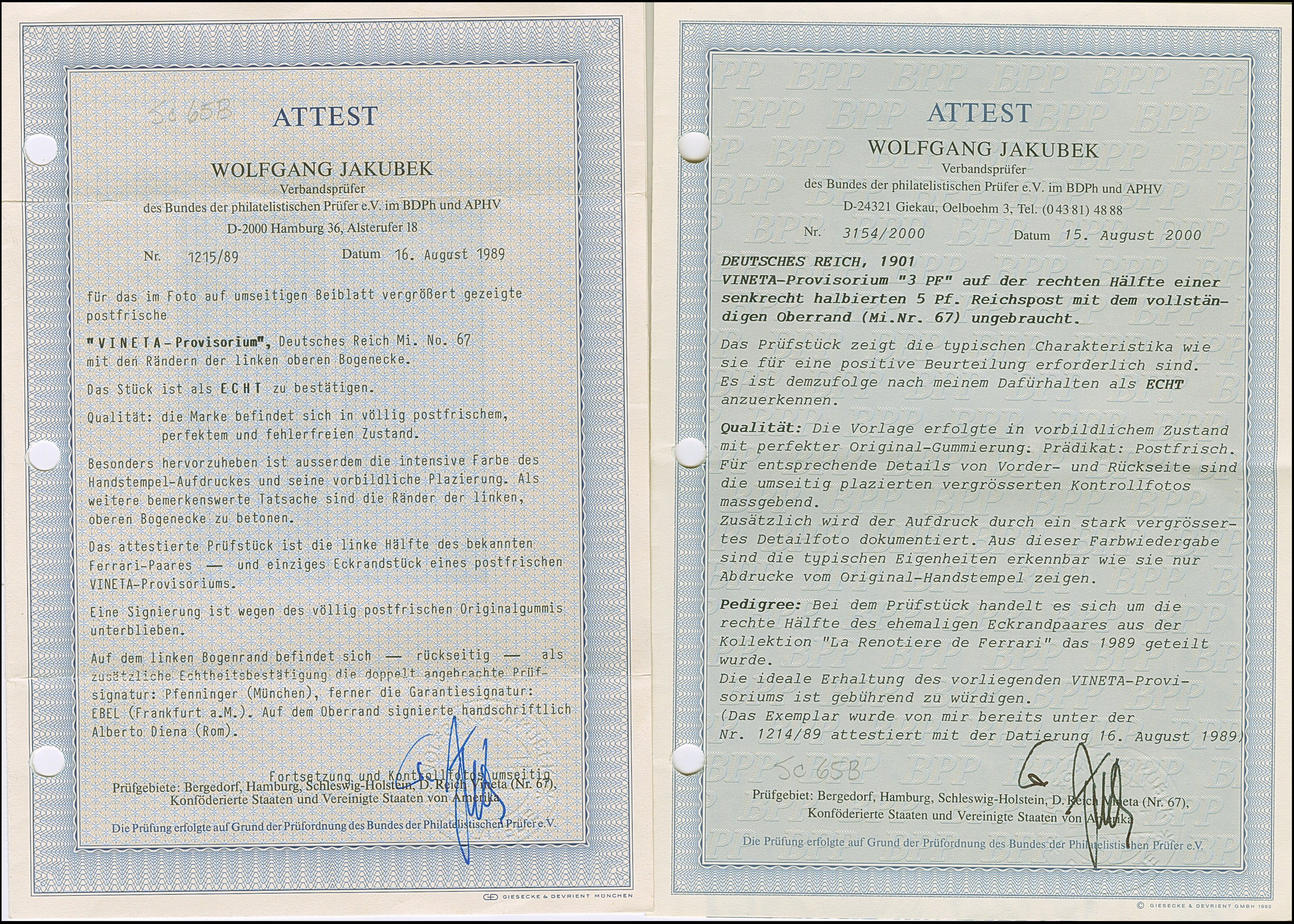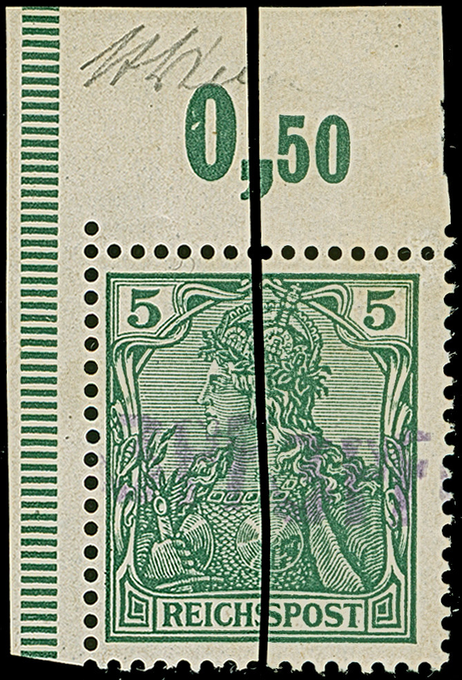 1900, Vineta-Provisorium 3 PF auf Germania Reichspost 5 Pfg. aus der linken oberen Bogenecke und zweites Stück mit Oberrand. Beide Marken sind in tadelloser postfrischer Erhaltung (oben weit im Bogenrand jeweils sauber entfalzt) und waren ehemals ein ungetrenntes Eckrandpaar. Das ursprüngliche Paar stammt aus der legendären Sammlung von Baron Philippe von Ferrari. Ein außergewöhnliches, einmaliges “Paar” und in dieser Art eine der ganz großen Seltenheiten des Deutschen Reichs. Beide Marken sind unsigniert, im Rand der linken Marke sind die Signaturen Ebel und Pfenninger und vorderseitig auf dem Oberrand eine handschriftlicher Signatur Alberto Diena sowie drei Fotoatteste Jakubek BPP (1989 bzw. 2000) und zwei Fotoatteste Dr. Mozek BPP (2025)