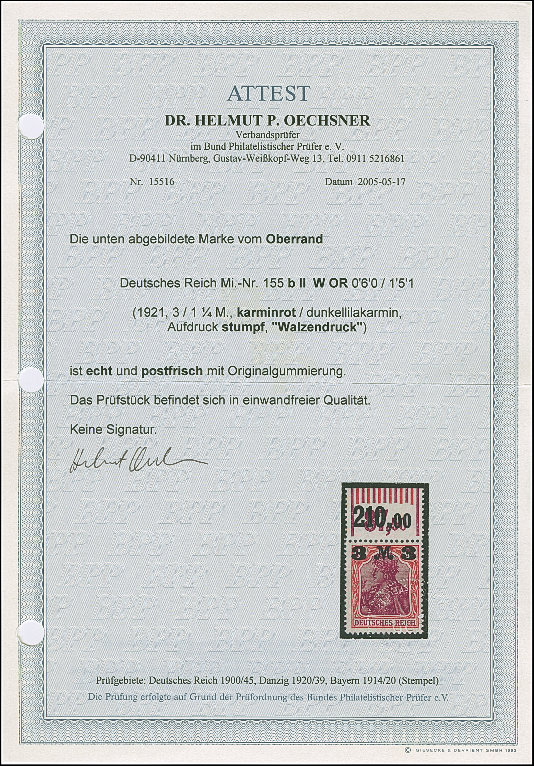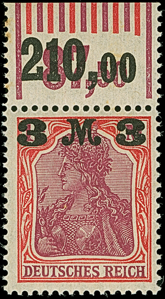 1921, Germania 3 M. auf 1¼ M. karminrot/dunkelkarminlila mit stumpfem Aufdruck, Walzendruck-Oberrandstück mit der Konfiguration “0'6'0 / 1'5'1”, postfrisch, in tadelloser Erhaltung. Ein sehr schönes Exemplar dieser seltenen Farbvariante mit Oberrand, unsigniert mit Fotoattest Oechsner BPP (2005)