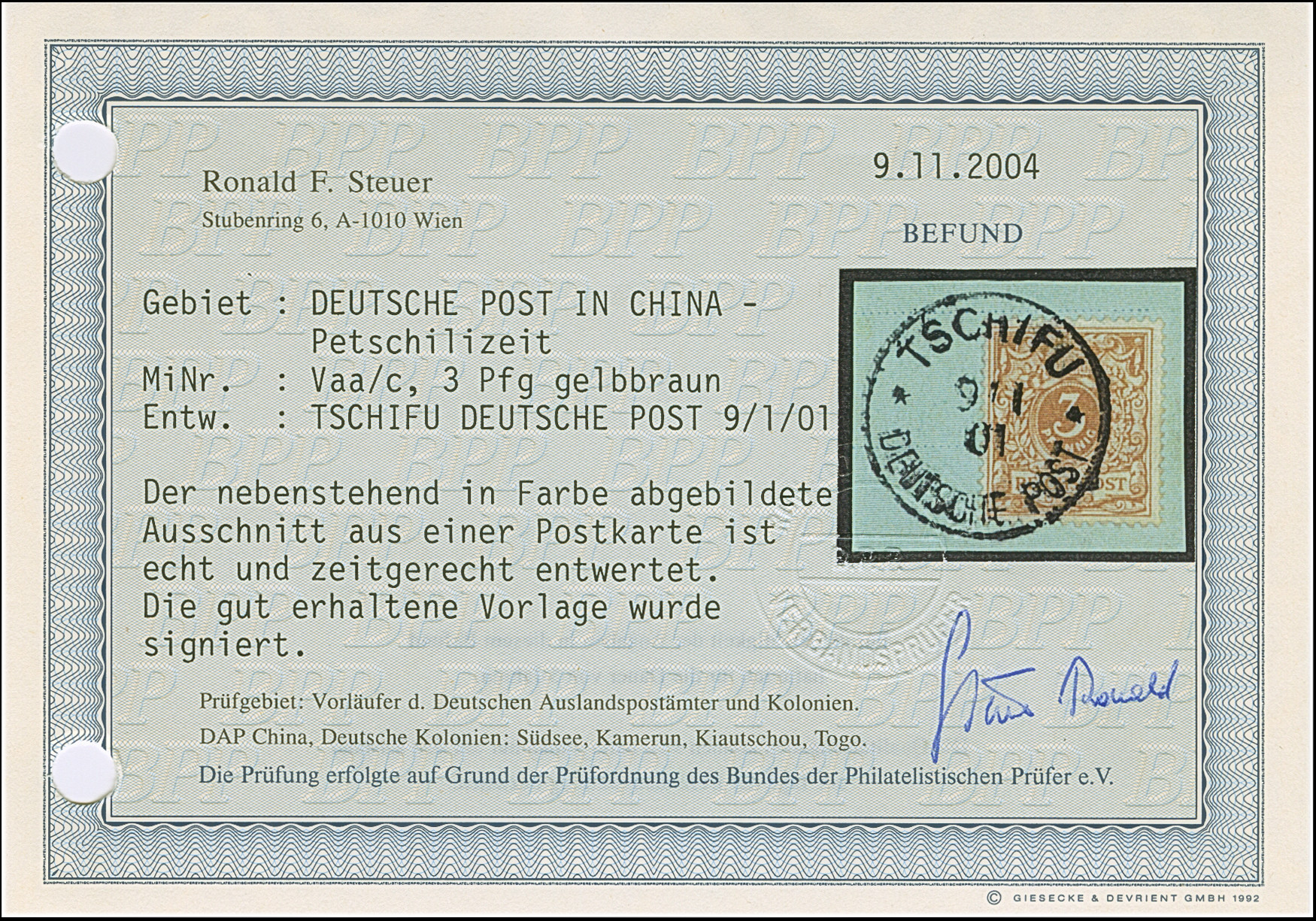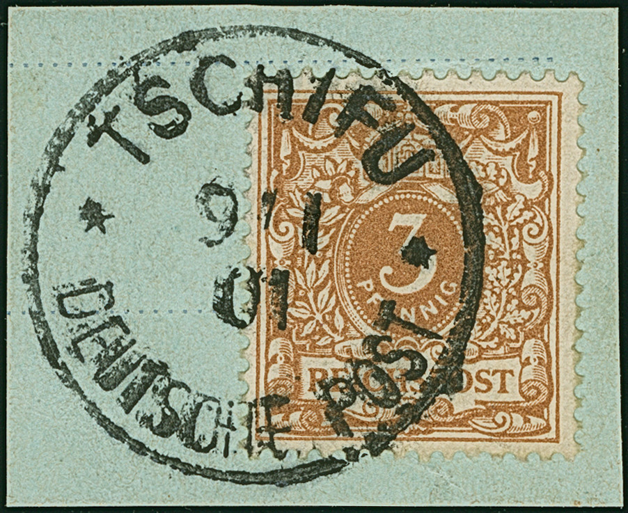 1900, Krone/Adler 3 Pfg. hellockerbraun mit Stempel “TSCHIFU DP 9.1.01” auf Briefstück in tadelloser Erhaltung. Die farbfrische Marke ist aus der Petschilizeit nicht häufig, doppelt signiert Mansfeld und signiert R. Steuer BPP mit Befund (2004)