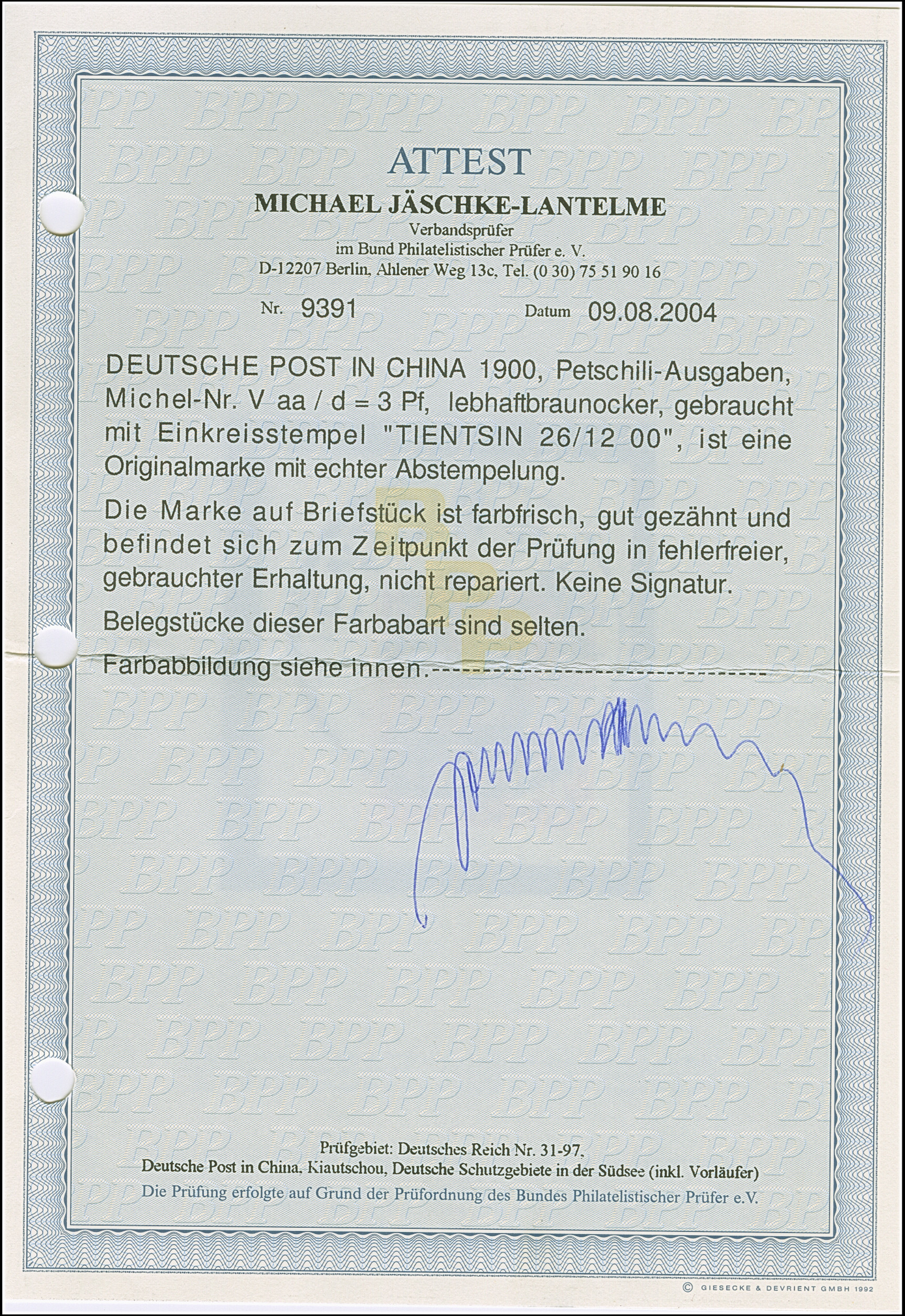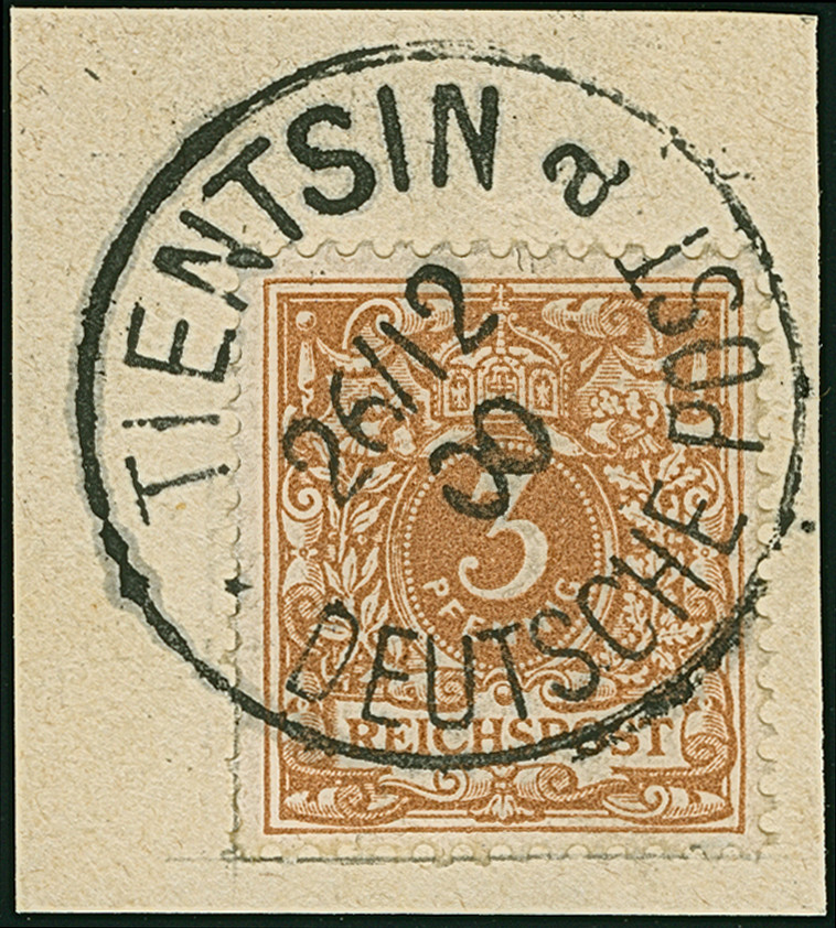 Krone/Adler 3 Pfg. lebhaftbraunocker mit klarem Stempel “TIENTSIN DP *a 26.12.00” auf Briefstück in tadelloser Erhaltung. Ein schönes Exemplar mit der besseren Farbvariante, Fotoattest Jäschke-L. BPP (2004)