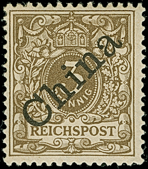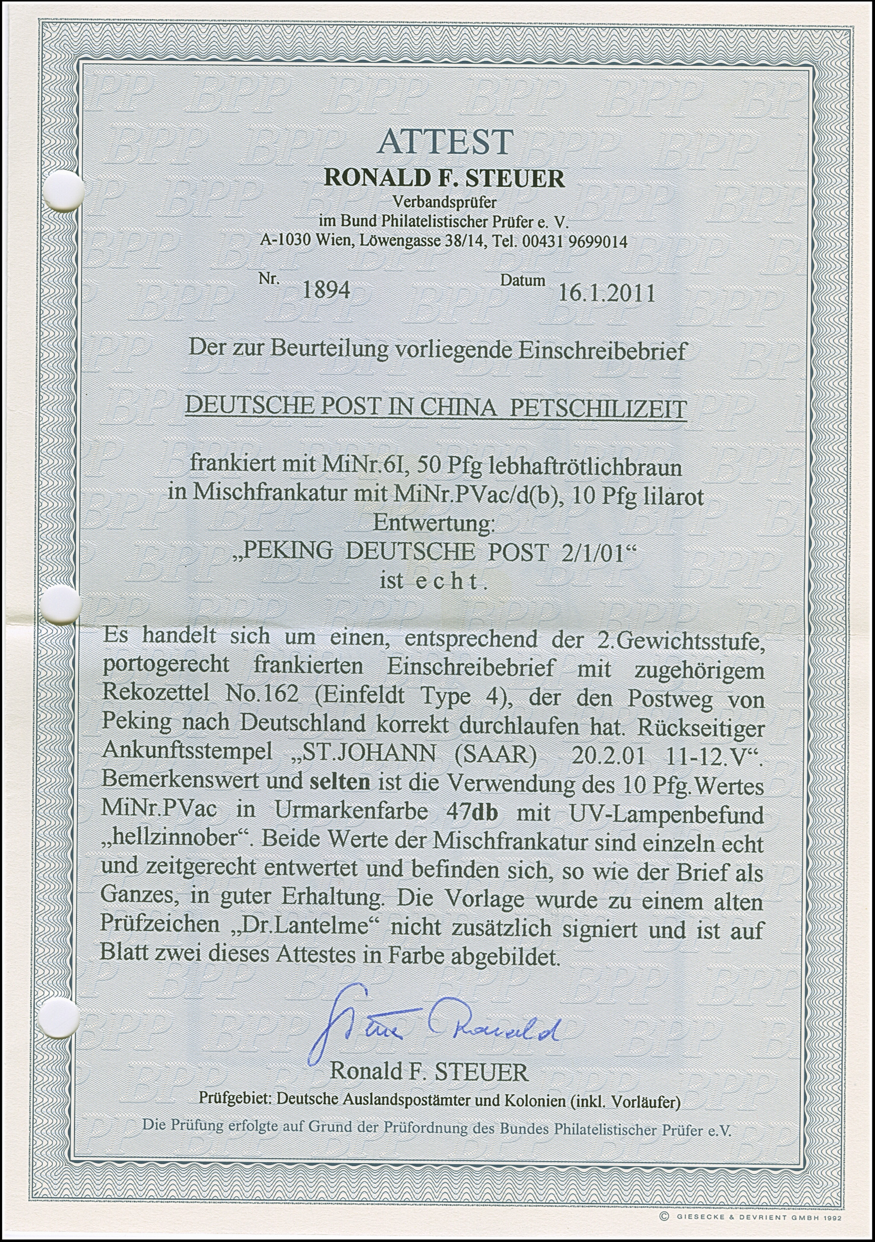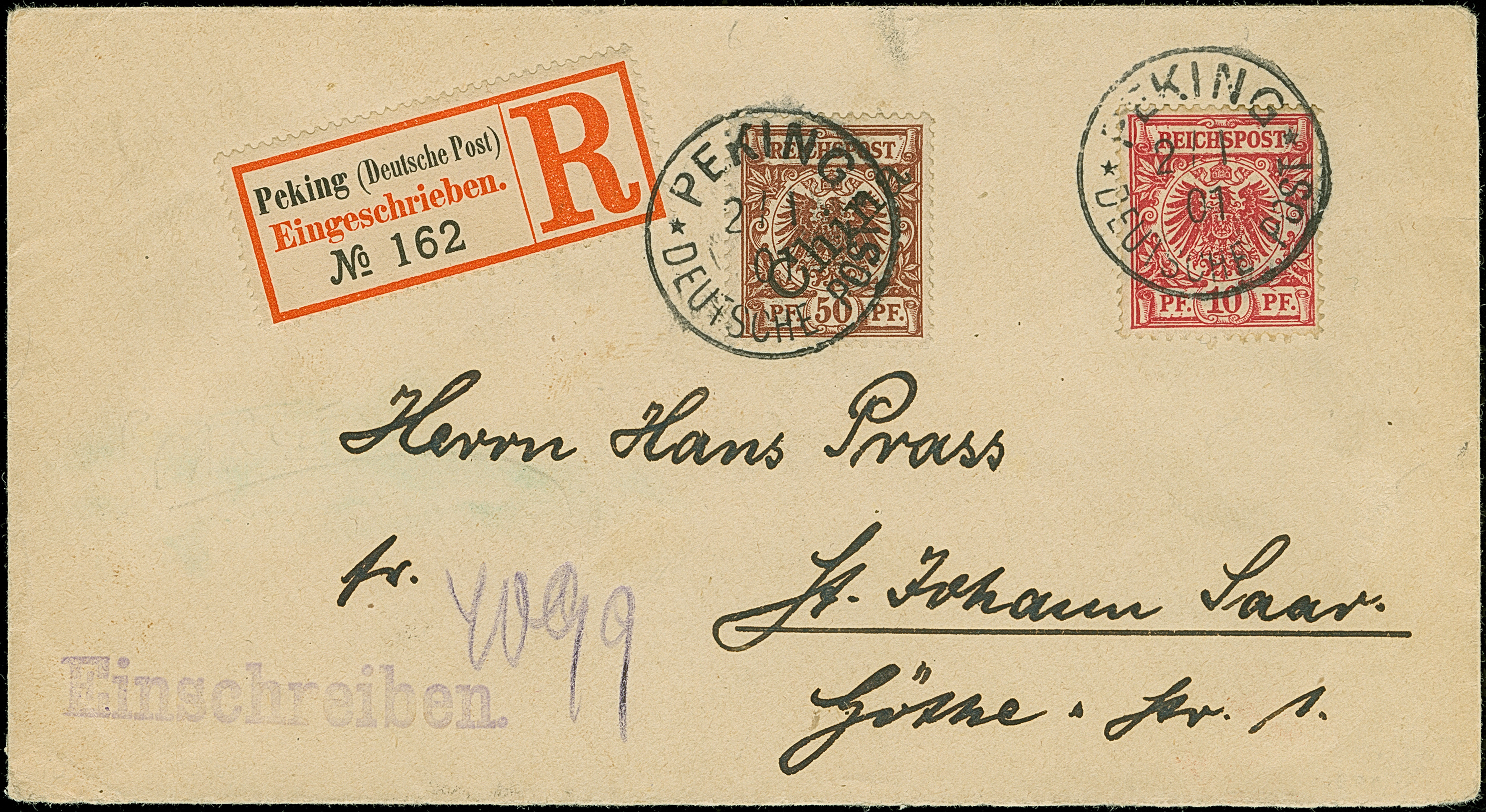 Krone/Adler 10 Pfg. lilarot (hellzinnober quarzend) in Mischfrankatur mit Diagonalaufdruck 50 Pfg. jeweils mit klarem EKr. “PEKING DP 2.1.01” als tarifgerechte Frankatur auf R-Brief der 2. Gewichtsstufe nach St. Johann mit Ankunftsstempel. Die farbfrischen Marken sind wie der Umschlag in einwandfreier Erhaltung. Eine dekorative und seltene Mischfrankatur mit der bisher bei China nicht gelisteten Farbvariante, signiert Dr. Lantelme und Fotoattest Jäschke-L. BPP (2011)