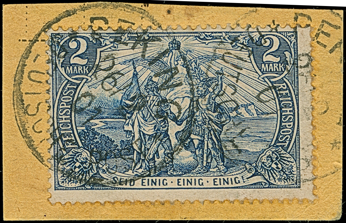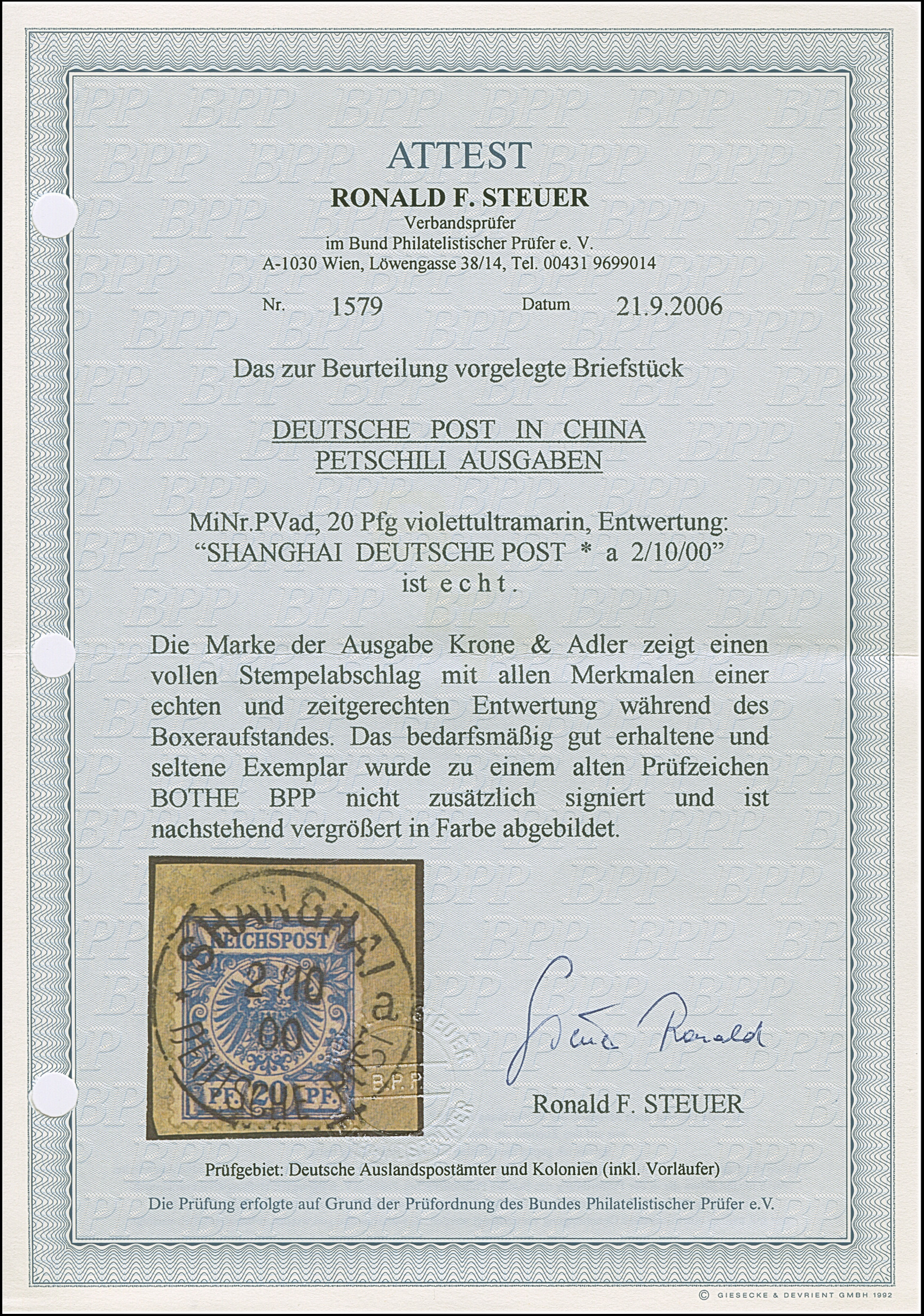 Krone/Adler 20 Pfg. violettultramarin mit klarem EKr. “SHANGHAI DP *a 2.10.00” auf Briefstück. Die farbfrische Marke hat kleine Gummiflecken in der Zähnung, ansonsten ist sie in einwandfreier Erhaltung, signiert Bothe BPP und Fotoattest R. Steuer BPP (2006)