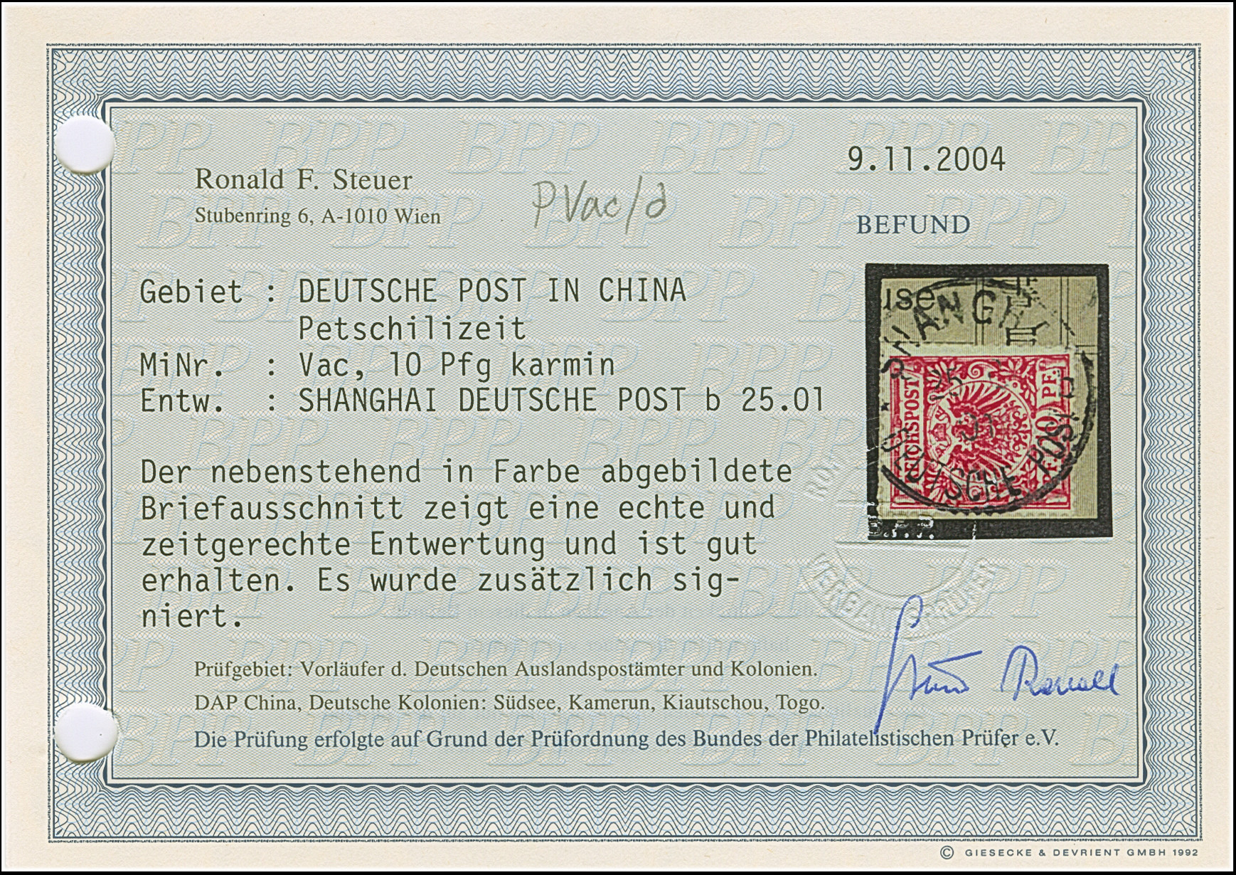Krone/Adler 10 Pfg. lebhaftlilarot, farbfrisch und gut gezähnt mit Stempel “SHANGHAI DP *b 25…01.” auf Briefstück in einwandfreier Erhaltung, doppelt signiert Bothe BPP und R. Steuer BPP mit Fotobefund (2004)