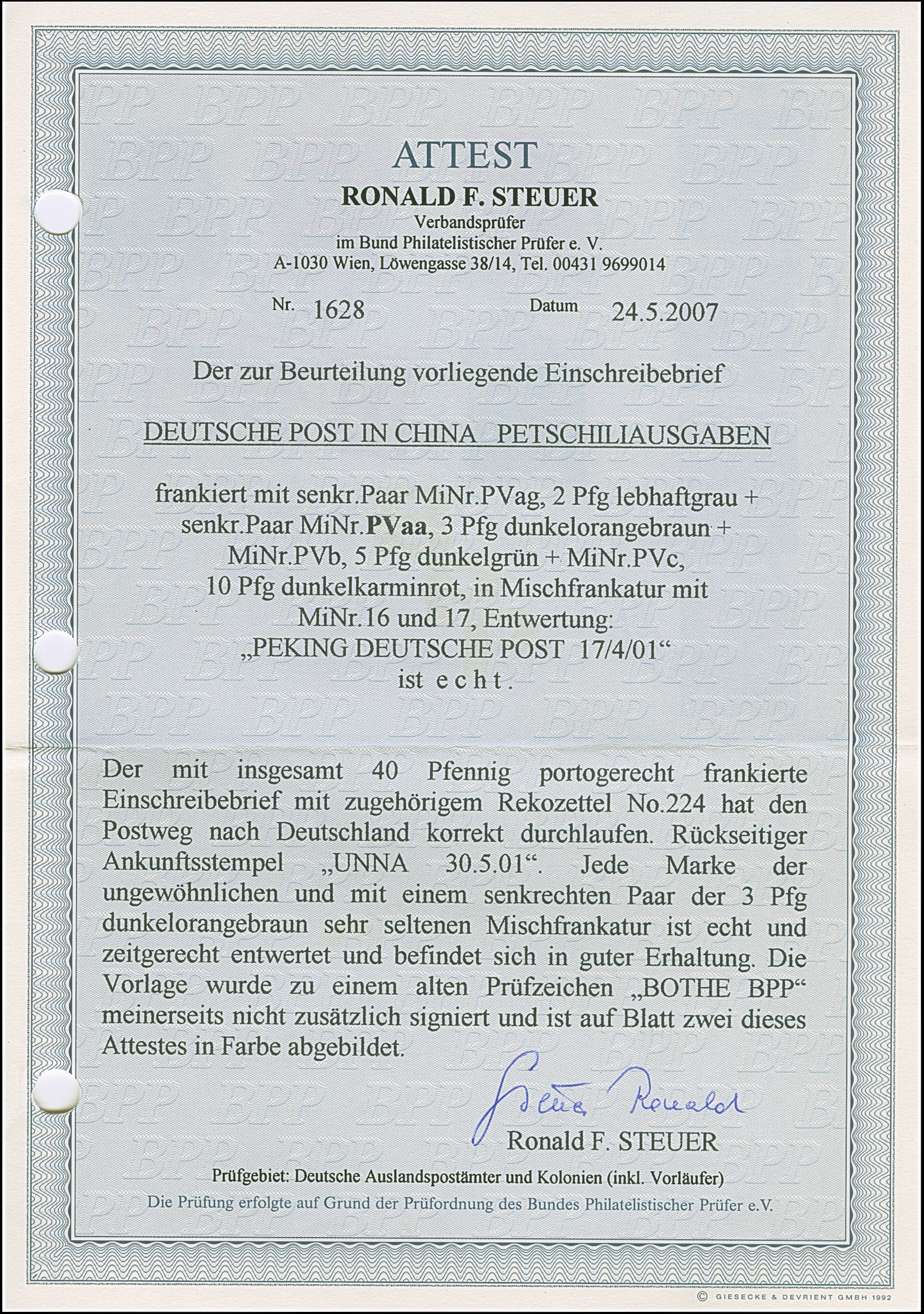 Krone/Adler 2 Pfg. im senkrechten Paar in Mischfrankatur mit Germania 3 Pfg. dunkelorangebraun im senkrechten Paar und Einzelmarken 5 und 10 Pfg. sowie Aufdruckausgabe 1901 5 und 10 Pfg. jeweils mit EKr. “PEKING DP 17.4.01” als tarifgerechte Frankatur auf R-Brief nach Unna mit Ankunftsstempel, in einwandfreier Erhaltung. Eine dekorative und seltene Mischfrankatur in Verbindung mit dem Paar der 3 Pfg. dunkelorangebraun, doppelt signiert Kruschel und Bothe BPP sowie Fotoattest R. Steuer BPP (2007)