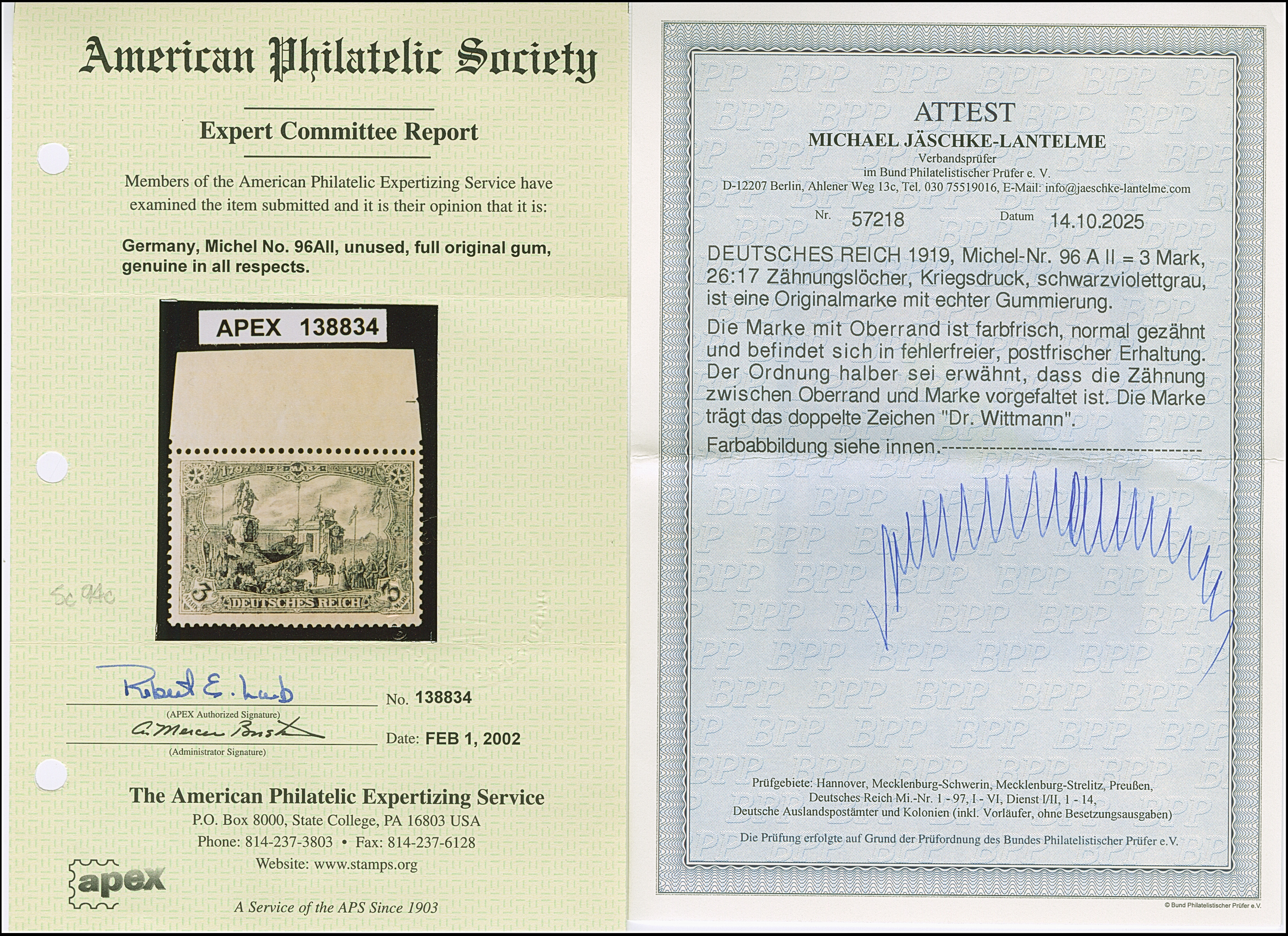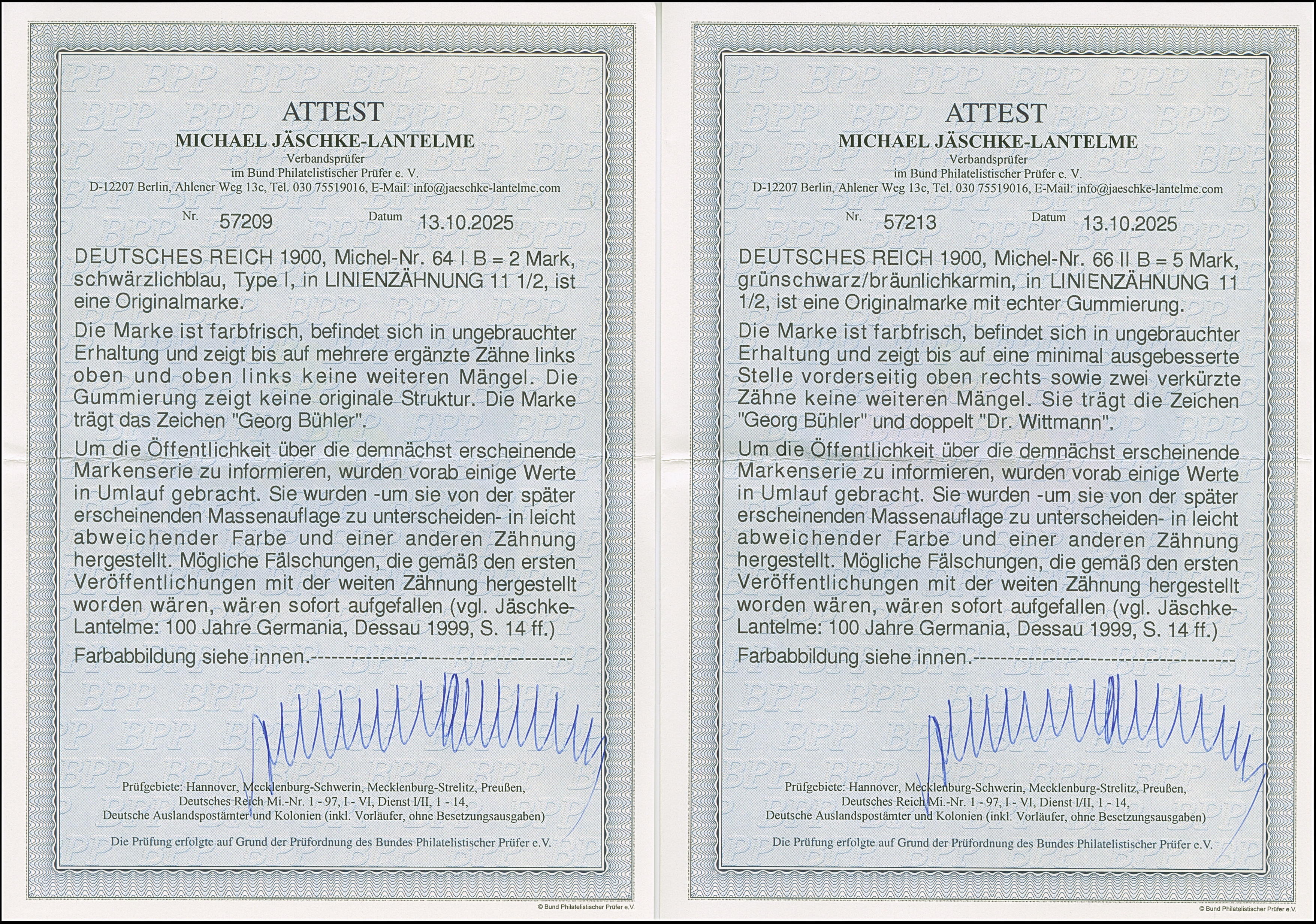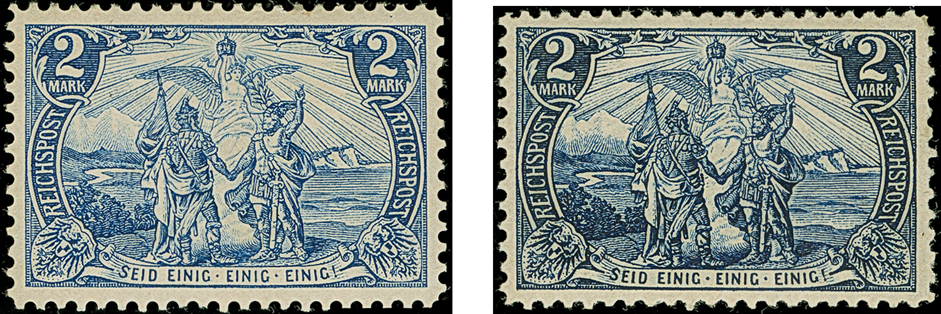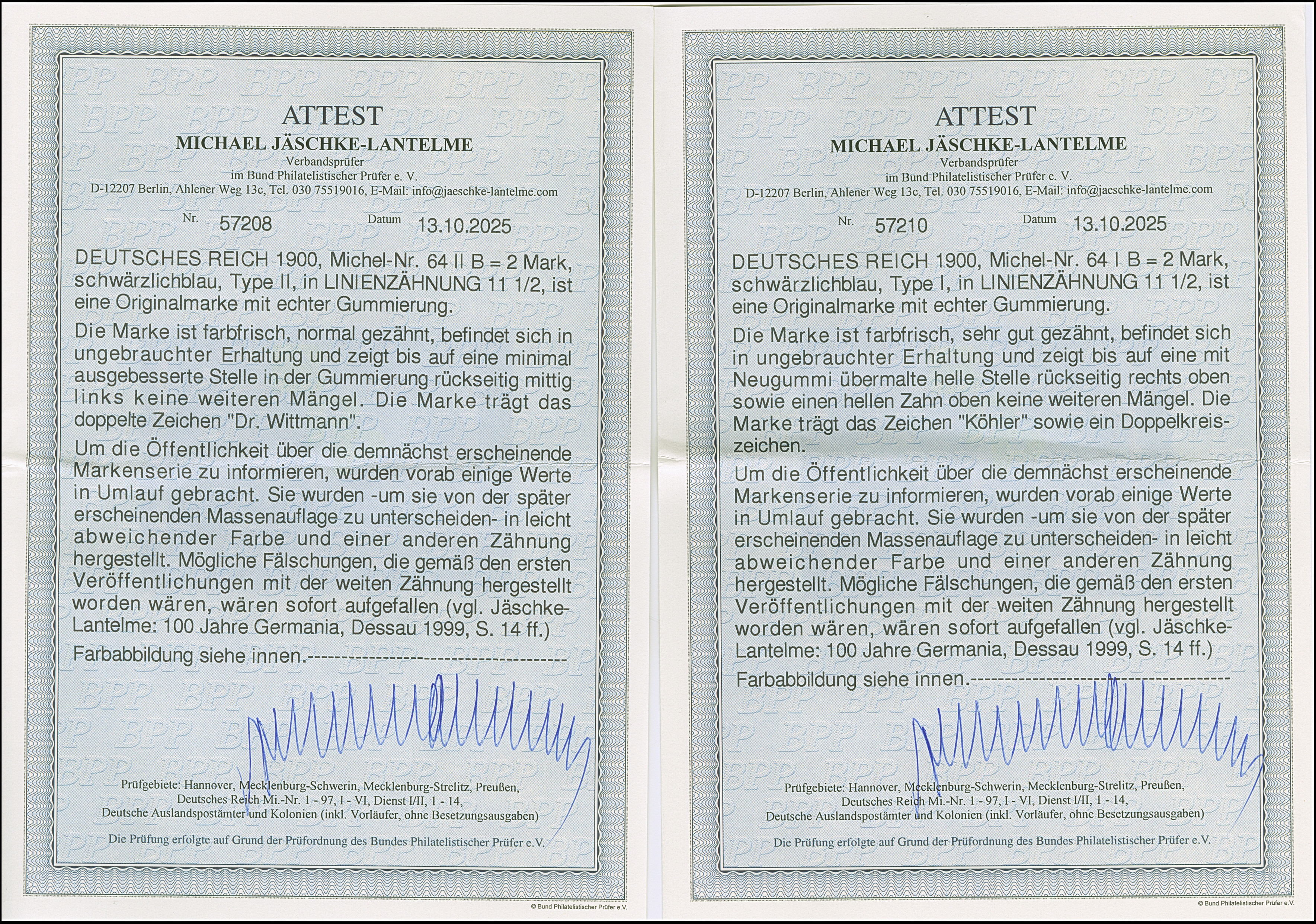 Versuchsdrucke mit Linienzähnung 11½: 1900, Reichspost 2 M. in Type I und II (dunkle Farbnuance), sind farbfrisch und sehr gut gezähnt bzw. normal gezähnt. Beide ungebrauchte Marken haben kleine Ausbesserungen sowie ein Wert mit hellem Zahn, ansonsten optisch in sehr ansprechender Erhaltung. Ein dekoratives “Paar” mit beiden Typen, signiert Köhler bzw. doppelt signiert Dr. Wittmann sowie zwei Fotoatteste Jäschke-L. BPP (2025)