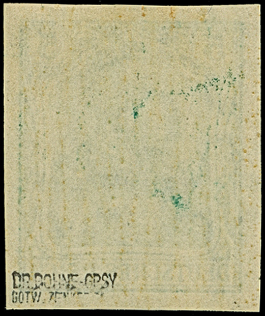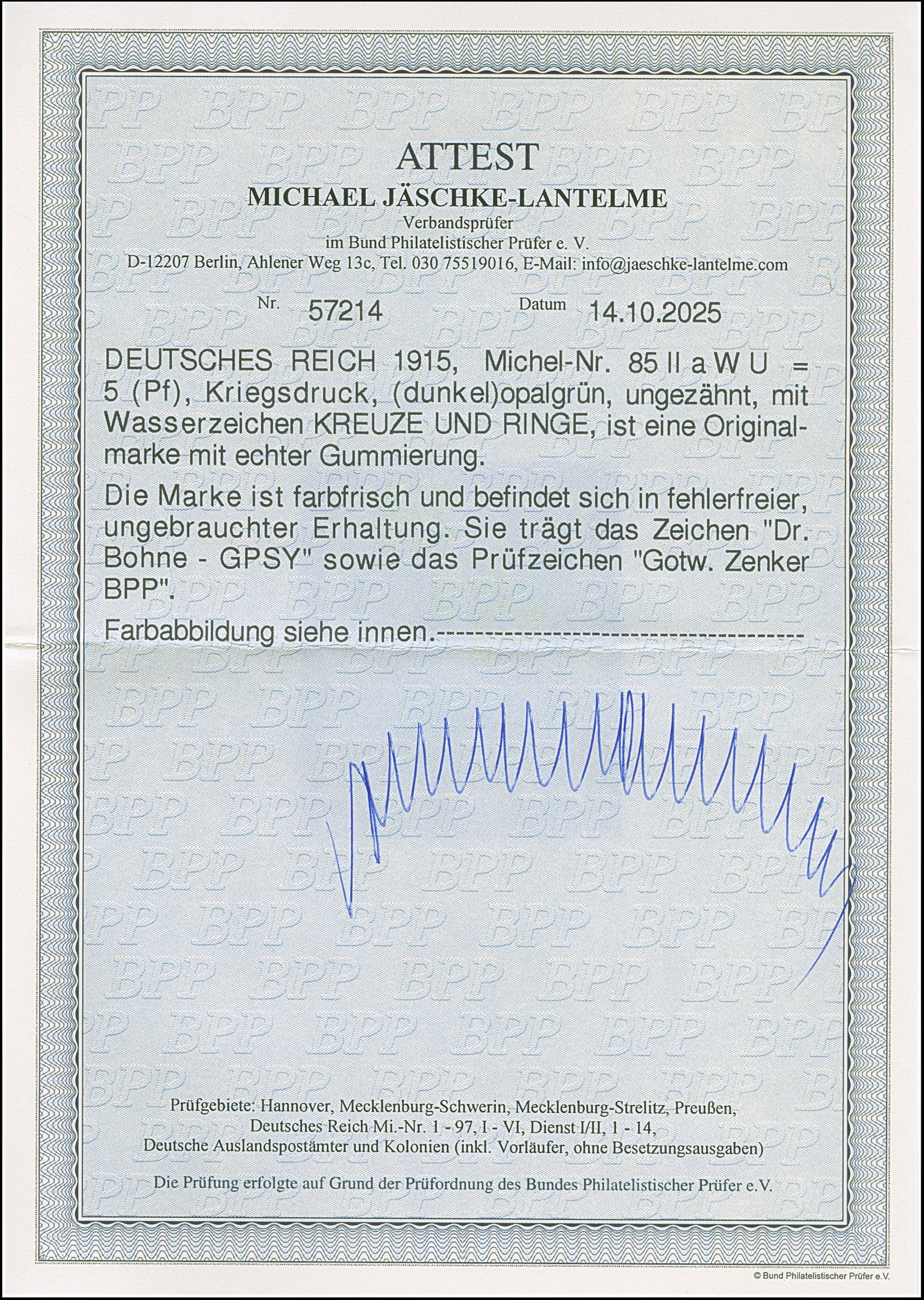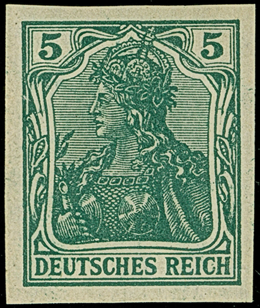 1915, Germania 5 Pfg. (dunkel)opalgrün ungezähnt mit Wasserzeichen “Kreuze und Ringe”, farbfrisch, ungebraucht und in tadelloser Erhaltung. Ein sehr schönes Exemplar dieser seltenen Marke, signiert Dr. Bohne -GPSY und Zenker BPP sowie Fotoattest Jäschke-L. BPP (2025)