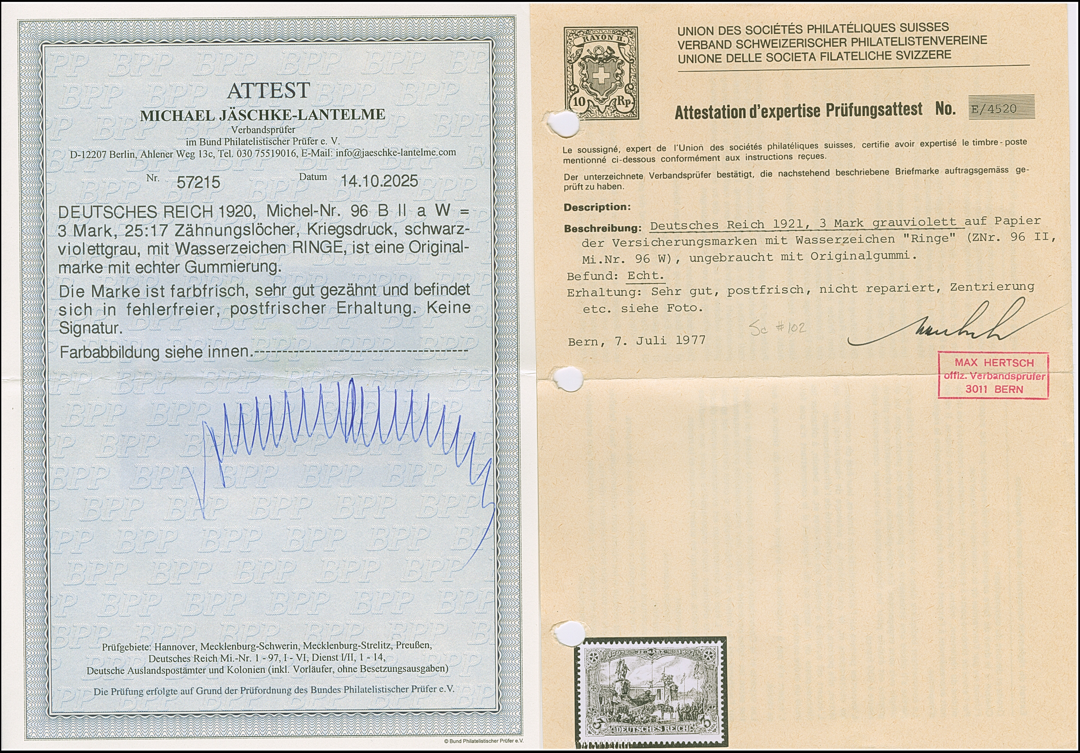 1920, Kriegsdruck 3 M. schwarzviolettgrau mit Wasserzeichen Ringe, ist farbfrisch und sehr gut gezähnt. Die postfrische Marke ist in einwandfreier Erhaltung, ein sehr schönes Exemplar dieser Marke mit der seltenen Wasserzeichen-Abart, unsigniert mit Fotoattesten M.Hertsch (1977) und Jäschke-L. BPP (2025)