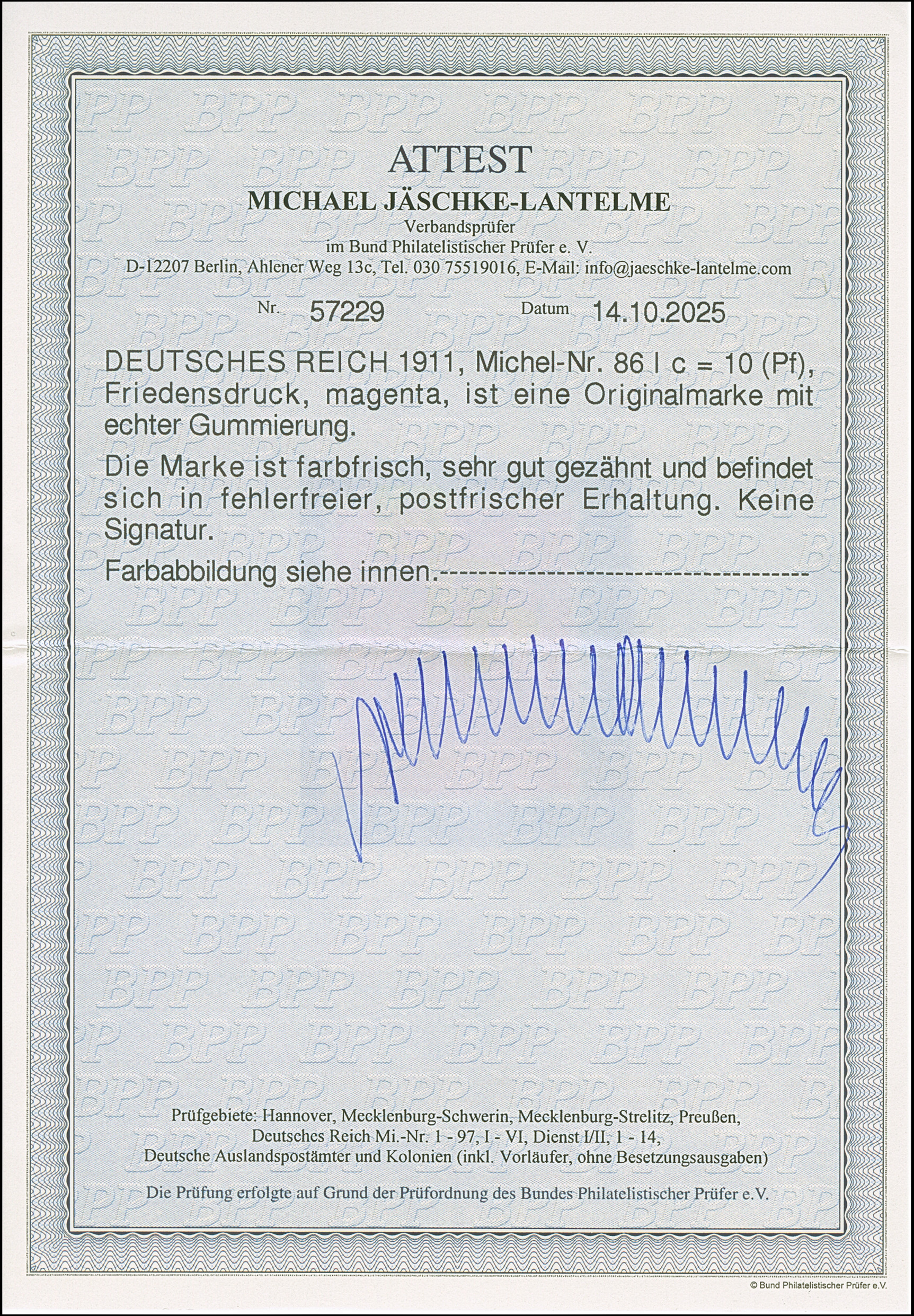 1905/13, Friedensdruck 10 Pfg. magenta, ist farbfrisch und gut gezähnt, postfrisch und in tadelloser Erhaltung, unsigniert mit Fotoattest Jäschke-L. BPP (2025)