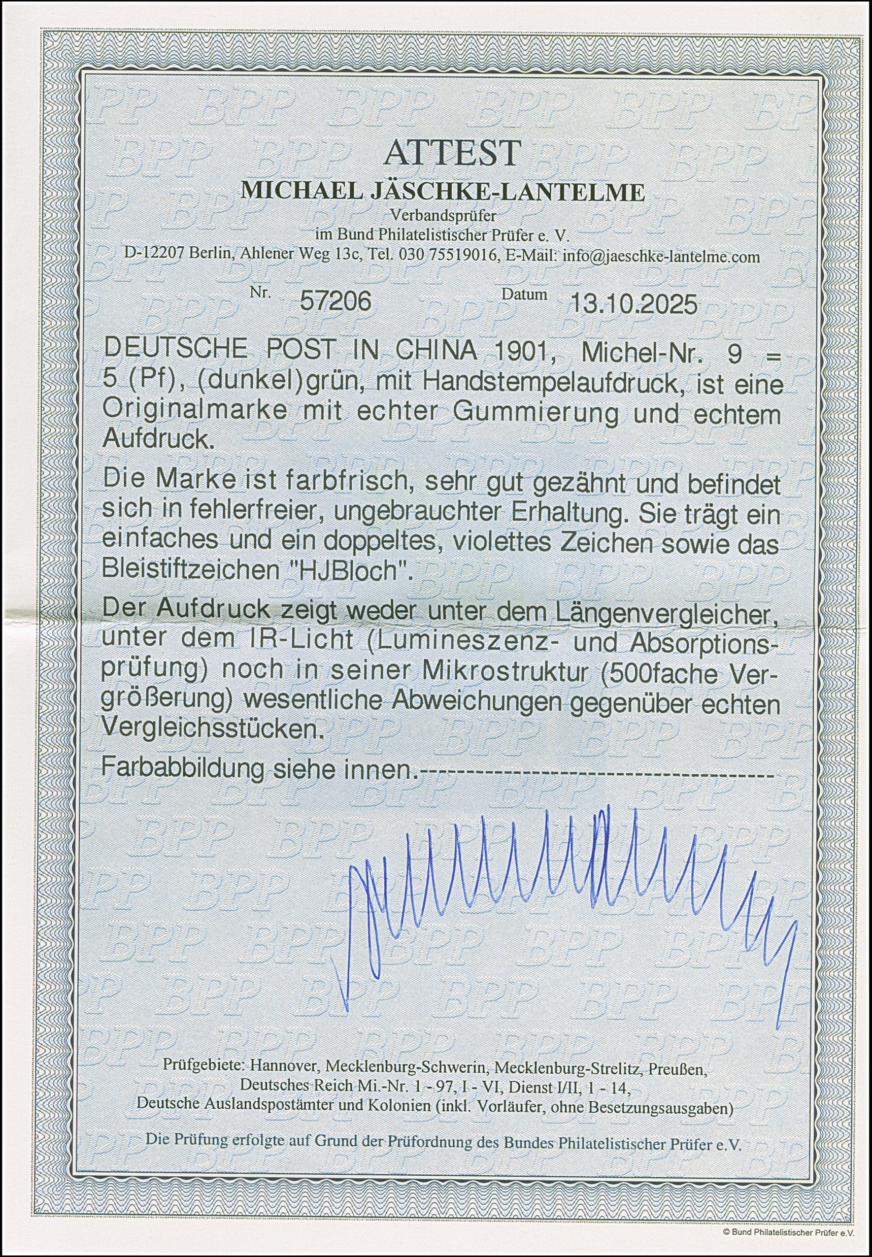 1900, Handstempel 5 Pfg., ist farbfrisch und sehr gut gezähnt, ungebraucht und in tadelloser Erhaltung, Bleistiftsignatur HJ Bloch und Fotoattest Jäschke-L. BPP (2025)