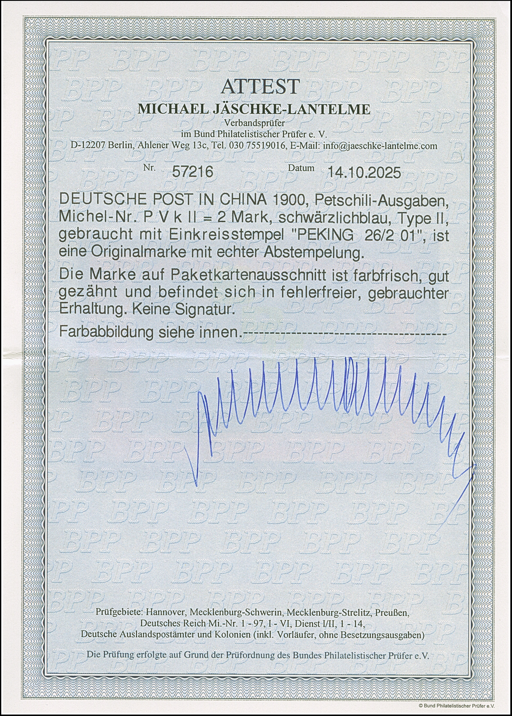 1900, Reichspost 2 M. in Type II mit EKr. “PEKING DP 26.2.01” auf Paketkarten-Briefstück. Die farbfrische und gut gezähnte Marke ist in einwandfreier Erhaltung, Fotoattest Jäschke-L. BPP (2025)