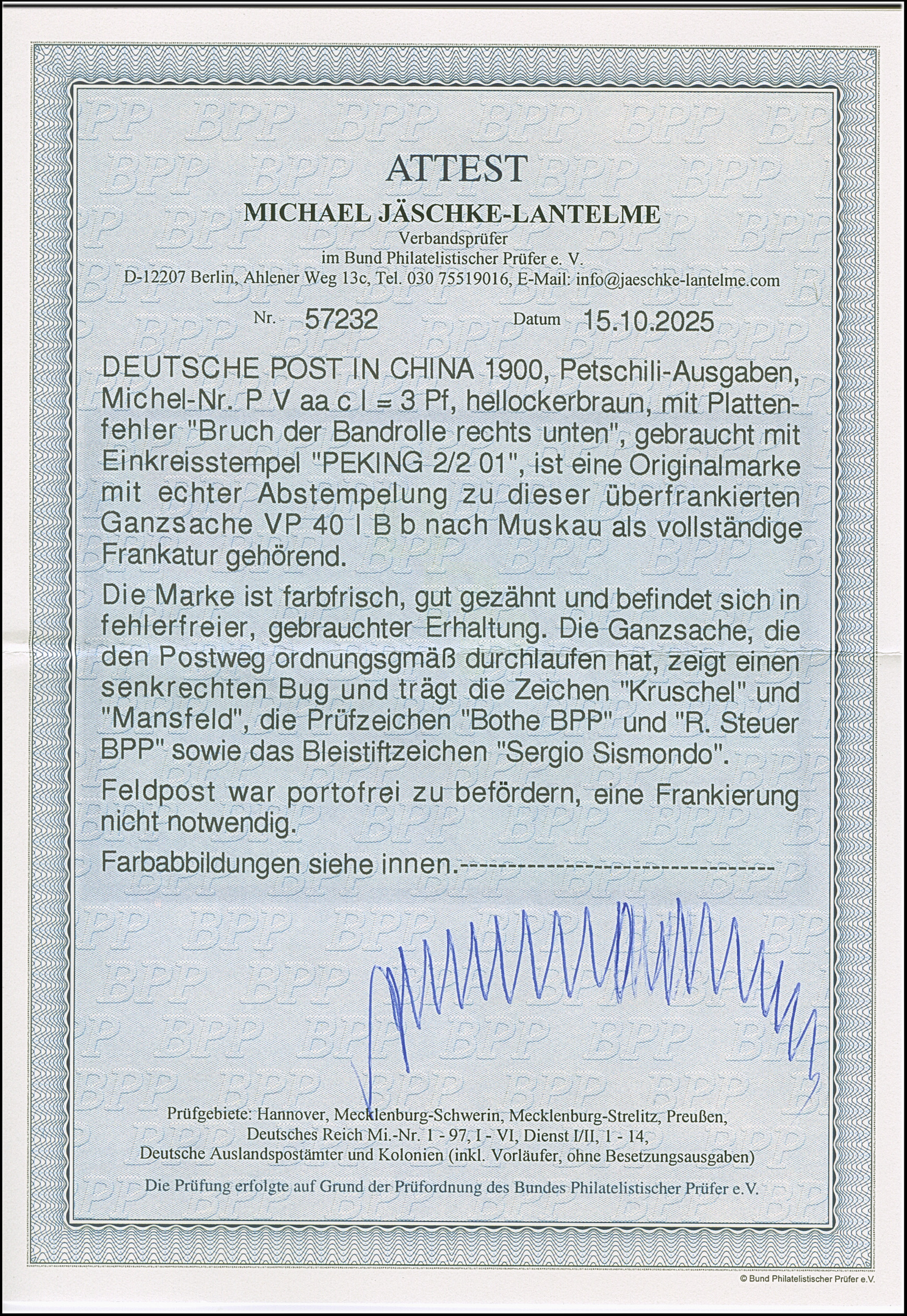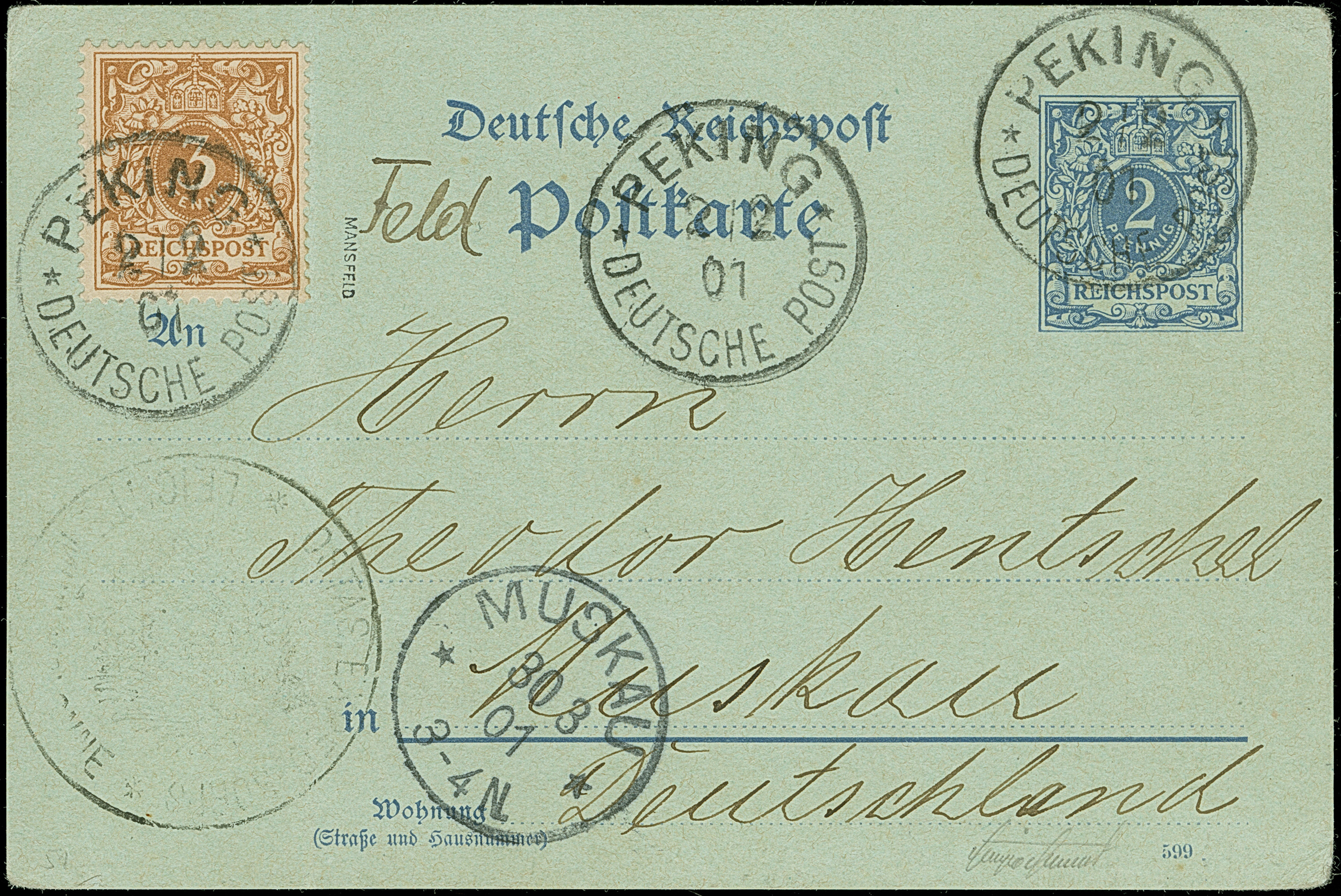 1900, Krone/Adler 3 Pfg. hellockerbraun mit Plattenfehler “Bruch der Banderolle rechts unten”, sauber mit EKr. “PEKING DP 2.2.01” auf Ganzsachenkarte Krone/Adler 2 Pfg. als Feldpostkarte mit Briefstempel und viel Text nach Muskau mit vorderseitigem Ankunftsstempel. Die Karte mit senkrechter Faltung rechts neben der Marke, die farbfrische und gut gezähnte Marke ist in tadelloser Erhaltung. Alle Feldpostkarten waren portofrei, einige Absender frankierten diese aber voll im Postkartentarif, um eine vermeintlich schnellere Beförderung zu erreichen. Trotz der Einschränkungen eine außergewöhnliche Verwendung der Marke mit Plattenfehler zur Petschillizeit, signiert Mansfeld, Bothe BPP, R. Steuer BPP und Bleistiftsignatur Sergio Sismondo sowie Fotoattest Jäschke-L. BPP (2025)