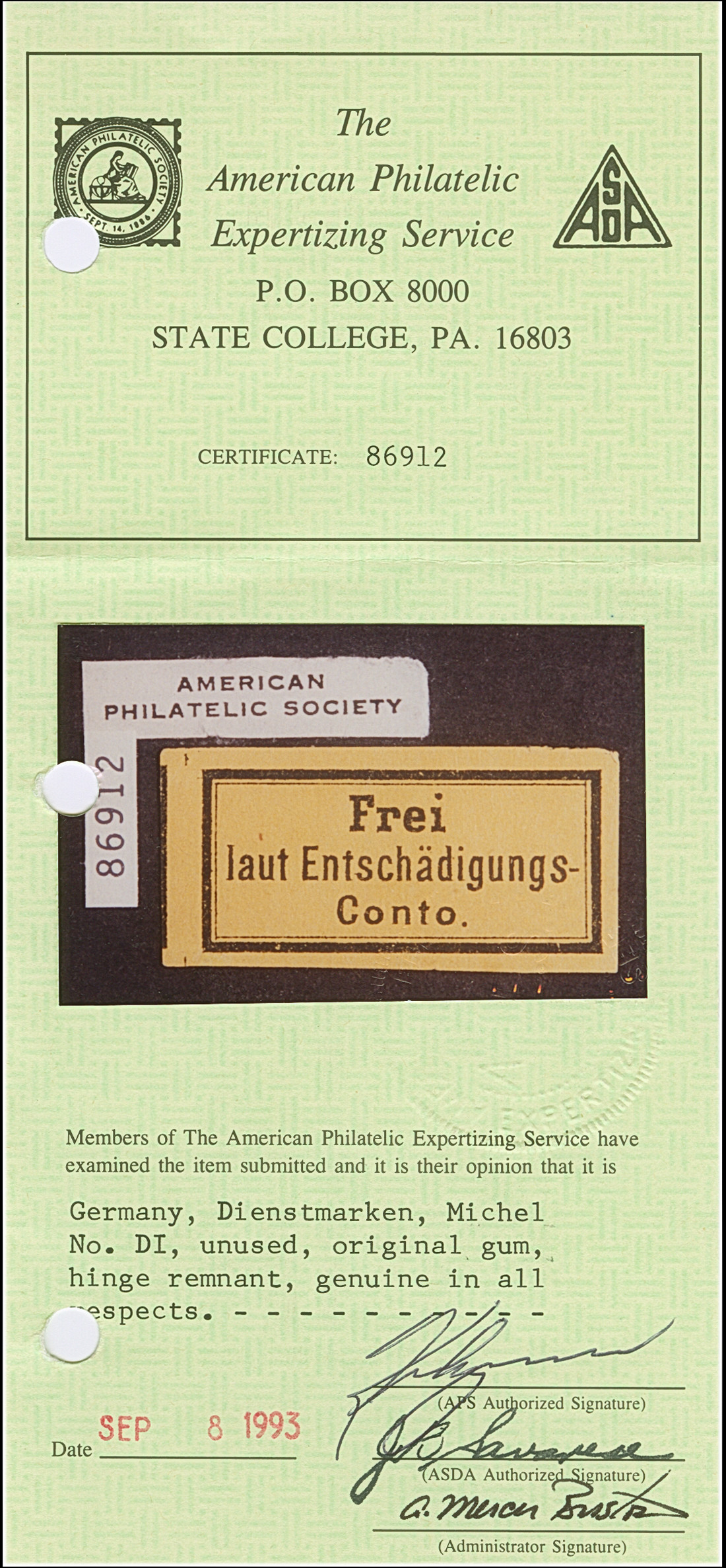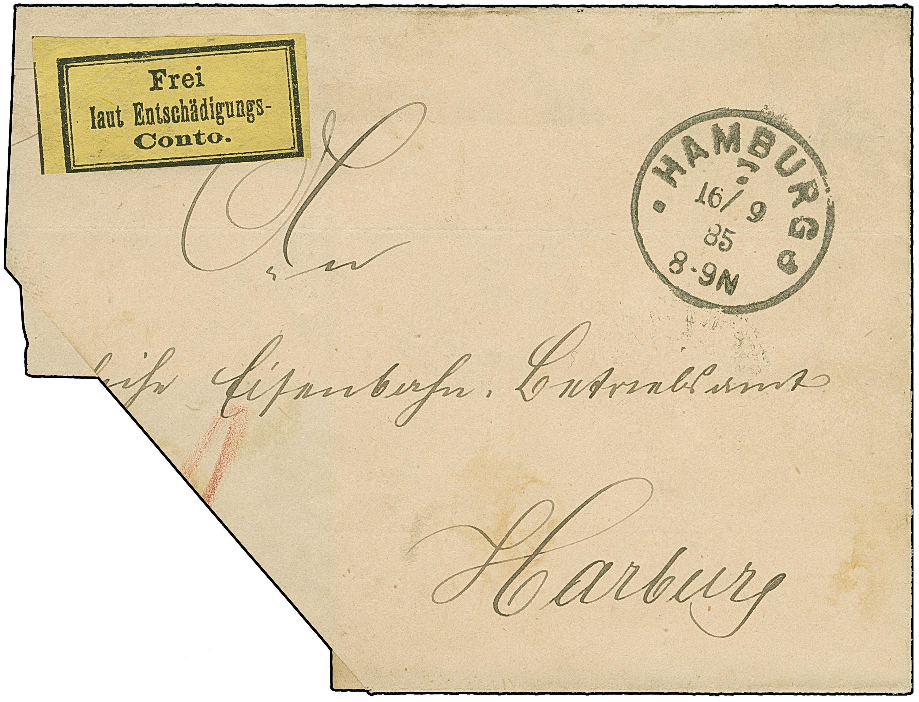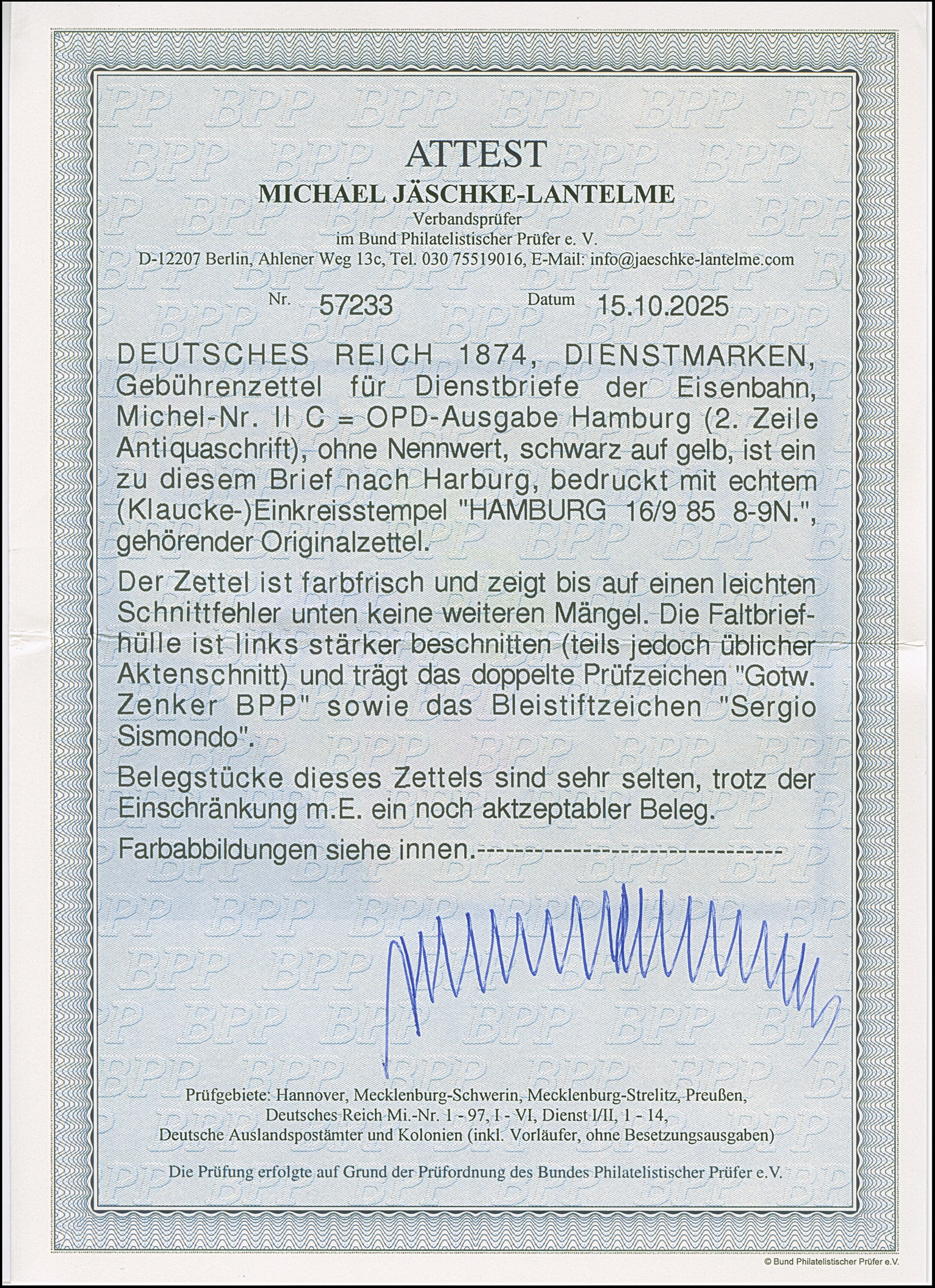 1874, Eisenbahn-Gebührenzettel der OPD Hamburg “Frei laut Entschädigungs-Conto” (2. Zeile Antiquaschrift) schwarz auf gelb, dreiseitig voll- bis breitrandig auf großem Briefteil mit Stempel “HAMBURG 7 *a 16.9.85” nach Harburg mit Ankunftsstempel. Der farbfrische Gebührenzettel ist bis auf den leichten Schnittfehler unten in einwandfreier Erhaltung. Trotz der Einschränkungen eine seltene Verwendung dieser OPD-Ausgabe, signiert Zenker BPP und Bleistiftsignatur Sergio Sismondo sowie Fotoattest Jäschke-L. BPP (2025)