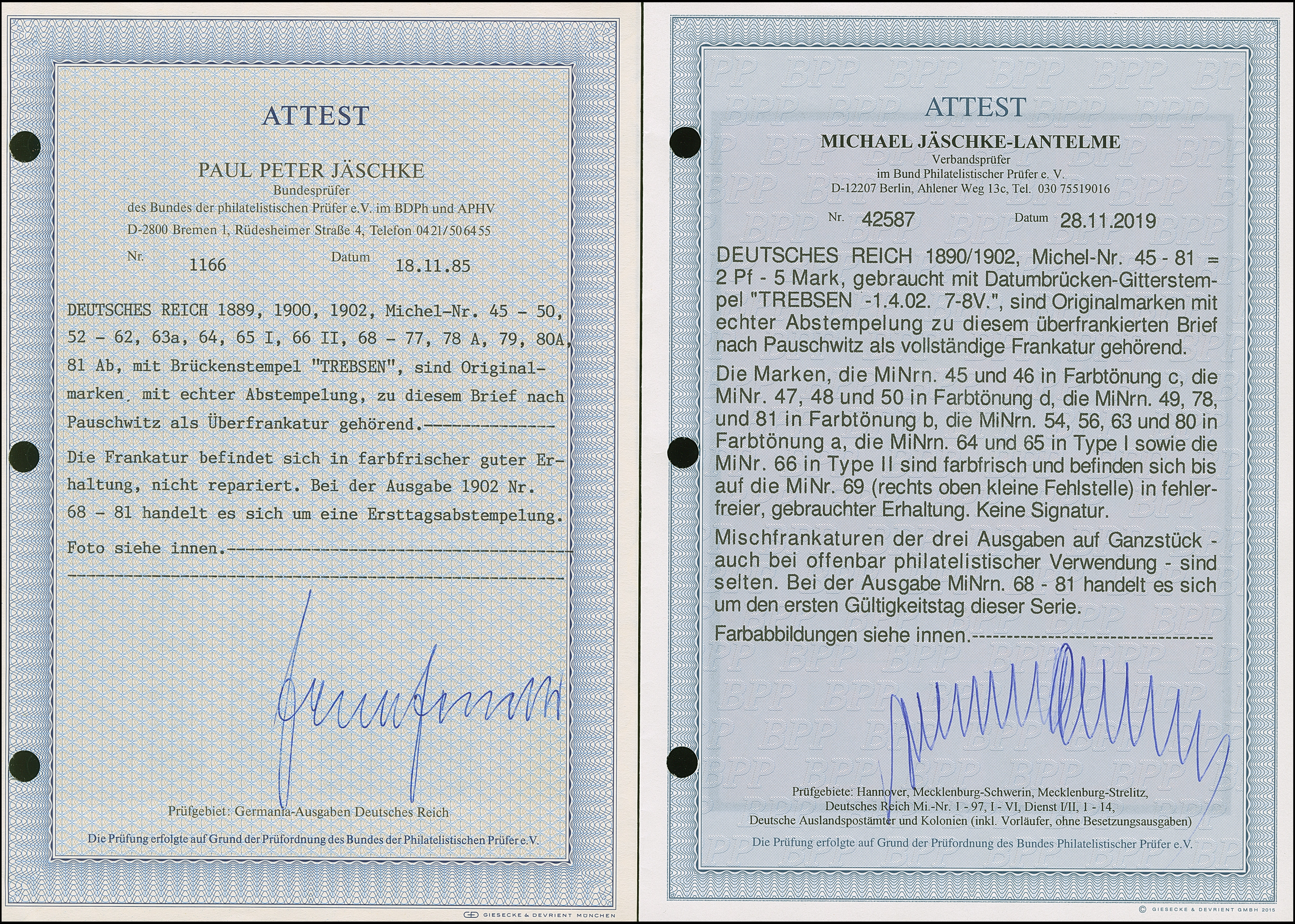 1902, Germania und Repräsentative Darstellung ohne Wz. 2 Pfg.-5 M. mit sauberen Ersttagsstempeln "TREBSEN 1.4.02", zusammen mit Krone/Adler 2-50 Pfg. sowie Germania und Repräsentative Darstellung Reichspost 2 Pfg.-5 M. (Höchstwert in Type II), auf philatelistischem Brief nach Pauschwitz. Ein kleiner Wert mit fehlendem Eckzahn, ansonsten in einwandfreier Erhaltung. Ein äußerst attraktiver und seltener Beleg, Fotoattest Jäschke BPP (1985) und Jäschke-L. BPP (2019)