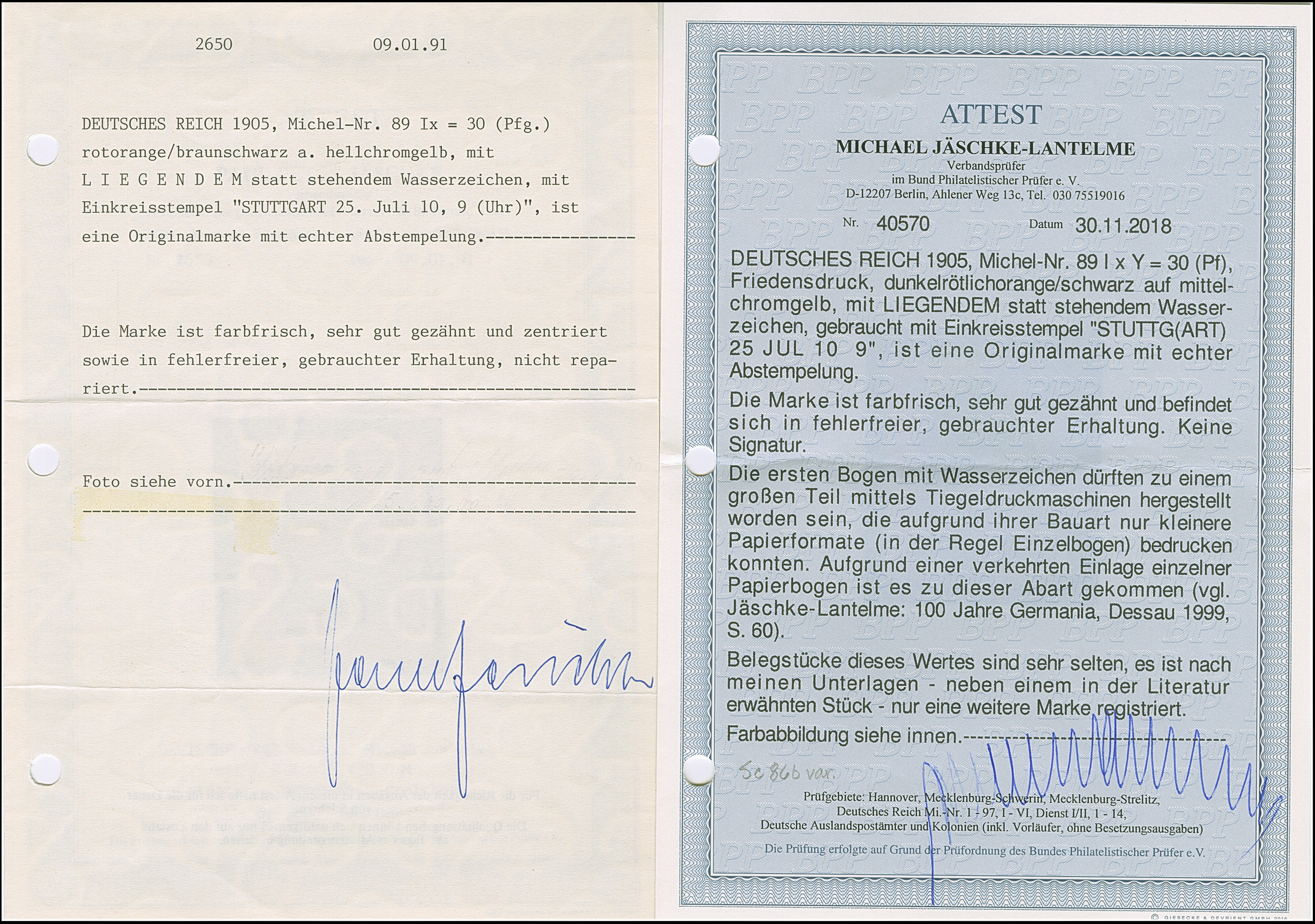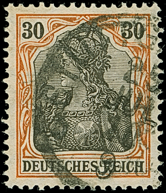 1905, Germania 30 Pfg. dunkelrötlichorange/schwarz auf mittelchromgelbem Papier mit liegendem Wasserzeichen (Wz. 1Y), sauber mit EKr. “STUTTGART 25.JUL.10” entwertet und in tadelloser Erhaltung. Bisher ist neben einem in der Literatur erwähnten Stück nur ein weiteres Exemplar registriert. Eine der ganz großen Germania-Seltenheiten, Fotoattest Jäschke BPP (1991) und Jäschke-L. BPP (2018)