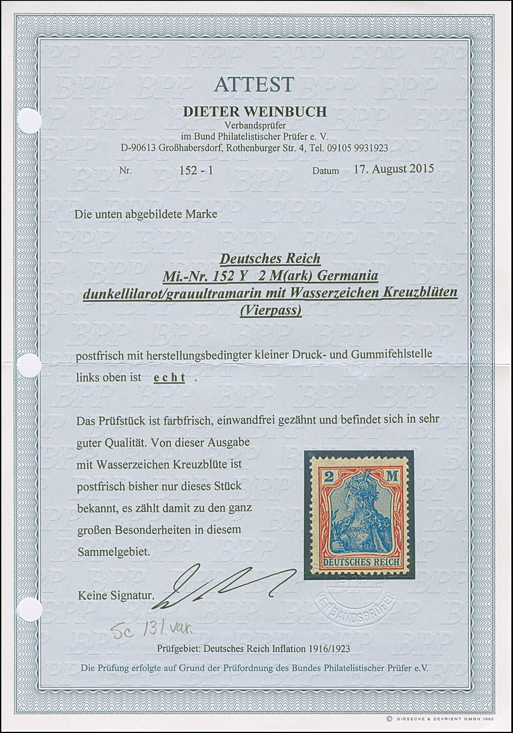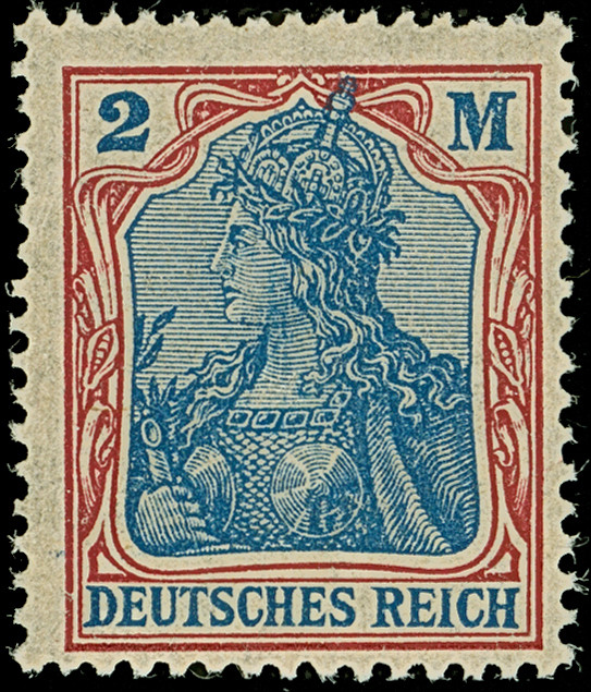 1920, Germania 2 M. dunkellilarot/gruultramarin mit Wasserzeichen Kreuzblütten (amtlich Vierpass-Wasserzeichen). Die farbfrische Marke ist in einwandfreier Erhaltung. Neben den bekannten gestempelten Marken mit diesem Wasserzeichen ist postfrisch bisher kein weiteres Exemplar registriert. Eine der ganz großen Wasserzeichen-Abarten aus der Inflationszeit und in dieser Art ein Unikat, unsigniert mit Fotoattest Weinbuch BPP (2015)
