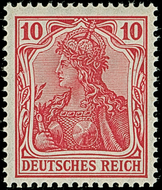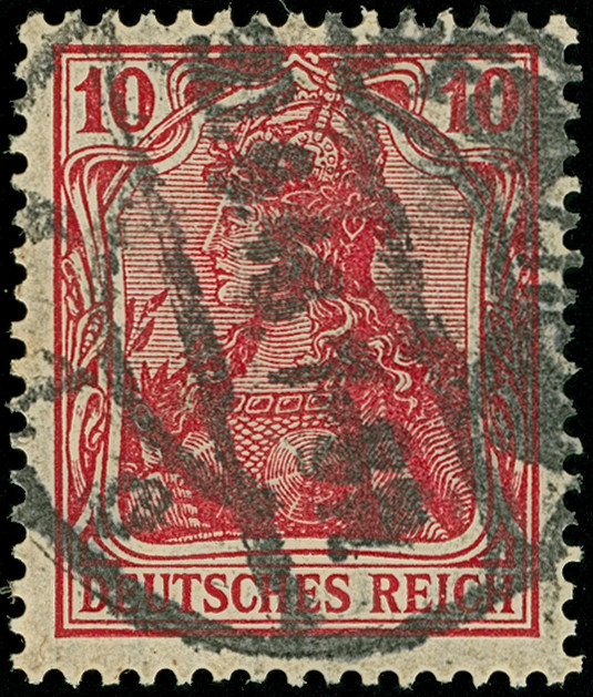 Germania Kriegsdruck 10 Pfg. dunkellilarot, farbfrisch und gut gezähnt mit Stempel “PFORZHEIM 30.6.16”, in tadelloser Erhaltung. Ein sehr schönes Exemplar dieser seltenen Farbe, Fotoattest Jäschke-L. BPP (2010)