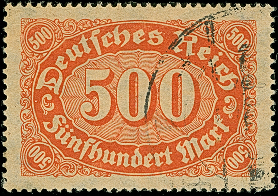1922, Ziffer im Queroval 500 M. mit liegendem Wasserzeichen, entwertet mit nicht zeitgerechtem Stempel. Die farbfrische Marke ist gut gezähnt und in einwandfreier Erhaltung. Bisher ist kein weiteres Exemplar registriert, eine der großen Seltenheiten aus der Inflationszeit, signiert Burnleit Infla, W und Monogrammstempel sowie Fotoattest Oechsner BPP (2009) und Weinbuch BPP (2018)