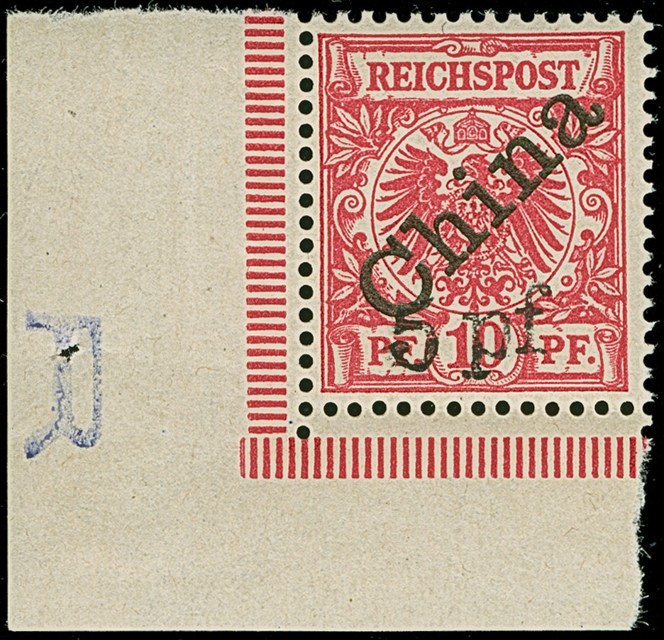 1900, 5 pf auf 10 Pfg. mit diagonalem Aufdruck aus der linken unteren Bogenecke. Die farbfrische und postfrische Marke ist in tadelloser Erhaltung, links im Unterrand mit Falzrest. Ein schönes Exemplar dieser nicht häufigen Marke, signiert Gentzsch und Fotoattest R. Steuer BPP (1994)