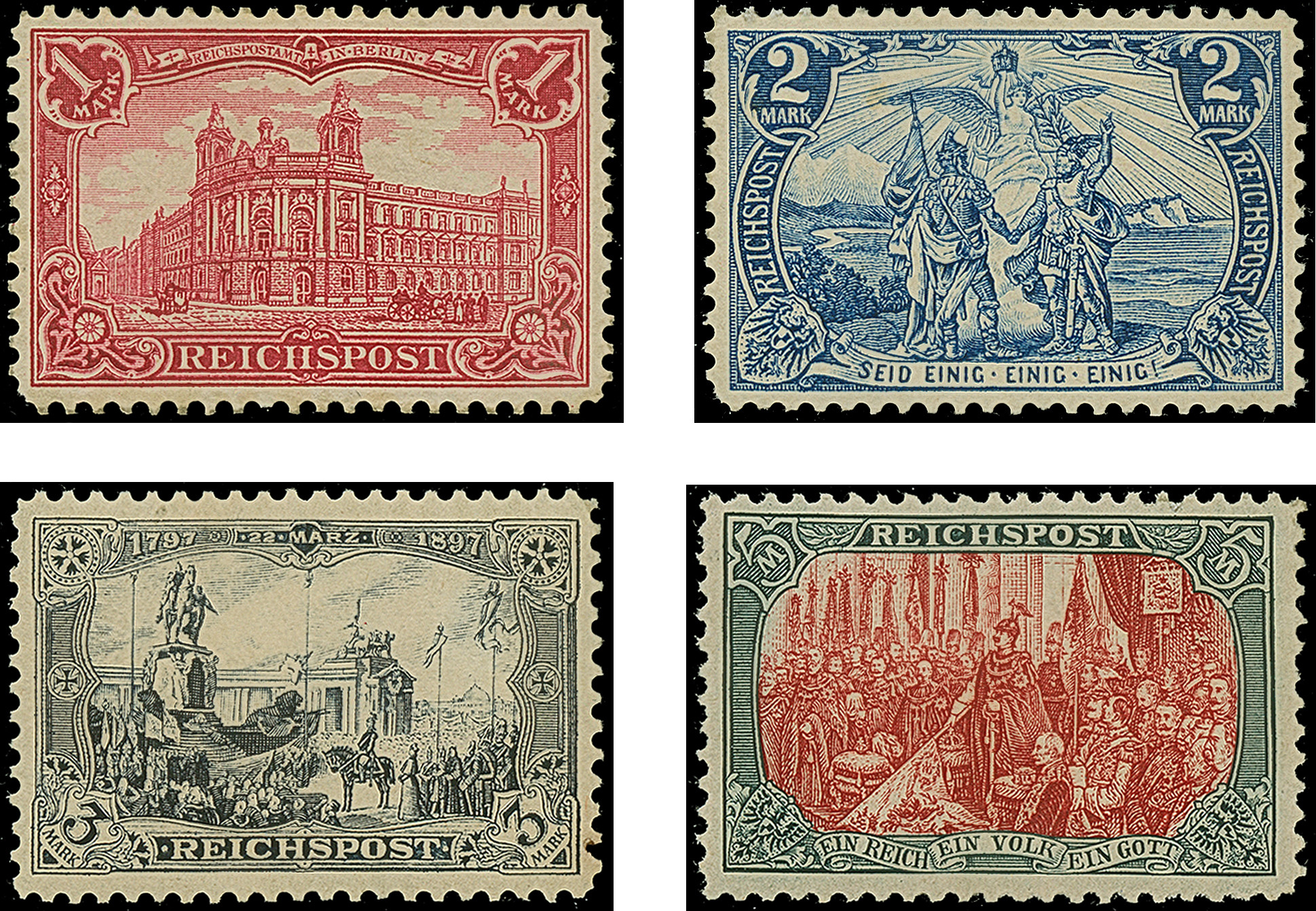 Versuchsauflage mit Linienzähnung 11½: 1900, Reichspost 1-5 M. komplett, ungebraucht, dabei 2 M. in Type I, 3 M. in Type II und 5 M. in Type II. Drei Marken haben wie fast immer kleine, meist winzige Ausbesserungen bzw. kleine Zahnfehler, die 1 M.-Wertstufe hat zusätzlich verlaufene Originalgummierung. Alle Marken sind optisch in ansprechender Erhaltung und haben diverse Signaturen sowie jeweils ein Fotoattest Jäschke-L. BPP (2025)