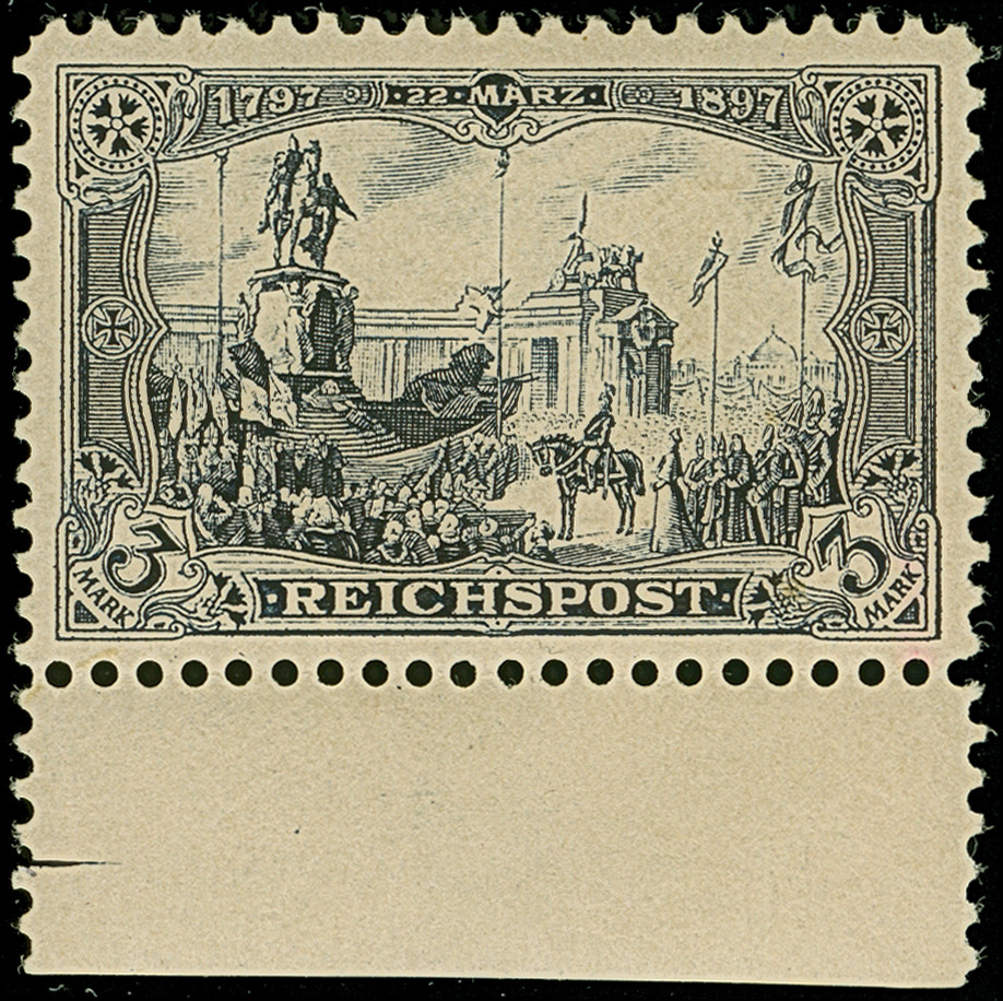 Versuchsauflage mit Linienzähnung 11½: 1900, Reichspost 3 M., Unterrandstück in Type I, ist farbfrisch und sehr gut gezähnt. Die ungebrauchte Marke ist in tadelloser Erhaltung. Ein sehr schönes Exemplar dieser Seltenheit, signiert W. Engel, Hunziker und M. Kurt Maier/Berlin sowie Fotoattest Jäschke-L. BPP (2025)