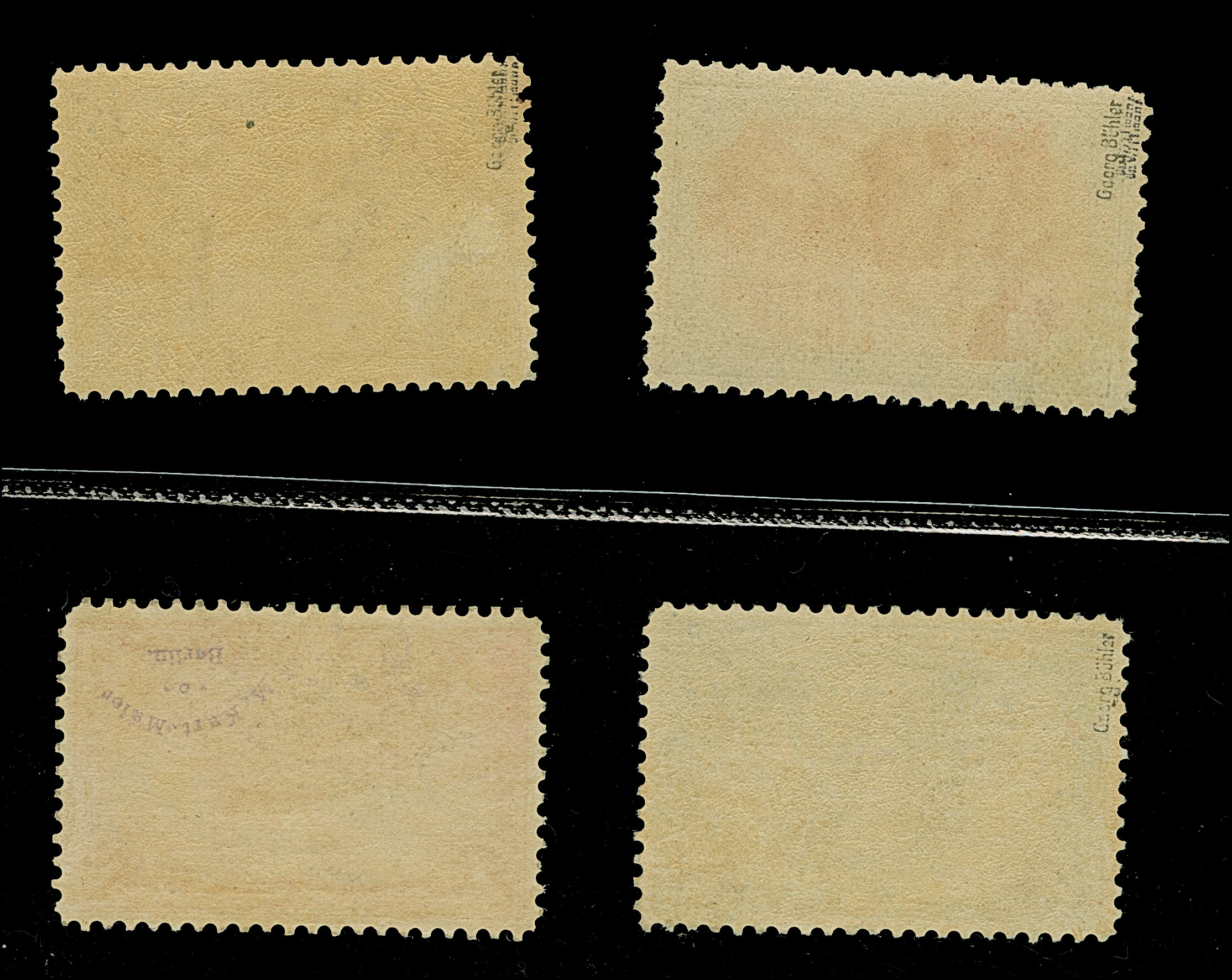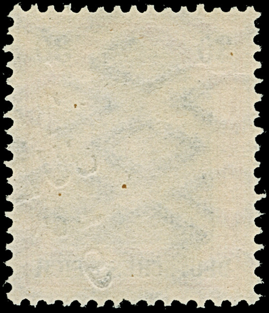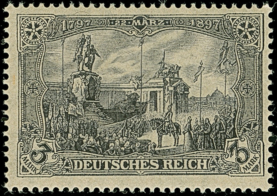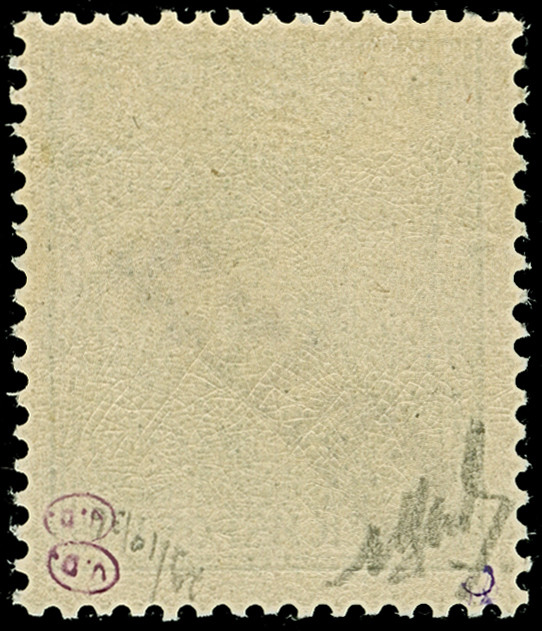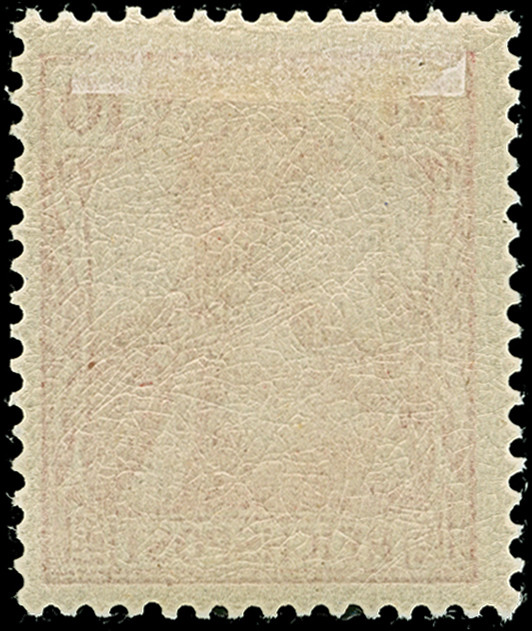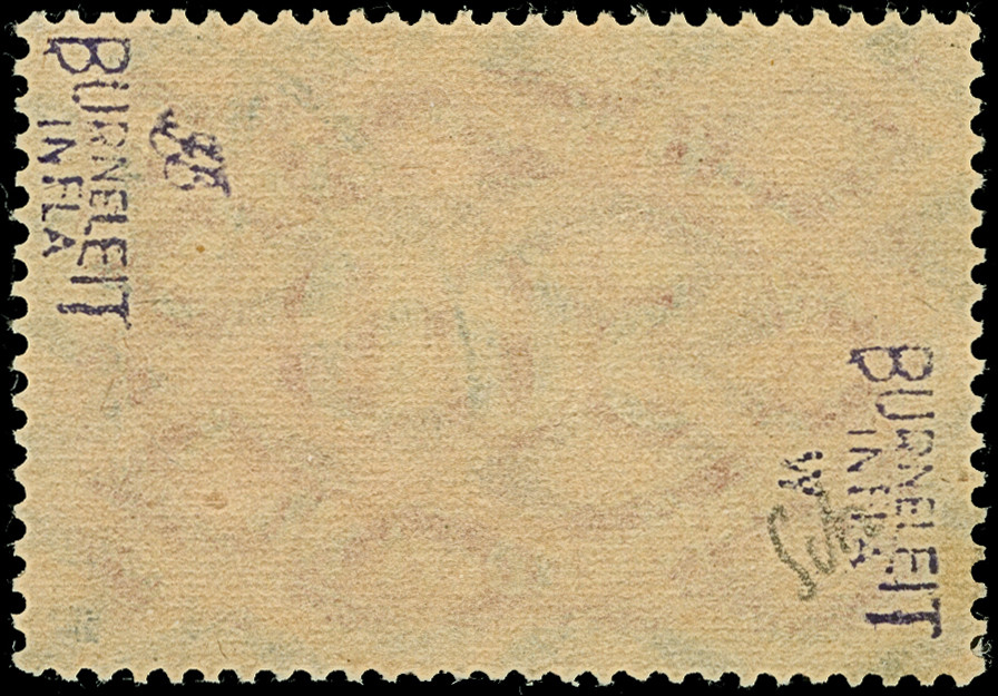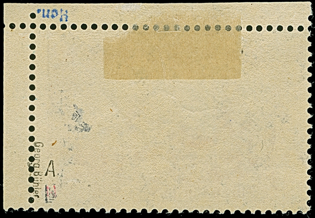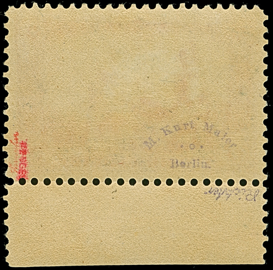 5 M. grünschwarz/dunkelkarmin (karmin bis bräunlichlila quarzend), Zähnungslöcher 25 : 16, farbfrisch und normal gezähnt, ungebraucht und in tadelloser Erhaltung. Exemplare in dieser Variante sind in überdurchschnittlicher Erhaltung außerordentlich selten, unsigniert mit Fotoattest Jäschke-L. BPP (2001)