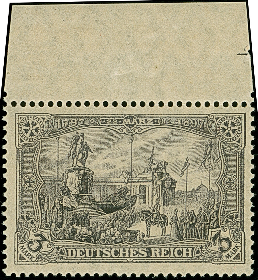 1919, Kriegsdruck 3 M. schwarzviolettgrau mit Zähnungslöcher 26:17, Oberrandstück, postfrisch und in tadelloser Erhaltung. Das farbfrische Oberrandstück ist signiert Dr. Wittmann und hat zwei Fotoatteste APS (2002) und Jäschke-L. BPP (2025)