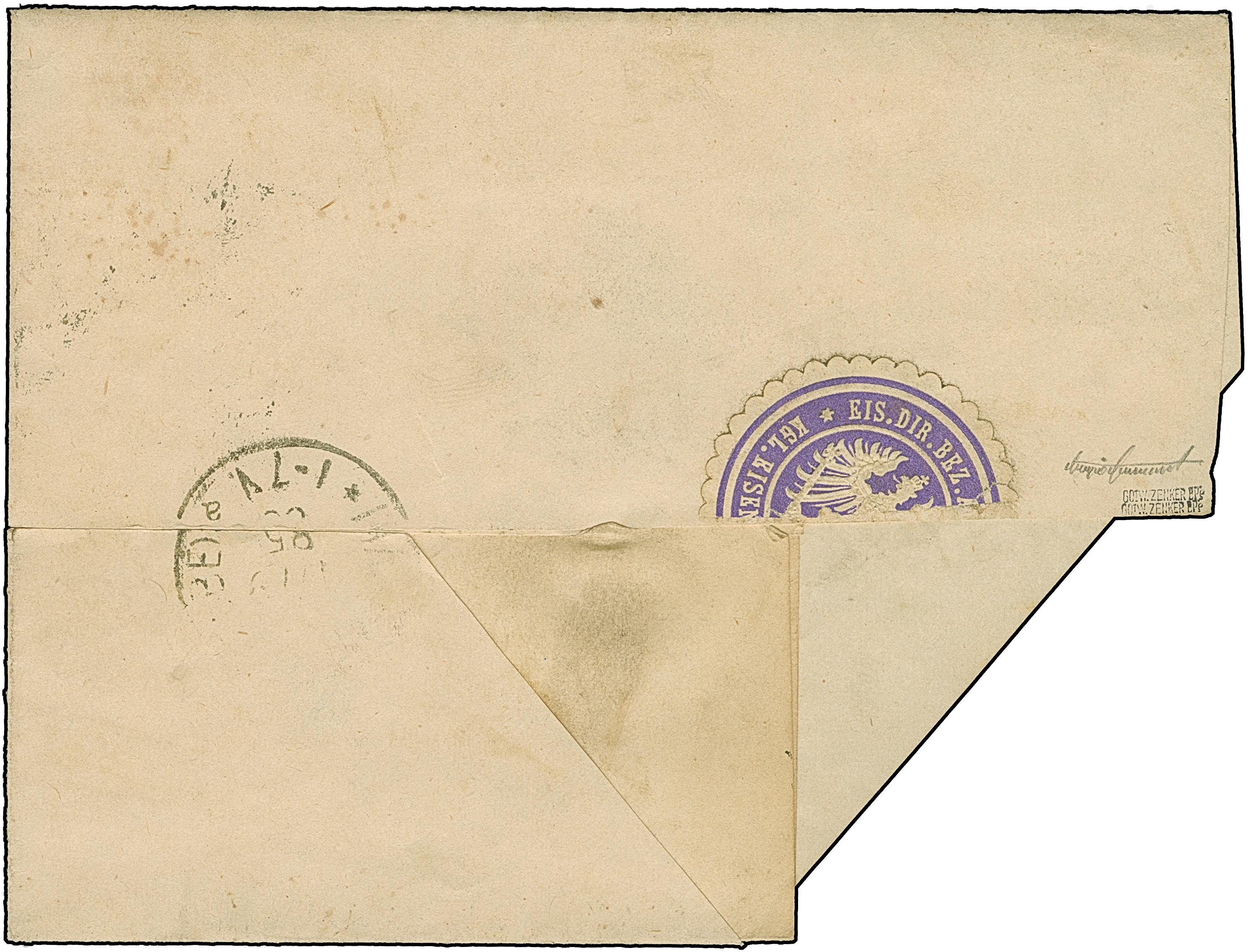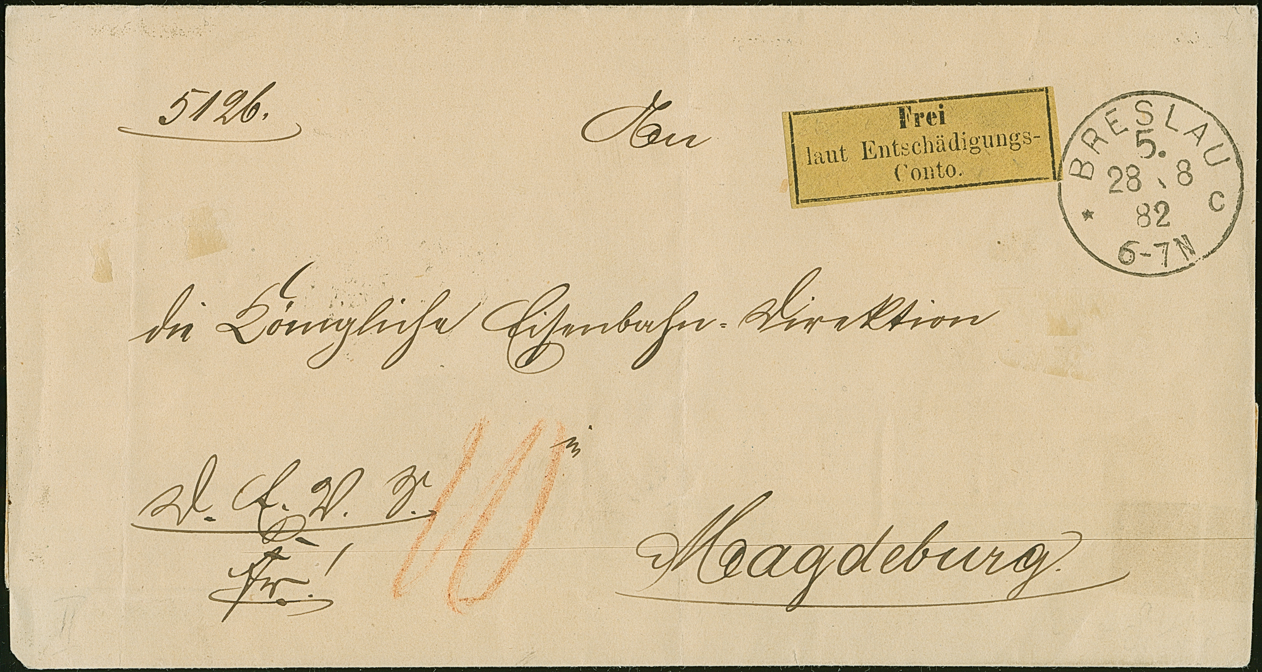 1874, Eisenbahn-Gebührenzettel der OPD Breslau “Frei laut Entschädigungs-Conto” schwarz auf gelb, oben lupenrandig, ansonsten vollrandig mit winzig übergehendem Stempel “BRESLAU 5 *c 28.8.82” auf Faltbriefhülle nach Magdeburg mit Ankunftsstempel. Die Briefhülle ist verklebt und hat unten einen längeren Einschnitt bzw. senkrechte Faltungen. Trotz der Einschränkungen ein optisch ansprechender Brief. Dieser Gebührenzettel ist auf Brief außerordentlich selten, Fotoattest Jäschke-L. BPP (2014)