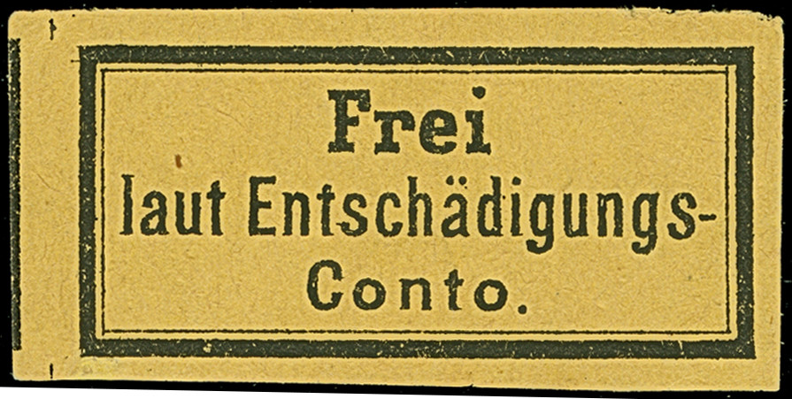 1874, Eisenbahn-Gebührenzetel “Frei laut Entschädigungs-Conto” schwarz auf gelb, allseits breitrandig, farbfrisch, ungebraucht mit Originalgummierung, in einwandfreier Erhaltung, Fotoattest APS (1993)