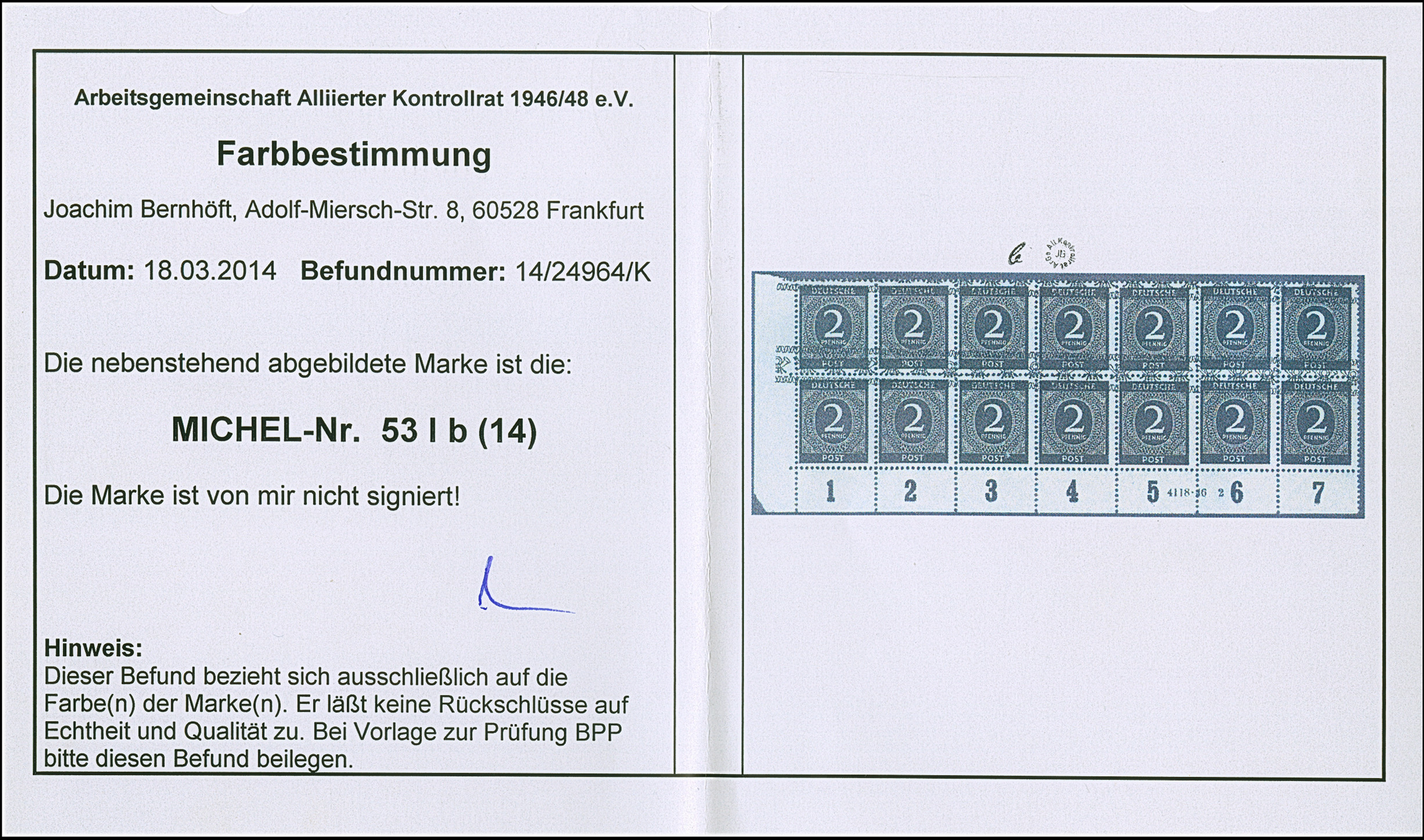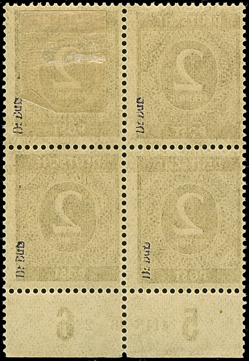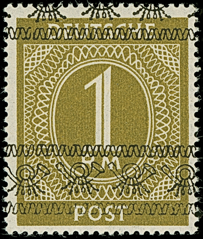 1948, Band auf Ziffer 2 Pfg. schwarz im Unterrand-Viererblock mit HAN “4118.46 2”, postfrisch, die rechte obere Marke ist ungebraucht, in tadelloser Erhaltung. Eine seltene Variante, die HAN ist bisher nicht gelistet, signiert Dr. Dub und Fotobefund Bernhöft/ARGE (2014) für eine größere Einheit sowie Fotobefund D. Schlegel BPP (2022)