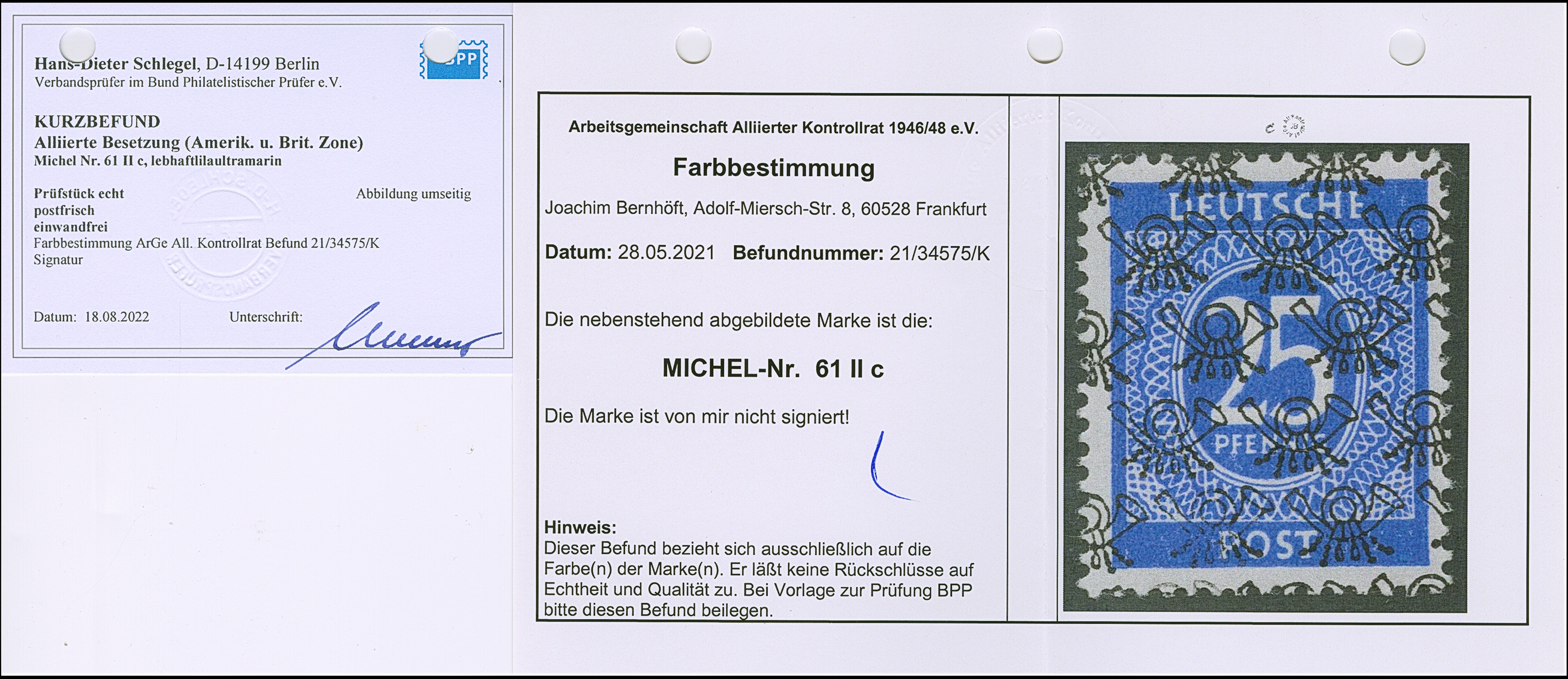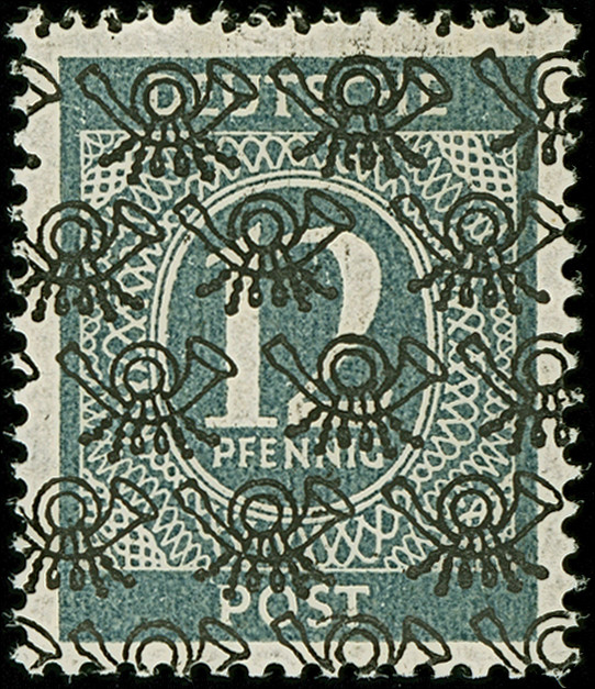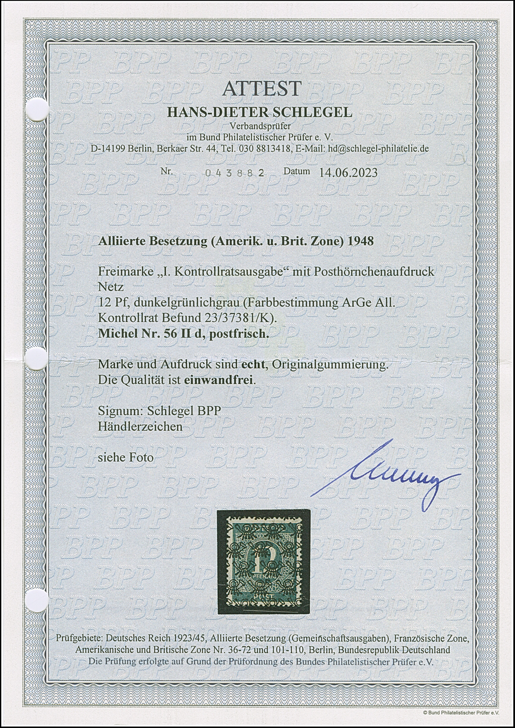 1948, Netz auf Ziffer 12 Pfg. dunkelgrünlichgrau, postfrisch und in tadelloser Erhaltung. Eine außerordentlich seltene Farbe, ProFi hat kein weiteres Exemplar registriert, signiert Schlegel BPP mit Fotobefund Bernhöft/ARGE (2023) sowie Fotoattest D. Schlegel BPP (2023)