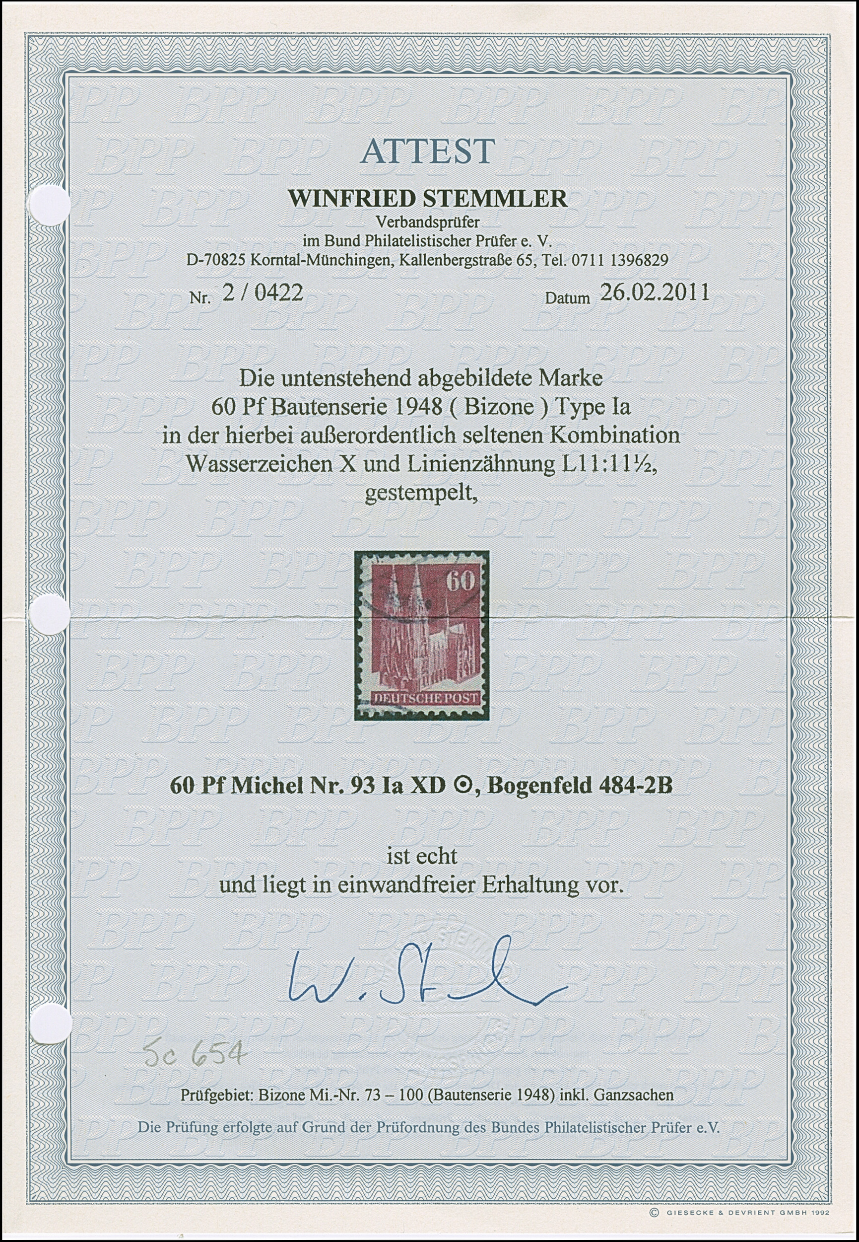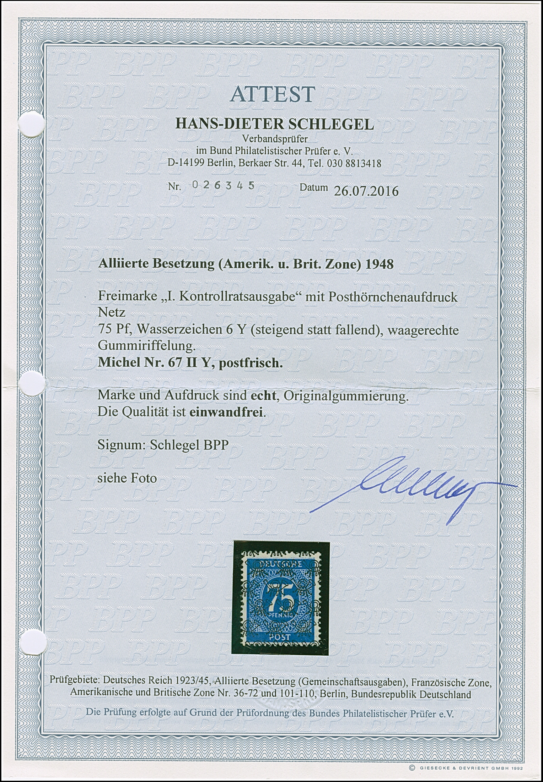 1948, Netz auf Ziffer 75 Pfg. mit Wasserzeichen “steigend statt fallend” (6Y) und waagerechter Gummiriffelung, postfrisch und in tadelloser Erhaltung. In dieser Qualität ein Ausnahmestück, ProFi hat nur ein weiteres postfrisches Exemplar registriert, eine große Bizone-Seltenheit, doppelt signiert Schlegel BPP und Fotoattest D. Schlegel BPP (2016)