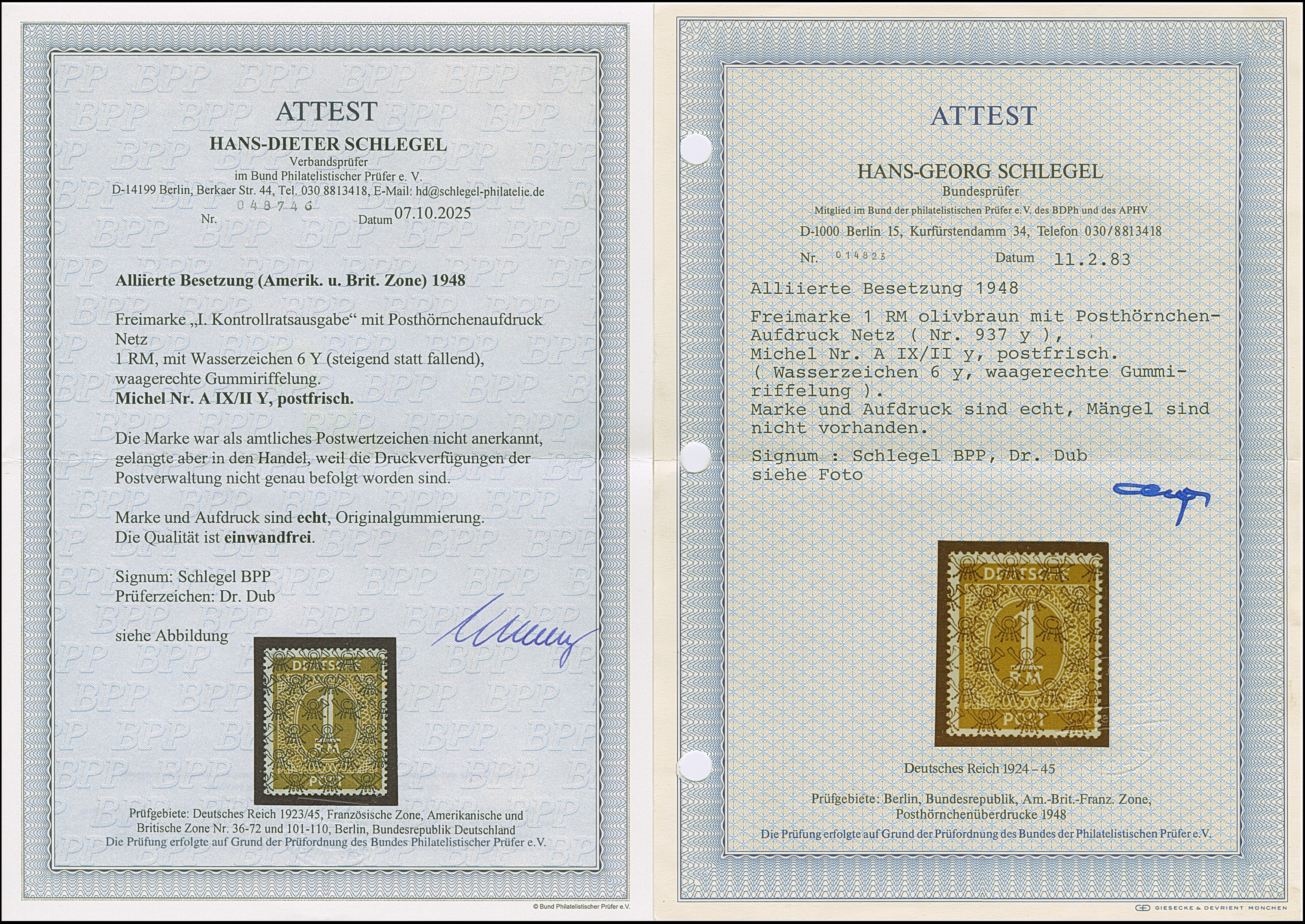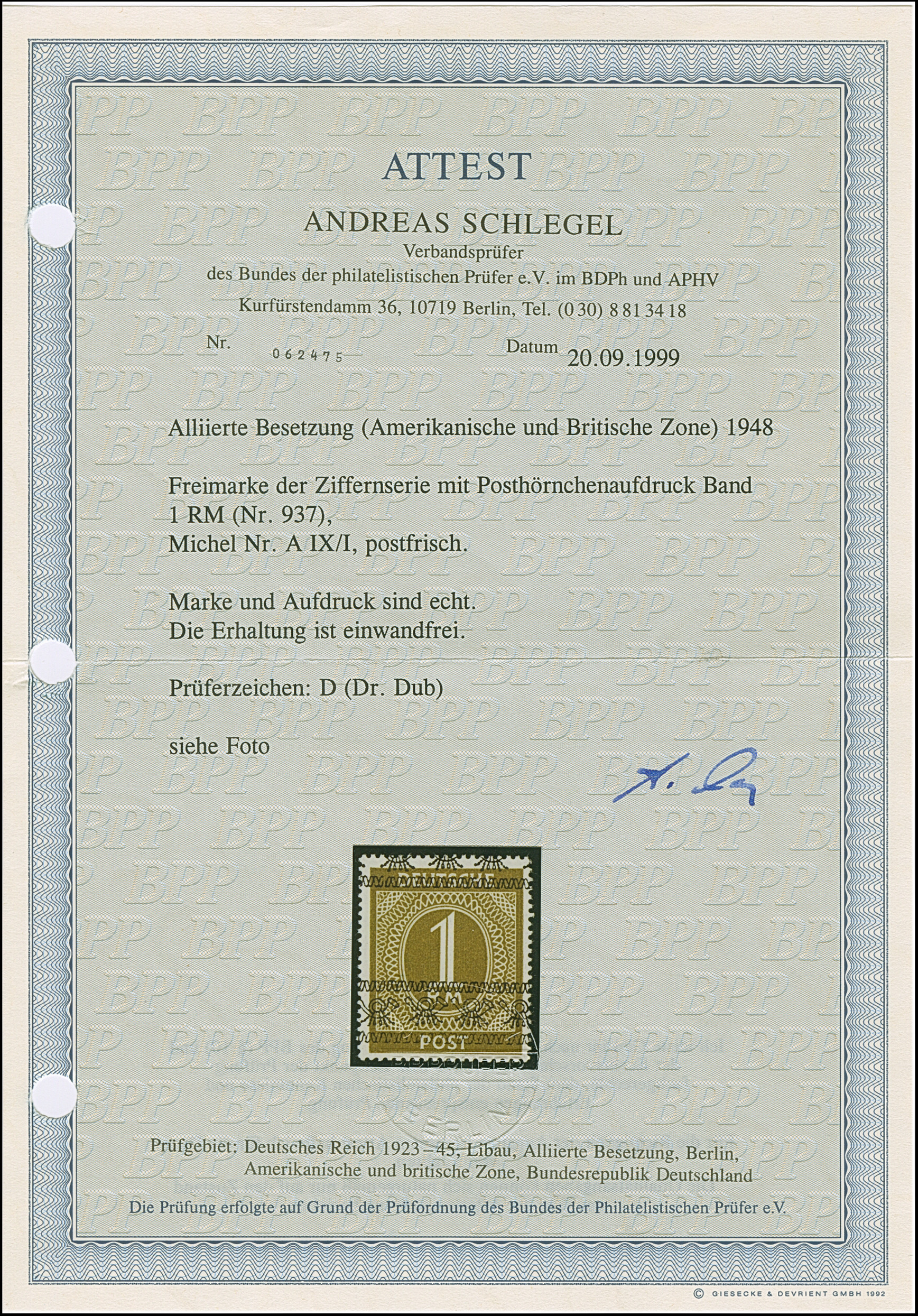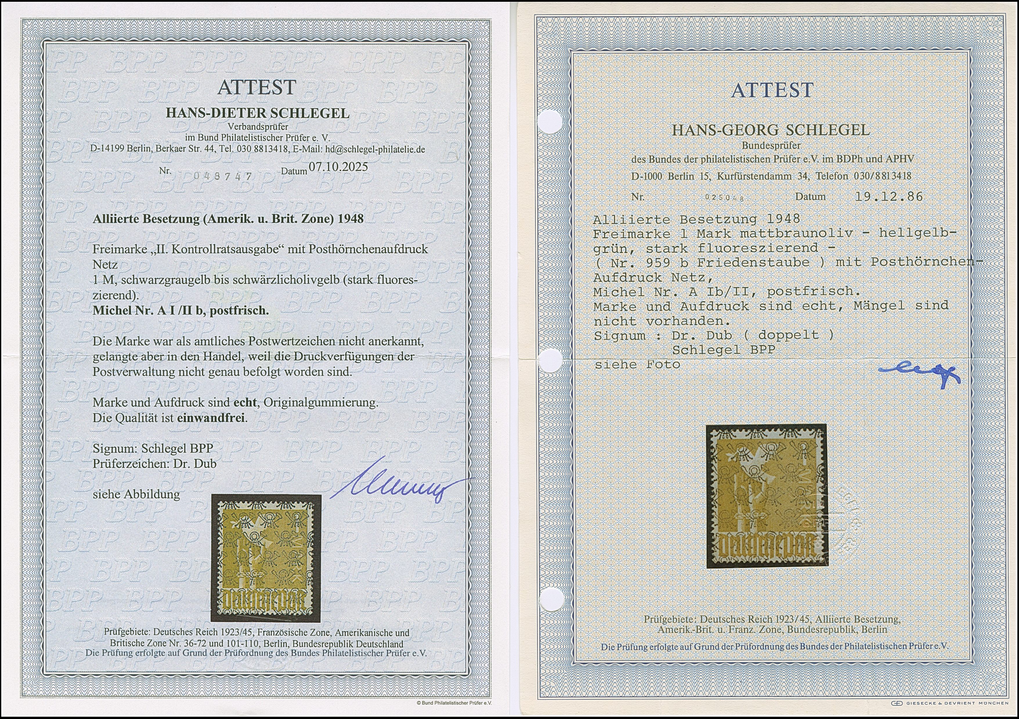 Nicht ausgegeben: 1948, Netz auf Taube 1 M. (stark fluoreszierend), postfrisch und in tadelloser Erhaltung, signiert Dr. Dub und Schlegel BPP mit Fotoattest (1986) sowie Fotoattest D. Schlegel BPP (2025)