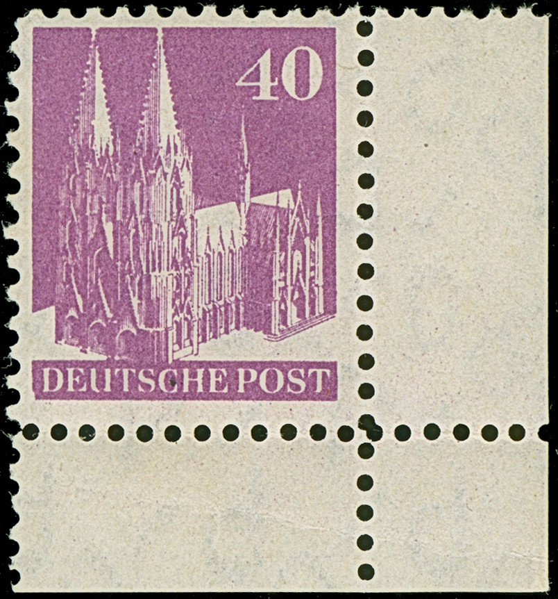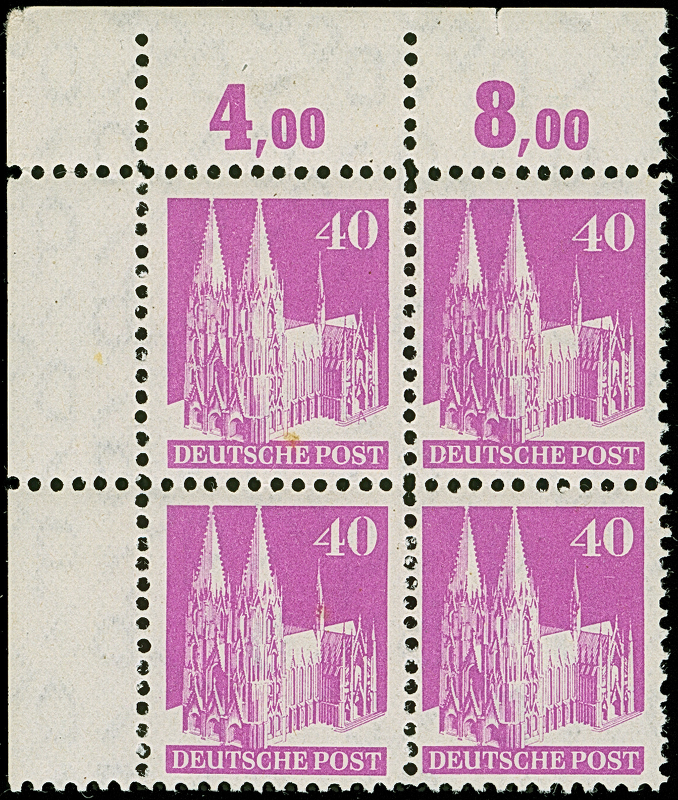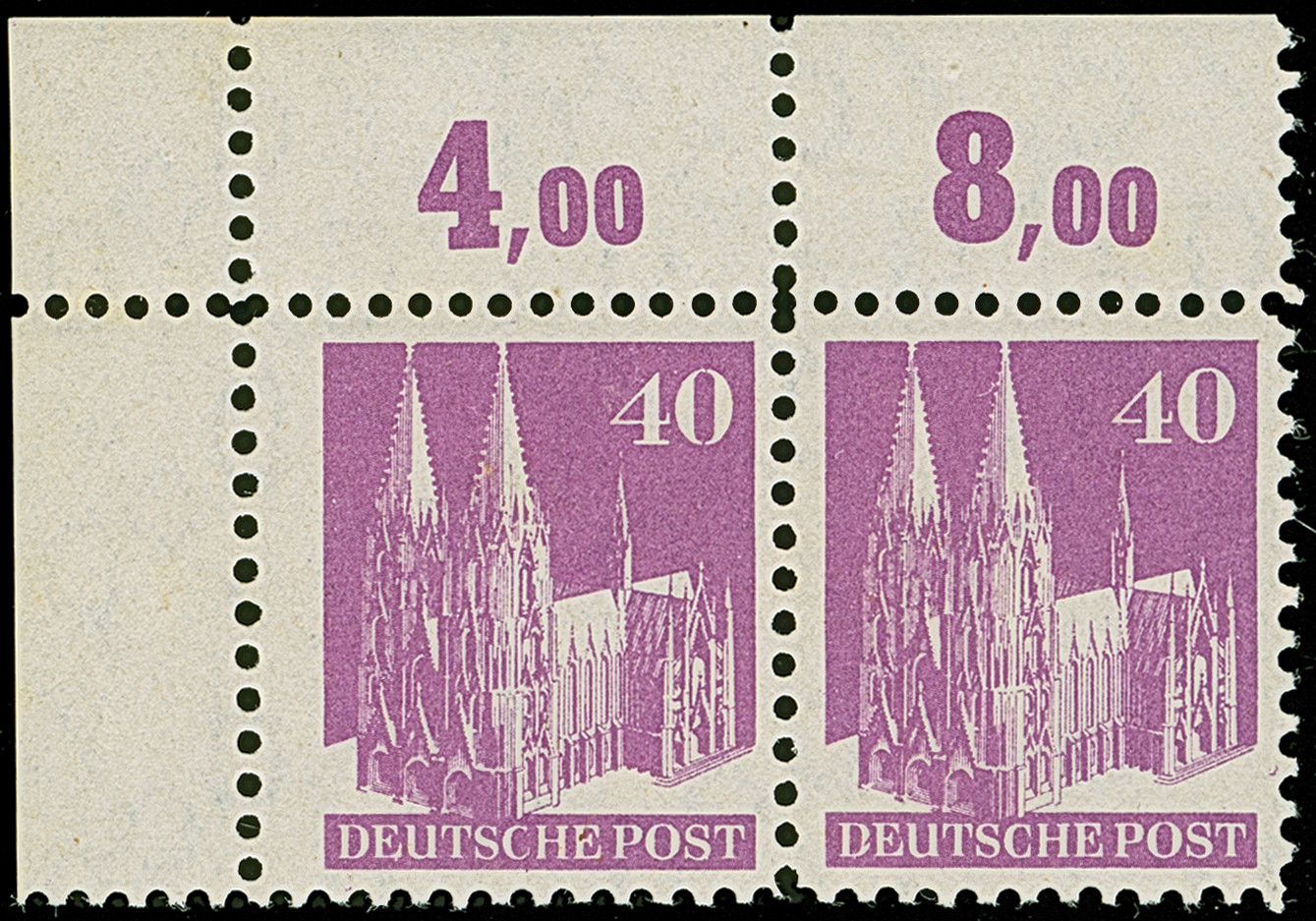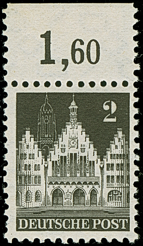 1948, Bauten 2 Pfg. gezähnt K 11¼ : 11 und Wasserzeichen 1 Z, Oberrandstück (Feld 308, mit Falzrest im Oberrand), die postfrische Marke einen verkürzten Zahn links bzw. rechts eine Zahnspitze mit winzigem Einriss, ansonsten in einwandfreier Erhaltung. Trotz der kleinen Einschränkungen eine in postfrischer Erhaltung sehr seltene Marke