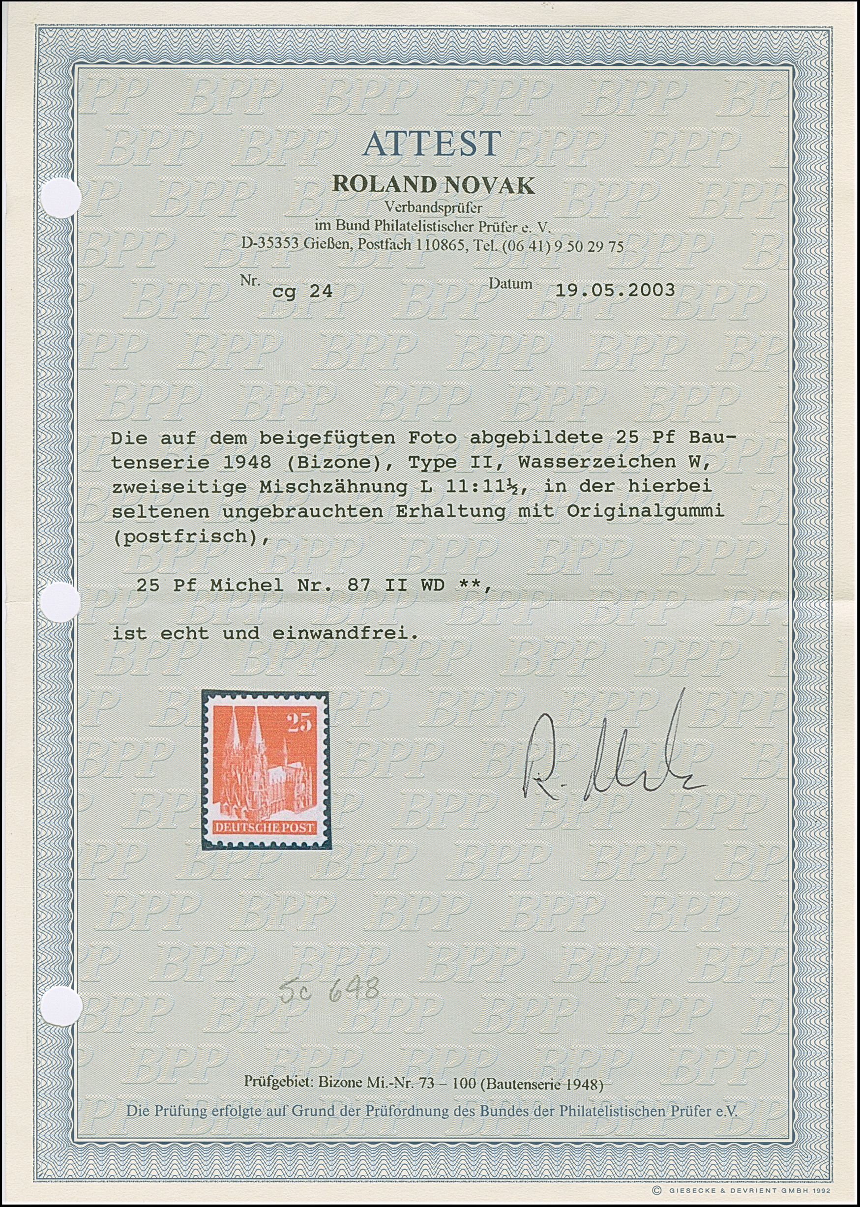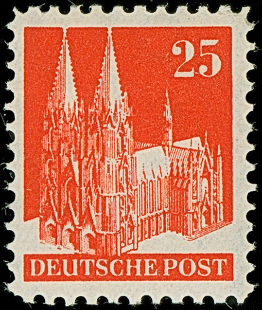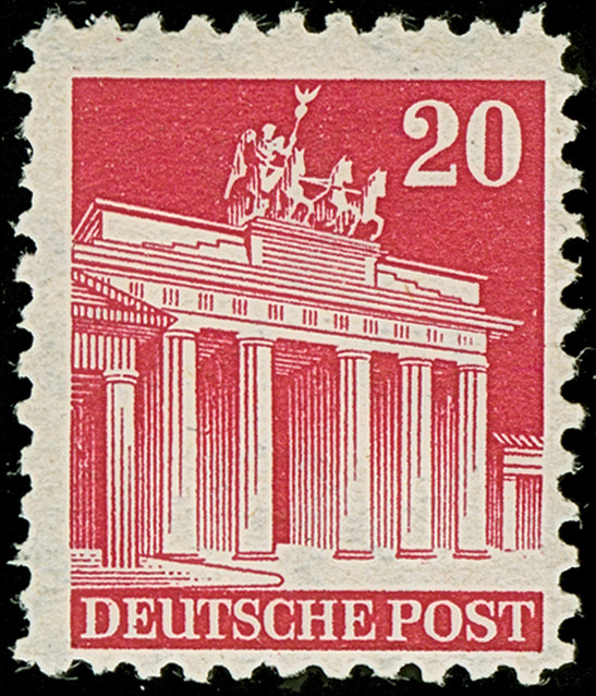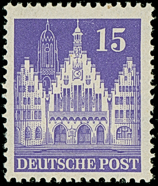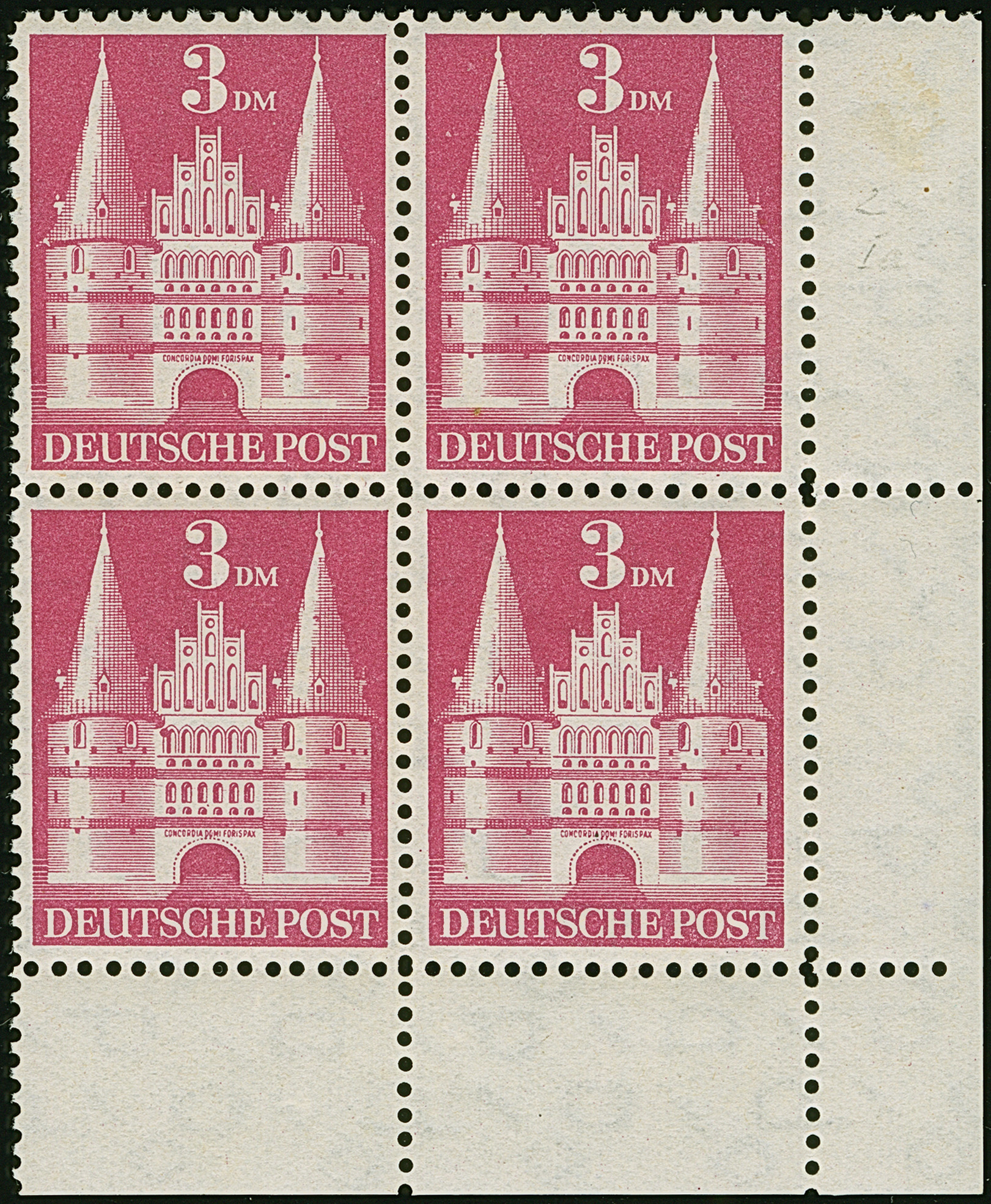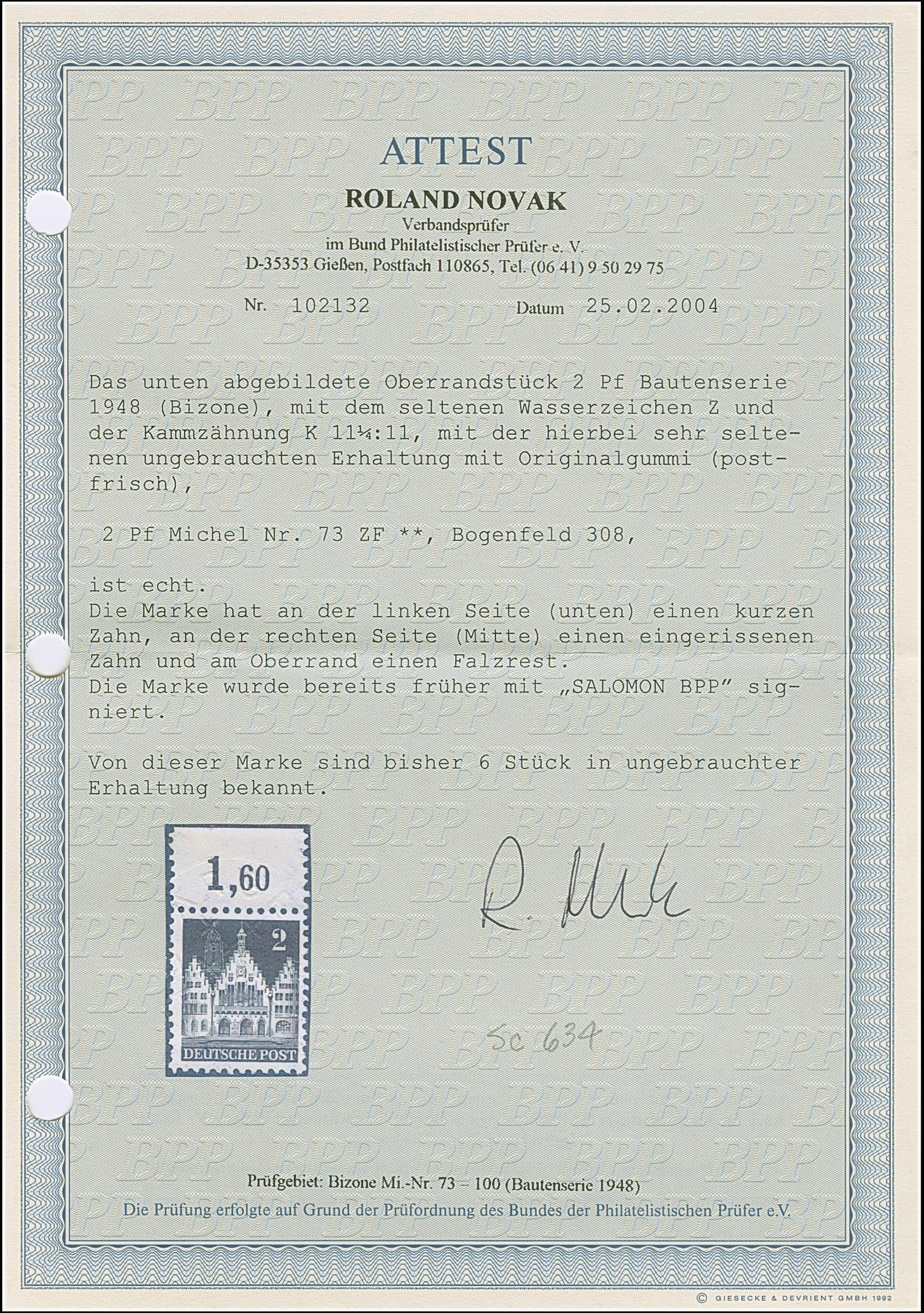 1948, Bauten 2 Pfg. gezähnt K 11¼ : 11 und Wasserzeichen 1 Z, Oberrandstück (Feld 308, mit Falzrest im Oberrand), die postfrische Marke einen verkürzten Zahn links bzw. rechts eine Zahnspitze mit winzigem Einriss, ansonsten in einwandfreier Erhaltung. Trotz der kleinen Einschränkungen eine in postfrischer Erhaltung sehr seltene Marke