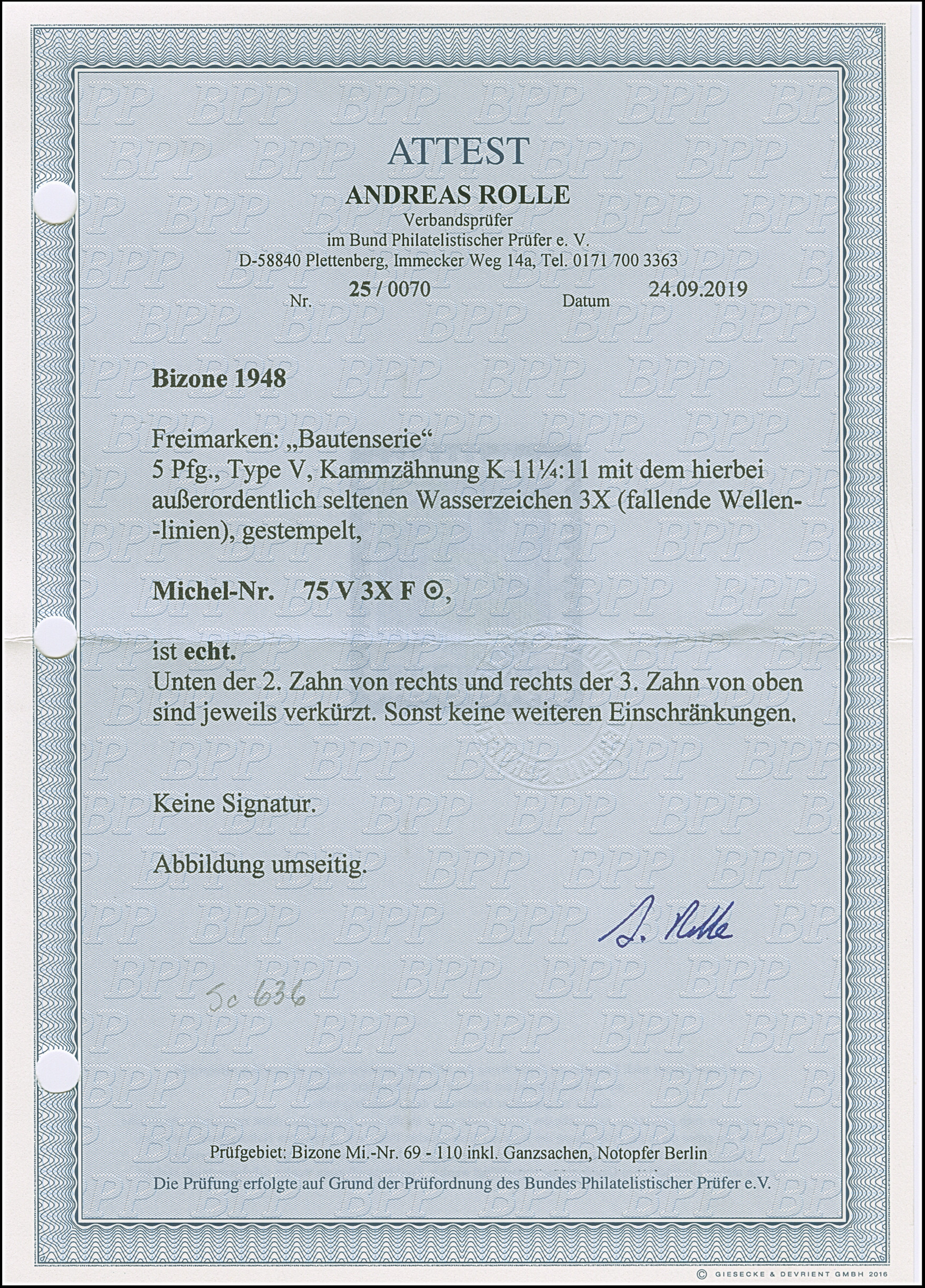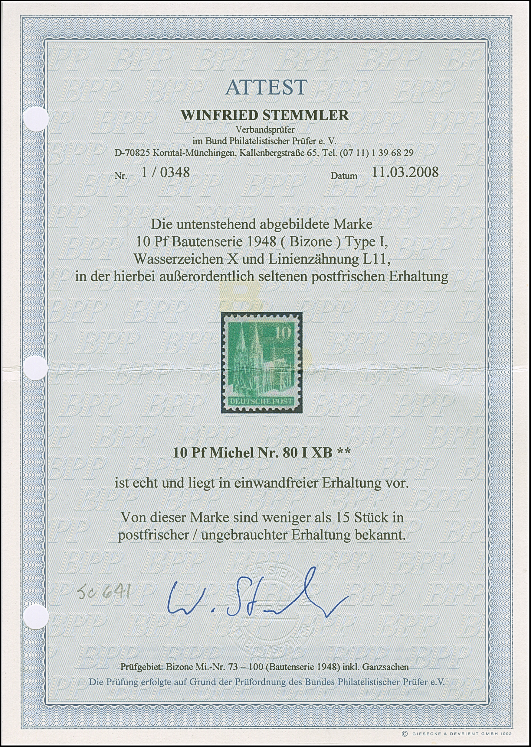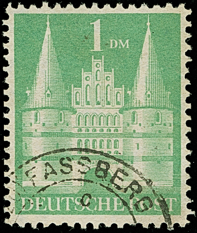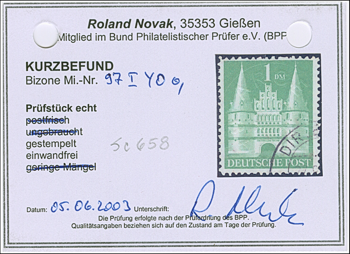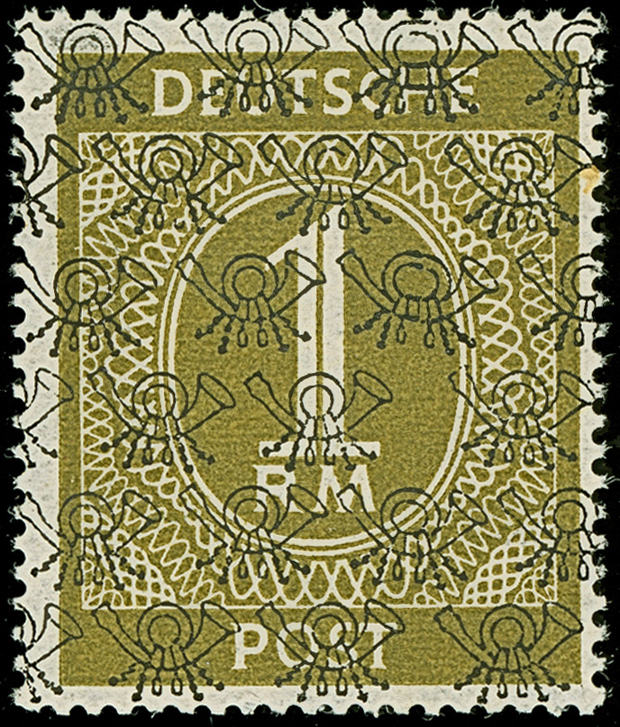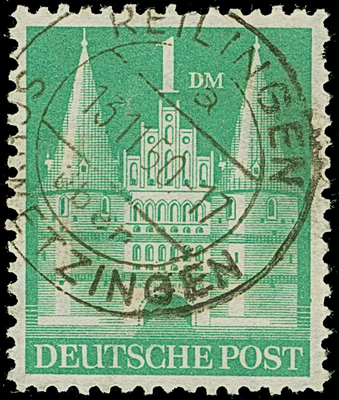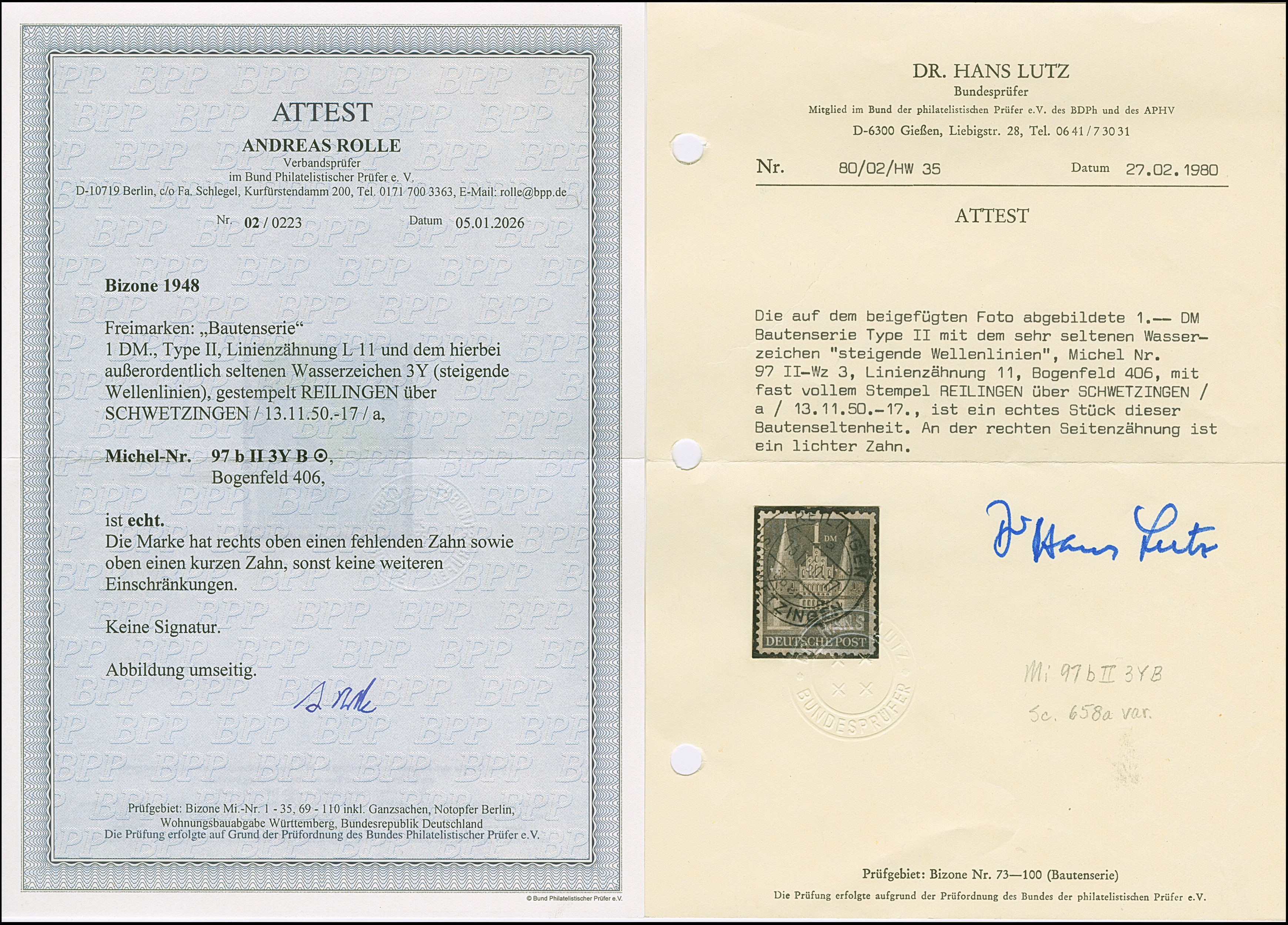1 M. mittelgelblichgrün, Type II, gezähnt L 11 und mit Wasserzeichen “steigende Wellenlinien” (WZ. 3Y), sehr sauber mit Stempel “REILINGEN über SCHWETZINGEN 13.11.50” entwertet. In der Zähnung fehlt rechts oben ein Zahn und oben hat die Marke einen kurzen Zahn, ansonsten in einwandfreier Erhaltung. Fast alle Marken mit dieser Wasserzeichen-Abart haben kleine Fehler bzw. sind fehlerhaft. Ein optisch ansprechendes Exemplar mit sehr schöner Entwertung, Fotoattest Rolle BPP (2026)