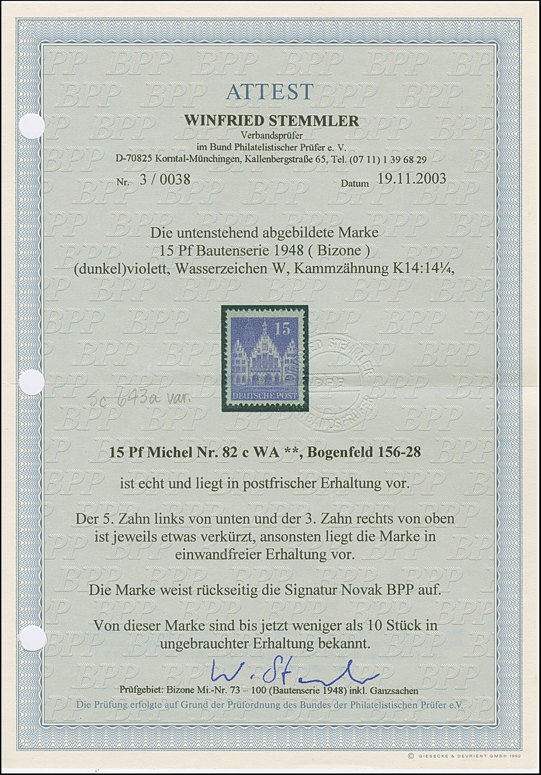 15 Pfg. (dunkel)violett, gezähnt K 14 : 14¼ und Wasserzeichen 1W, postfrisch mit zwei leicht verkürzten Zähnen rechts oben, ansonsten in einwandfreier Erhaltung. Eine sehr seltene Farbe, bisher sind nur ganz wenige postfrische Exemplare bekannt, signiert Novak BPP und Fotoattest Stemmler BPP (2003)