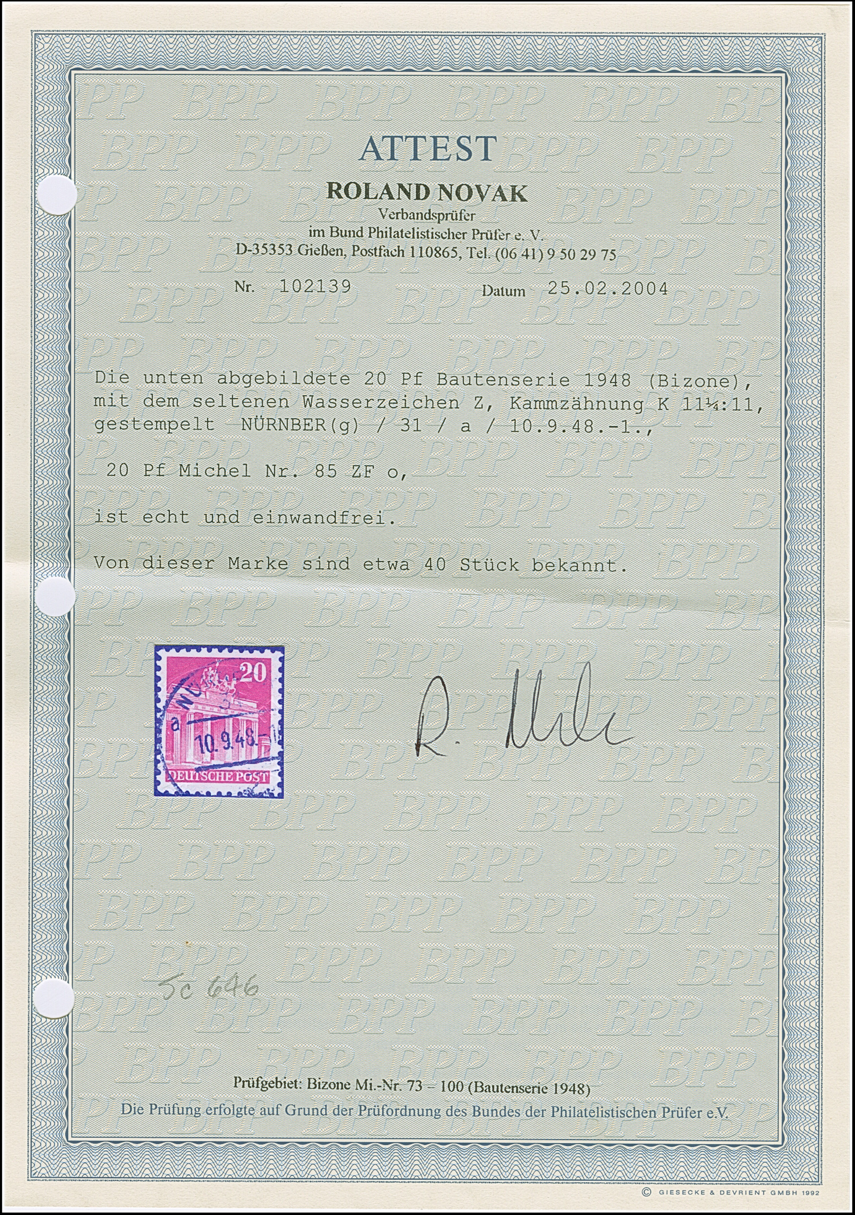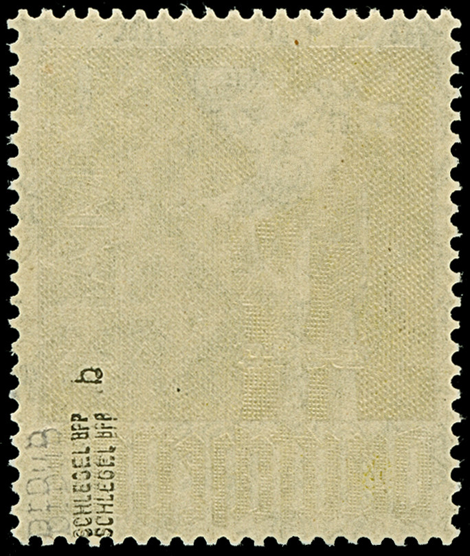 Nicht ausgegeben: 1948, Netz auf Ziffer mit Wasserzeichen “steigend statt fallend” (6Y) und waagerechter Gummiriffelung, postfrisch und in tadelloser Erhaltung. Ein schönes Exemplar dieser nicht häufigen Marke, signiert Dr. Dub und Schlegel BPP mit Fotoattest (1983) sowie Fotoattest D. Schlegel BPP (2025)