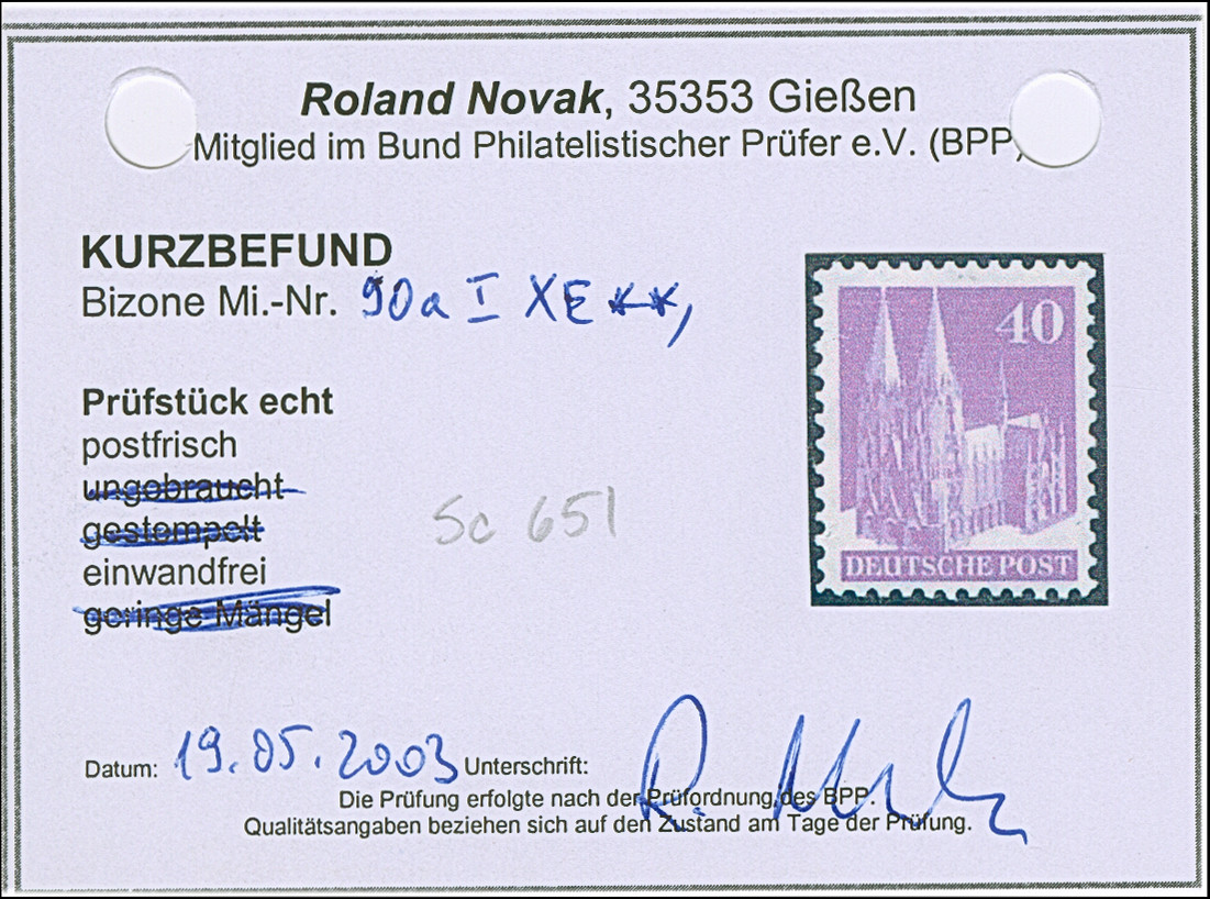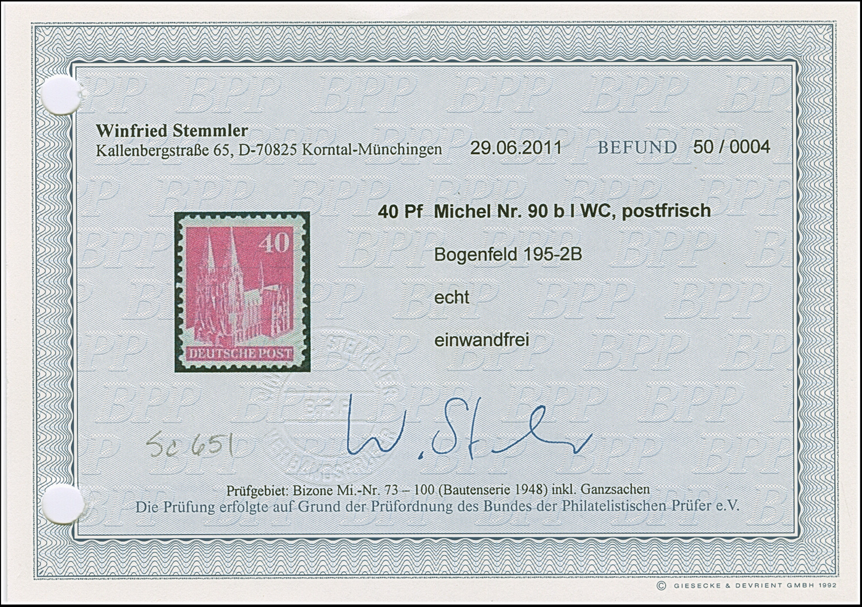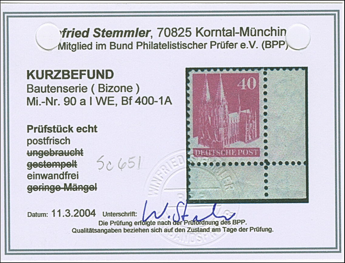 40 Pfg. mittelviolettpurpur, Type I, gezähnt L 11½ : 11 und Wasserzeichen 1W aus der rechten unteren Bogenecke (Bogenfeld 400-1A). Die postfrische Marke ist in tadelloser Erhaltung, signiert Novak BPP und Kurzbefund Stemmler BPP (2004)