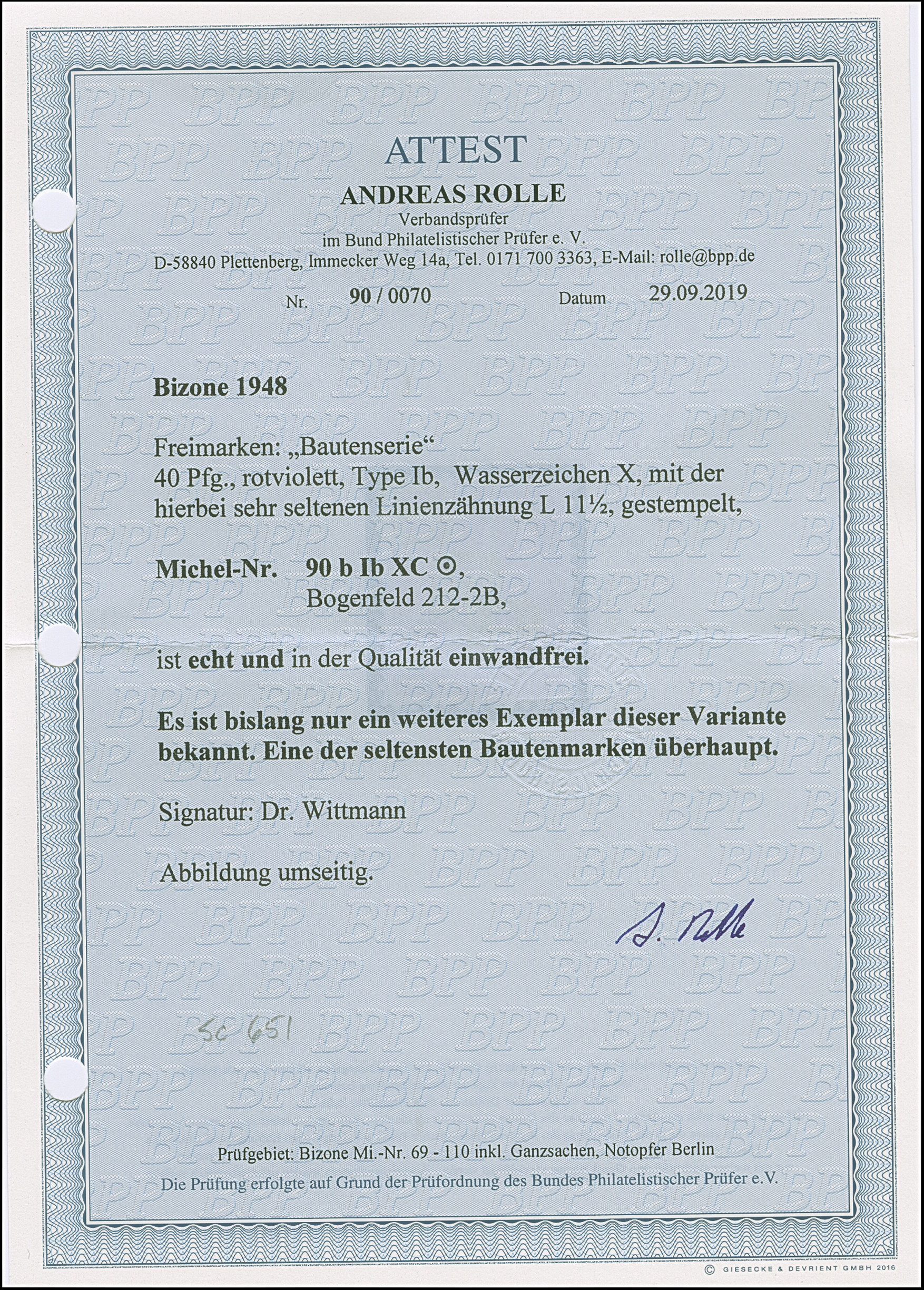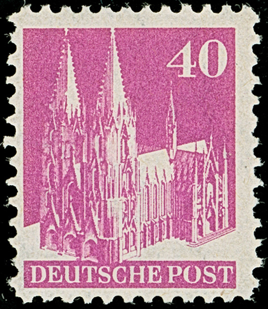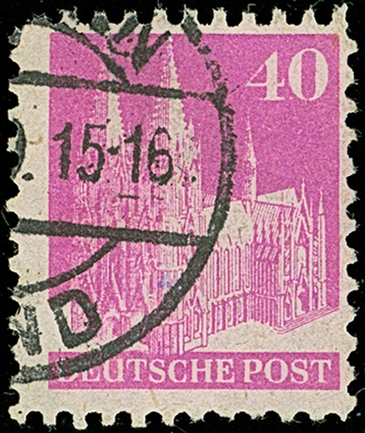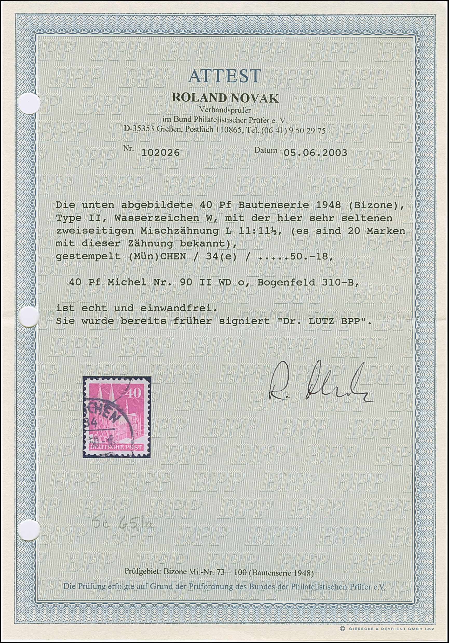 40 Pfg. rotviolett, Type Ib, gezähnt L 11½ und mit Wasserzeichen 1X (Bogenfeld 212-2B), sauber gestempelt und in tadelloser Erhaltung. Diese Variante ist eine der ganz großen Bauten-Seltenheiten, bisher ist nur ein weiteres Exemplar registriert, signiert Dr. Wittmann und Fotoattest Rolle BPP (2019)